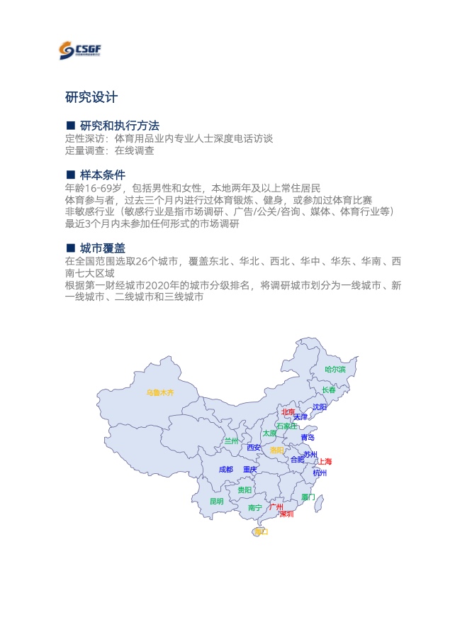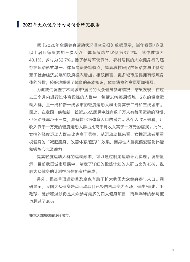 《报告》结合我国城市经济和体育产业发展情况,在一至三线城市中选取国内26个具有代表意义的城市,对中高收入、具备一定锻炼习惯且每年有一定体育消费等特征受访者的运动行为、消费习惯和健身器材市场发展情况进行调研,调研时间为2021年11月-2022年1月。值得一提的是,《报告》还将调研结果与宏观数据、往年数据进行对比,全面而深入地分析了这类人群的习惯、消费偏好与场地器材使用的综合情况,进一步探讨我国大众运动行业的社会经济价值与变化趋势,从宏观和微观层面给行业以数据指引,为政府有关部门体育消费普查数据提供有益补充。
