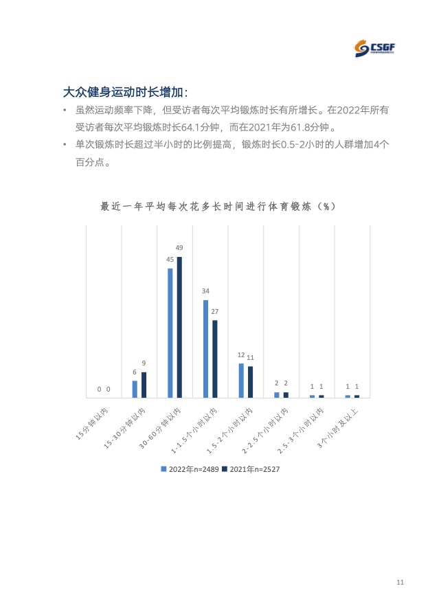 《报告》调研显示,运动参与人群与去年同期相比有小幅上涨,2022年每周锻炼1-2次及以上的运动人群合计占比为98%。运动频率上看,轻度运动人群则呈现出显著增加的趋势,相应每周锻炼5次以上的人群减少。虽然运动频率下降,但调研显示每次锻炼时长由2021年的61.8分钟增长至64.1分钟。热点运动项目调研显示,跑步、健步/健走、羽毛球、游泳、乒乓球是大众参与最多的五大运动项目。