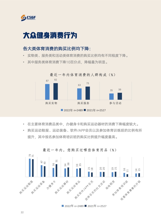 消费层面,2022年人均运动消费为4709元,相比于2021年下降16.9%,这种趋势普遍体现在各城市层、年龄层和收入阶层中。从消费类型来看,受到线下场景波动的影响,实物、服务和活动消费的比例均有不同程度下降,其中体育服务相关客户流失最为明显。但与此同时,运动鞋服、器材消费呈现增加趋势增加,尤其是瑜伽、游泳和球类用品广受欢迎,而羽毛球和跑步机品类均成为爆款。