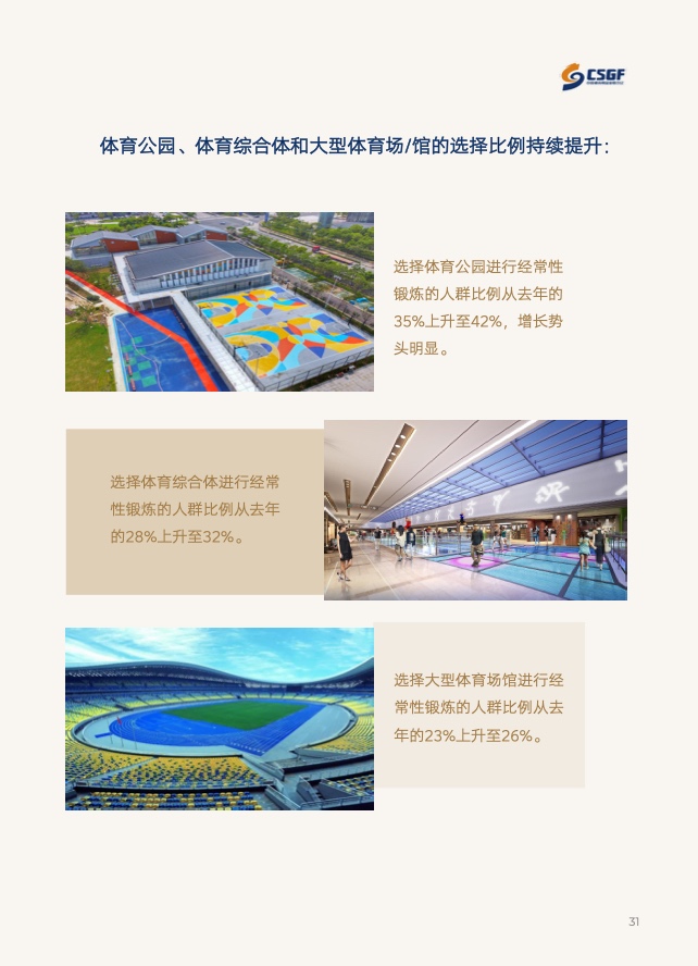 在运动场景选择上,社区全民健身中心、体育公园、体育综合体和大型体育场馆等专业体育锻炼场景使用比例上升,社区全民健身中心等免费或低收费场景的利用率显著提高。