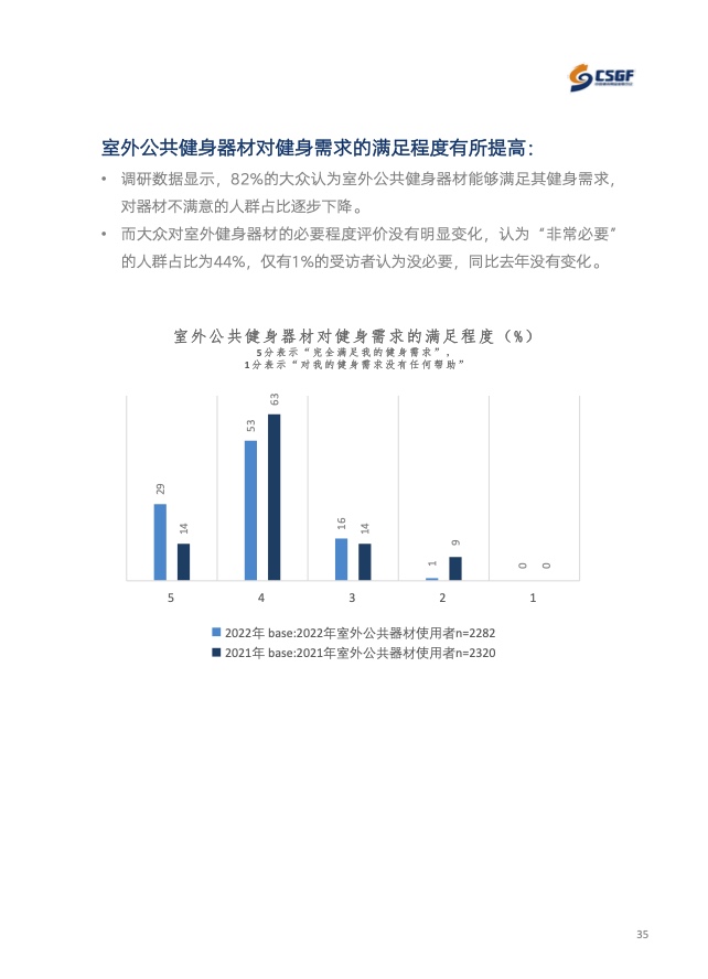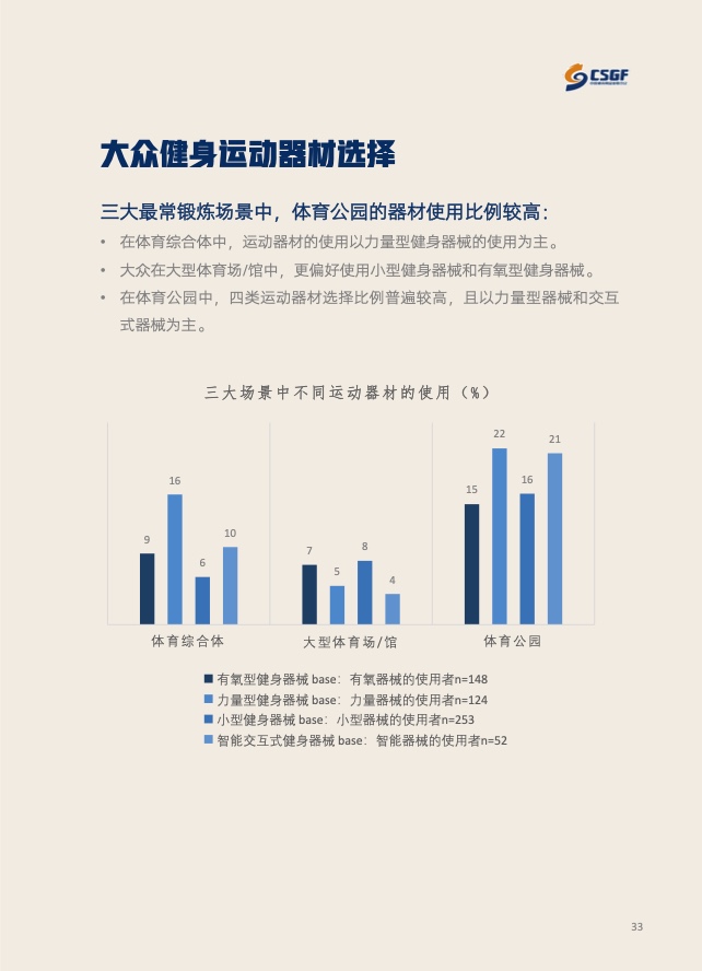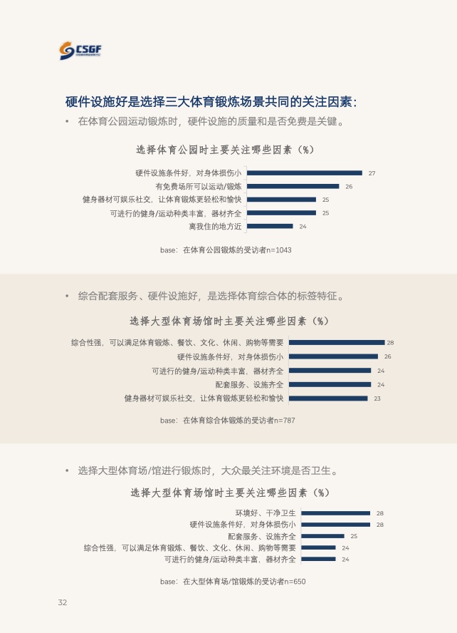 值得一提的是,选择体育公园进行经常性锻炼的人群比例从去年的35%上升至42%,增长势头明显,对于在此锻炼的运动人群而言,其硬件设施的质量和是否免费是关键。与此同时,体育公园的四类运动器材使用比例普遍偏高,从用户端说明过去一年我国公共体育设施建设增效显著。