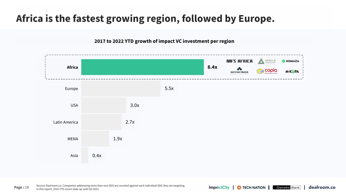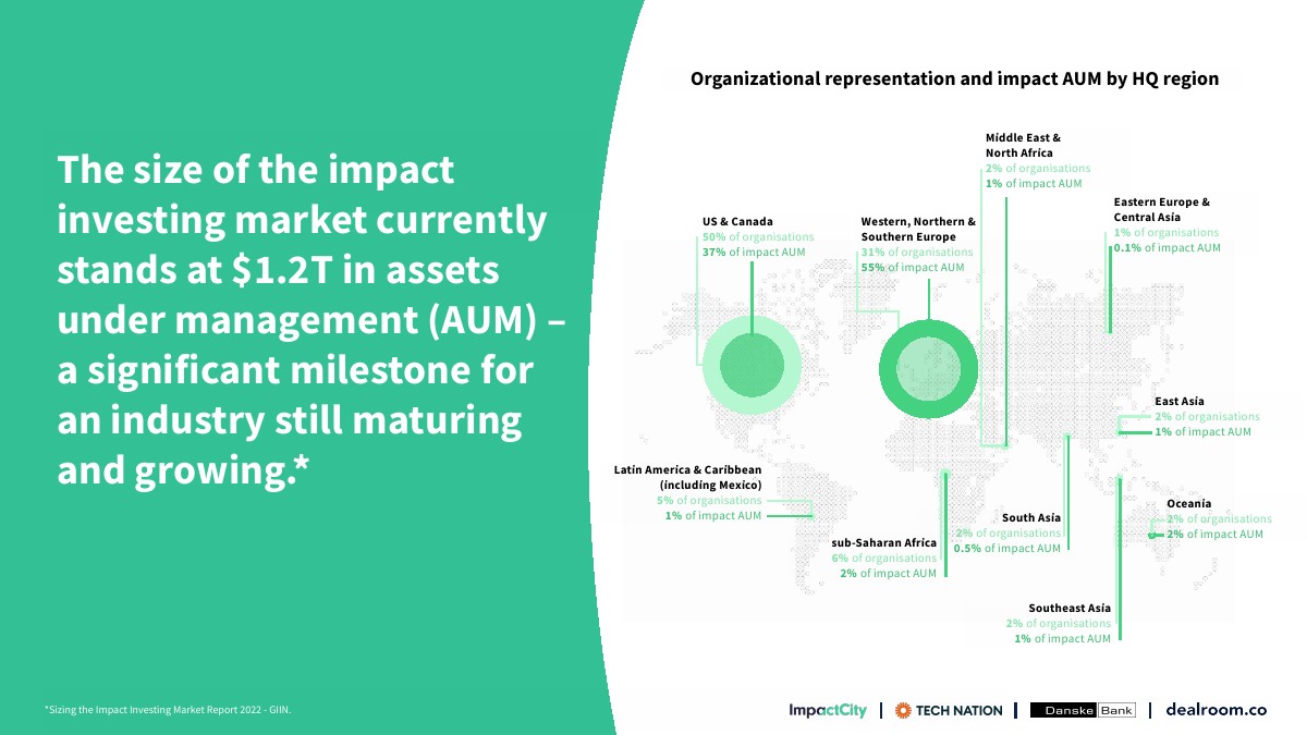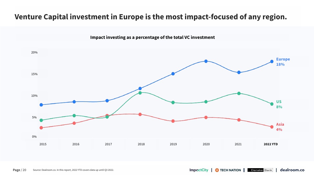 欧洲是影响力资金占比最高的地区,占风险投资总额的18%,其次是美国(8%)和亚洲(4%)。但是,与其他地区相比,美国吸引的影响力资金最多(690亿美元),高于欧洲投资(350亿美元)。