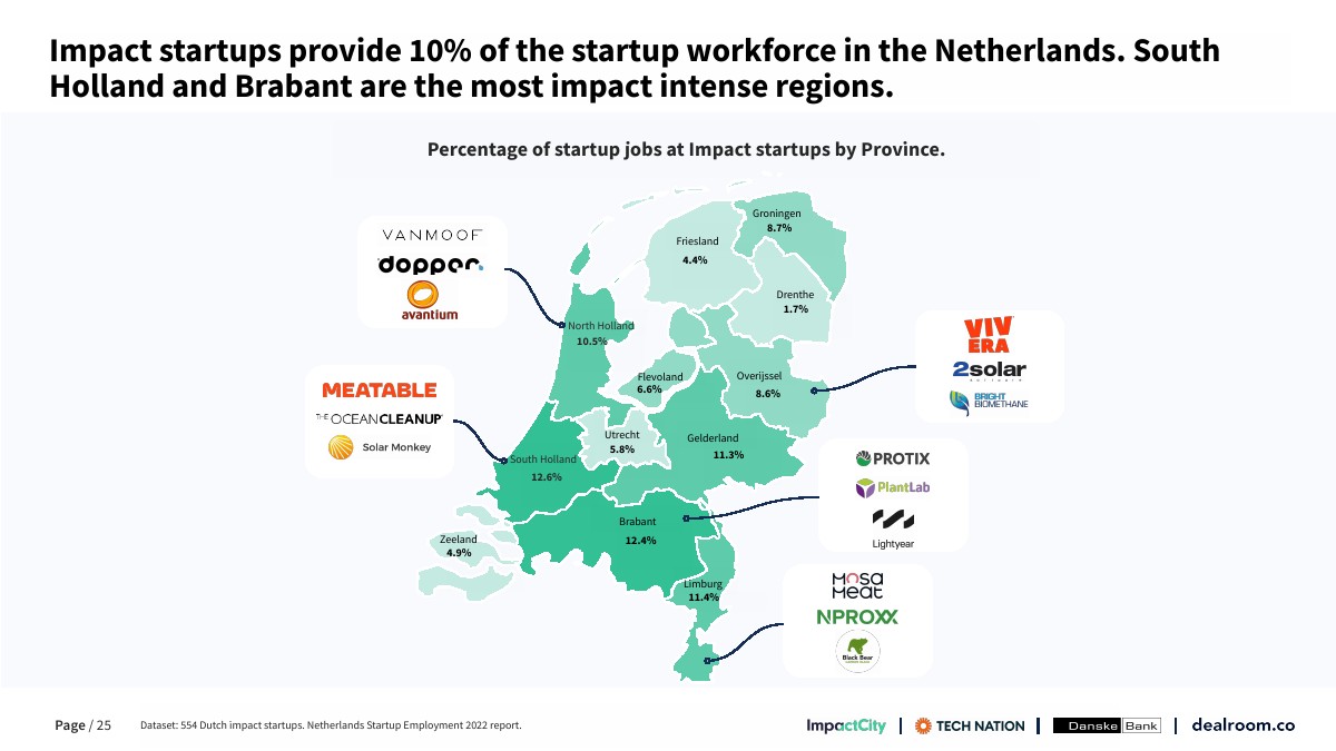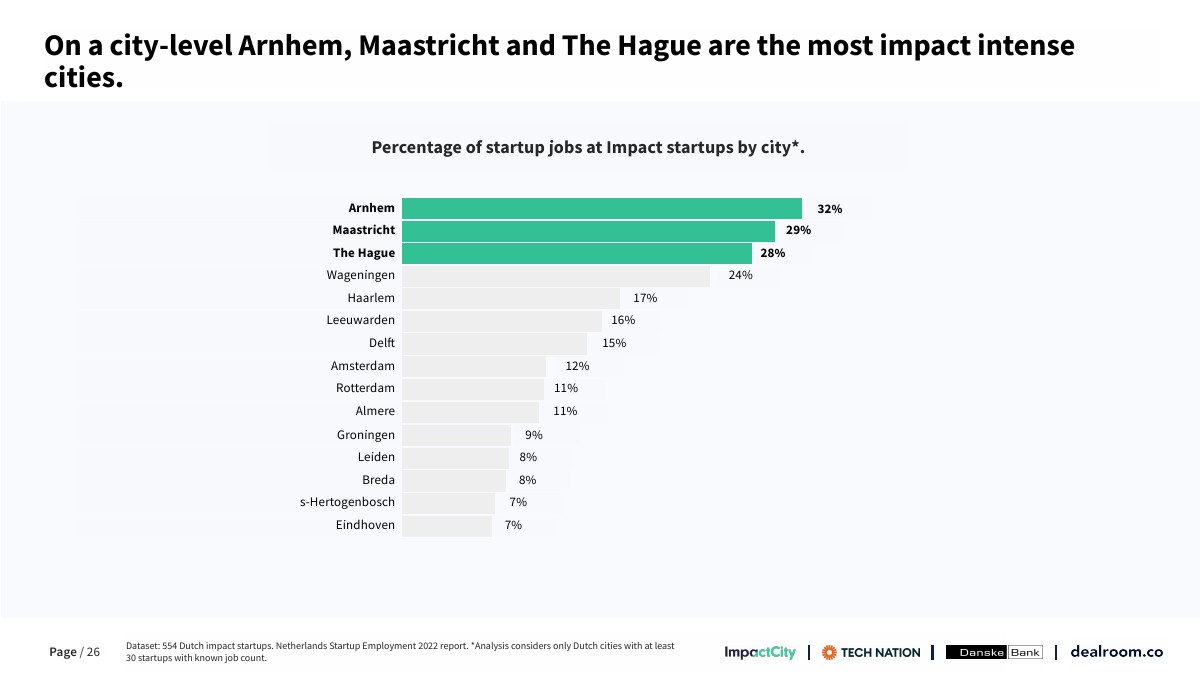 阿纳姆、马斯特里赫特和海牙是影响最强烈的城市。按城市影响力创业公司创造的工作占比计算,阿纳姆以32%领先,其次是马斯特里赫特(29%)和海牙(28%)。