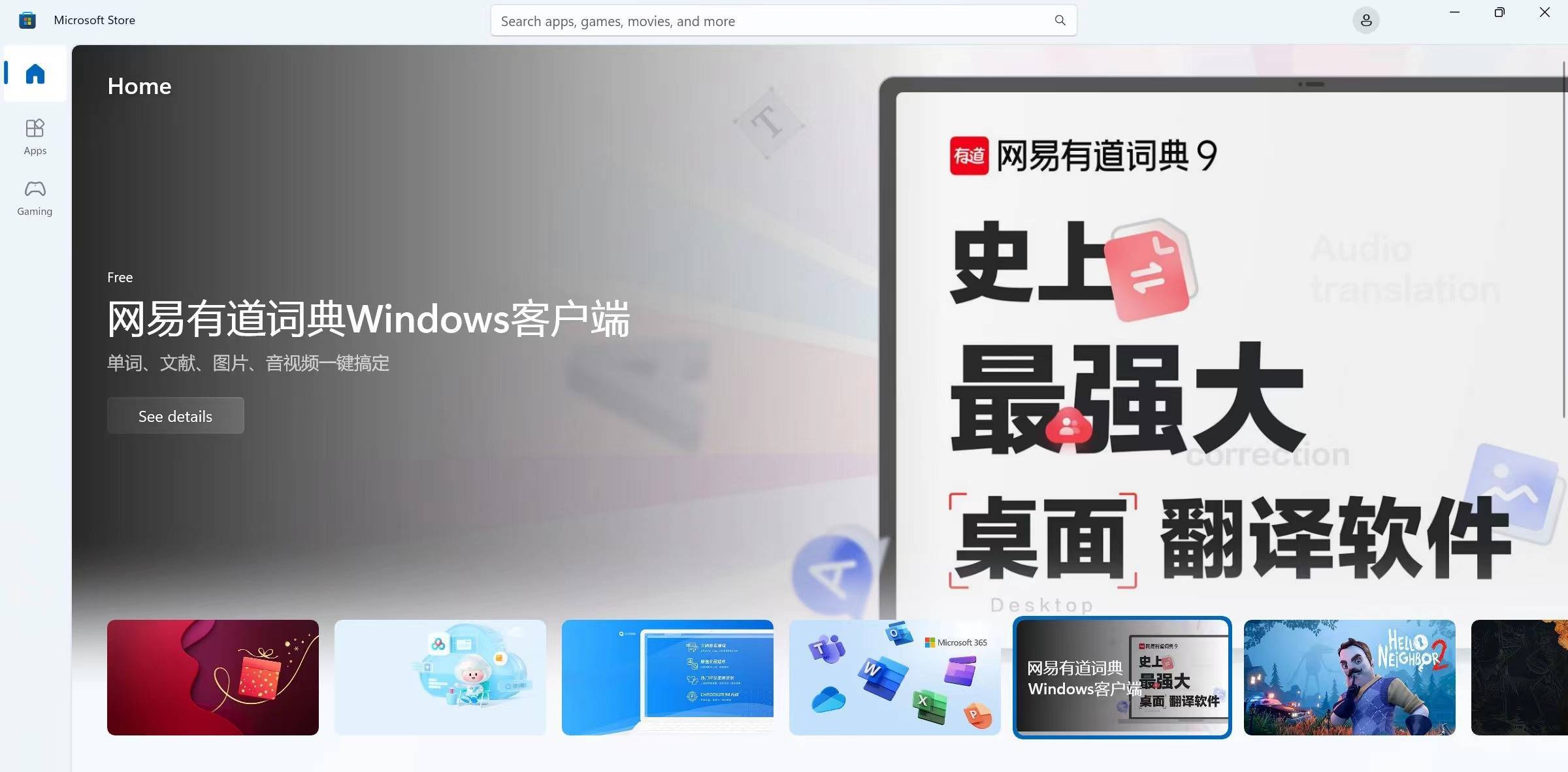 北京时间11月23日,网易有道词典正式上架微软应用商店并在主屏推荐。凭借微软数字分发平台的巨大流量,这款史上最强大的桌面翻译产品将帮助更多微软和有道词典的用户提升工作效率与生产力,满足世界各地学习者在多场景下的个性化学习需求。