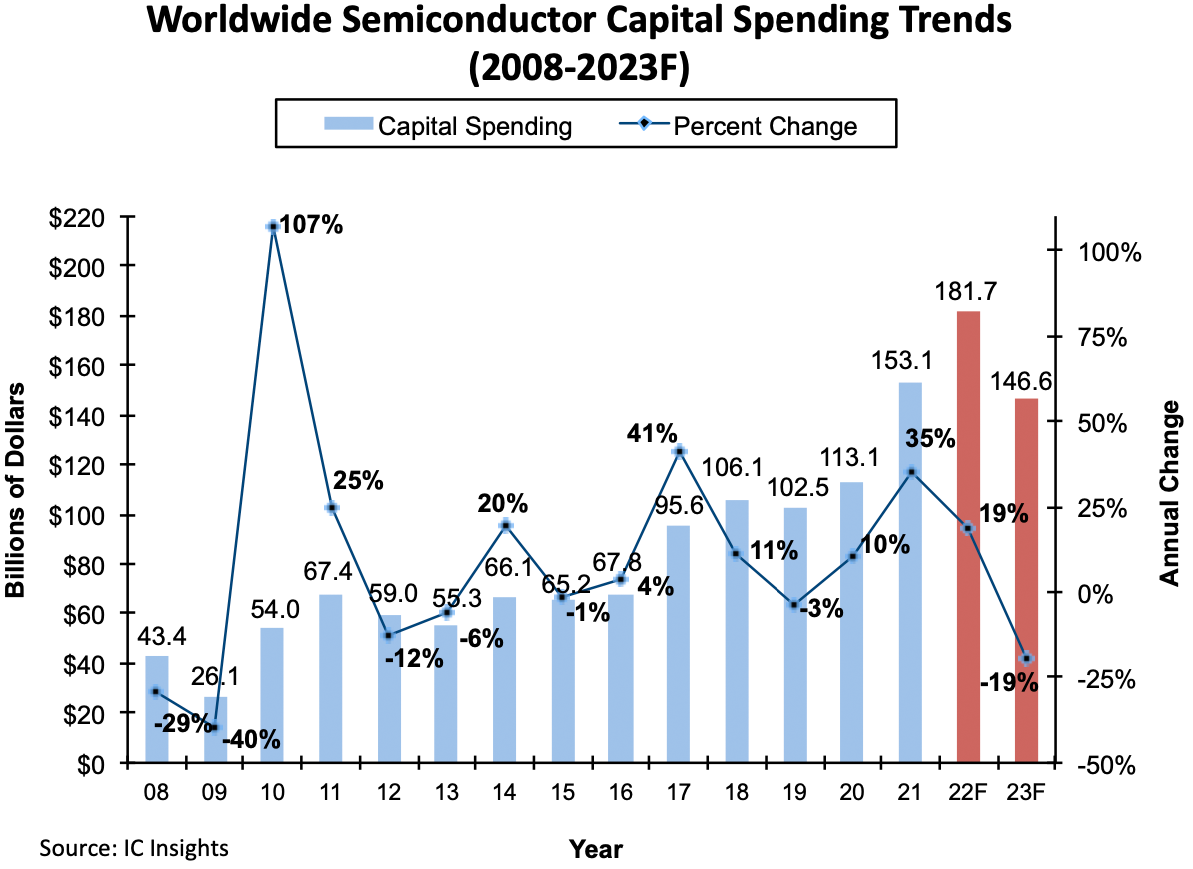 日前,统计机构IC Insights发布最新研报,预测明年全产业的资本支出将同比下滑19%,在1466亿美元左右。据悉,这是继2008~2009金融危机以来的最大降幅,当时的降幅一度高达40%。