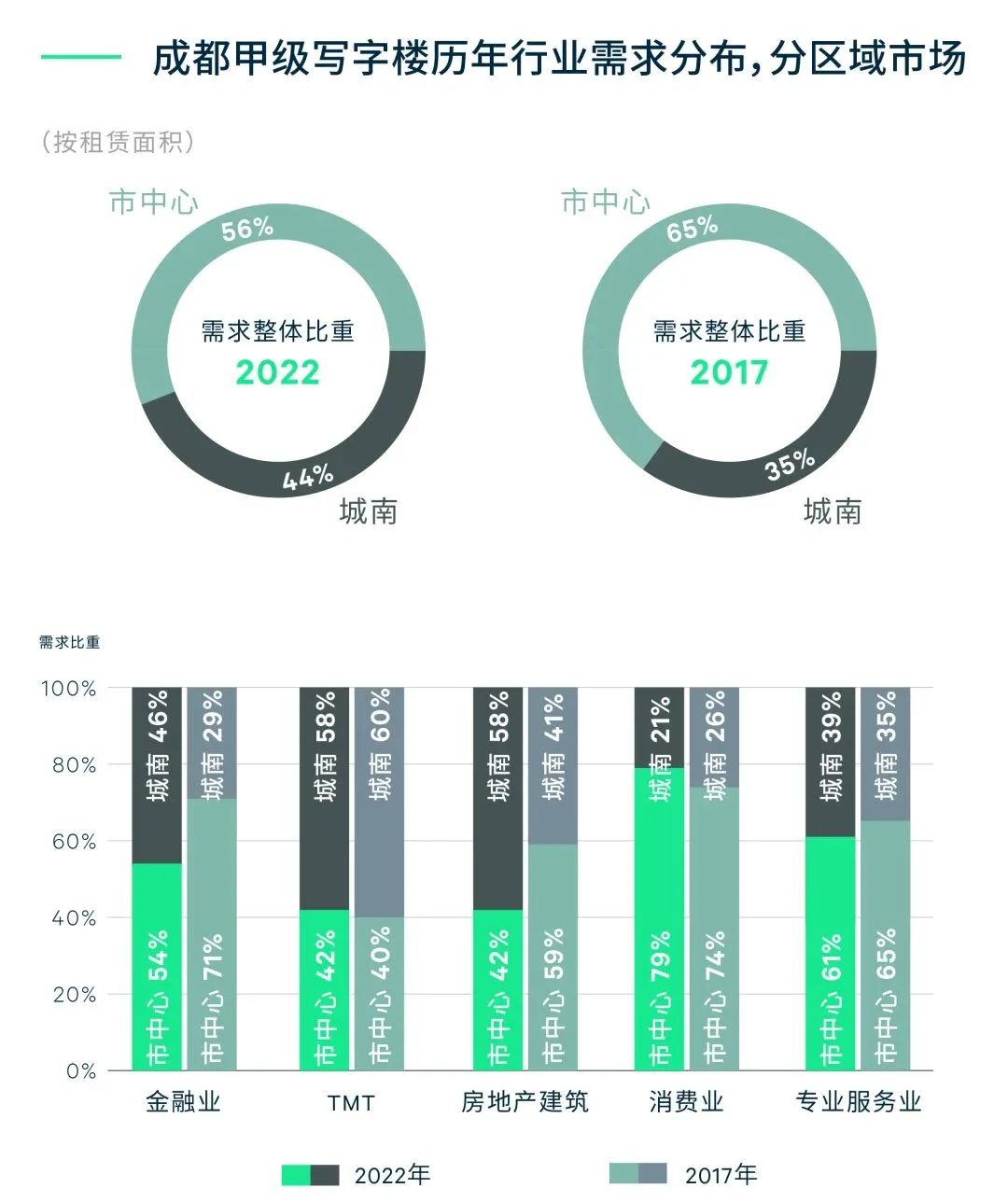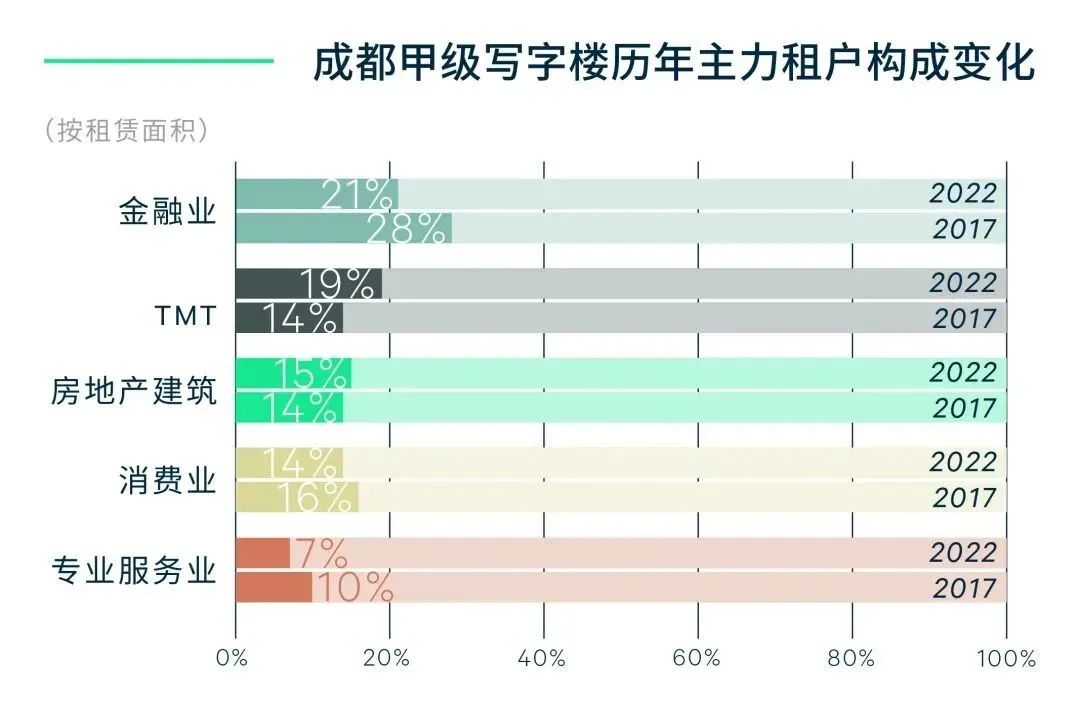 金融业的需求规模有所减少,主要是源于非传统金融业的需求占比较2017年下降6%。房地产建筑方面,尽管近年来行业调整导致传统房地产开发商的办公面积出现一定收缩,但成渝双城经济圈和公园城市建设的双重机遇之下,城镇化进程积极推进,基建工程类企业扩张势头不减,致使房地产建筑的需求占比较2017年仍上升1个百分点至15%。