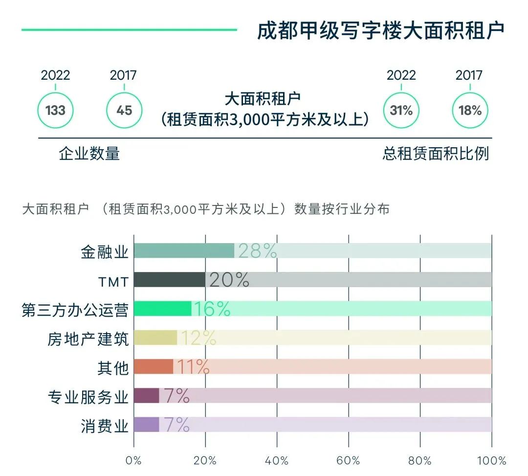 成都谋求高质量发展新支点,塑造总部经济新格局,而不断发展的写字楼市场规模与质量为这一聚势提供了土壤。一方面,更多头部企业在蓉布局,设立区域型总部;另一方面,积极培育本土企业,逐步形成总部效应。普查数据显示,面积需求在3,000平方米及以上的大面积租户数量成倍增长,从2017年的45家增长至2022年的133家,其所租用的办公面积在整体需求中的占比也相应地扩大,上升13个百分点至31%。从行业端看,金融业和TMT主导大面积段需求,分别占比28%和20%。