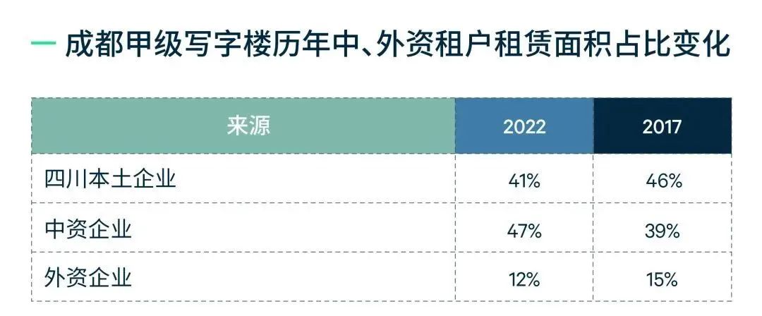 “十四五”期间,成都积极打造全国重要的经济、科技、金融、文创、对外交往中心和国际综合交通通信枢纽,对外开放程度进一步提升,继而吸引更多优质企业来蓉发展。对比2017年,中资企业需求占比显著增长8个百分点,并首次超越四川本土企业。
