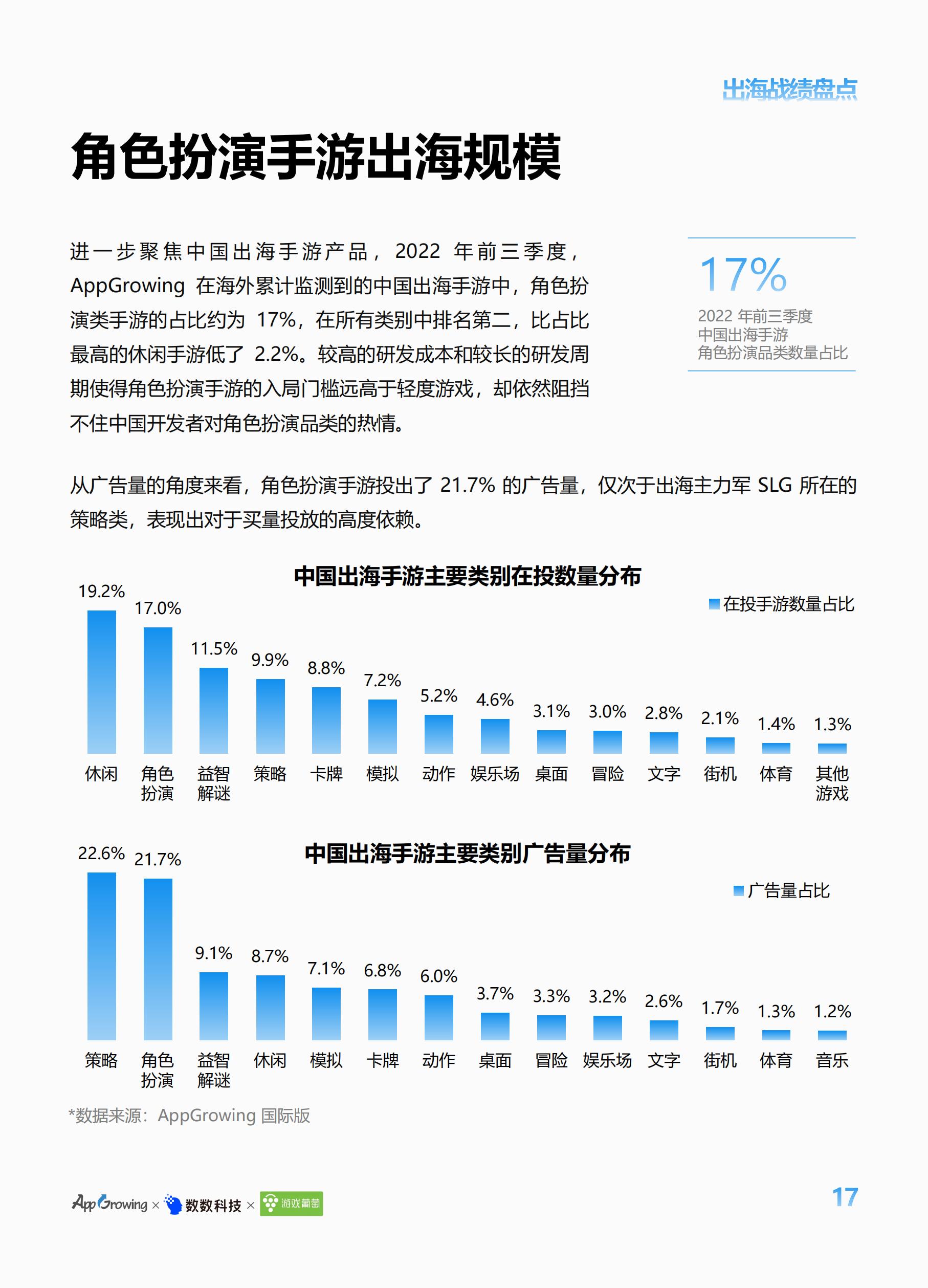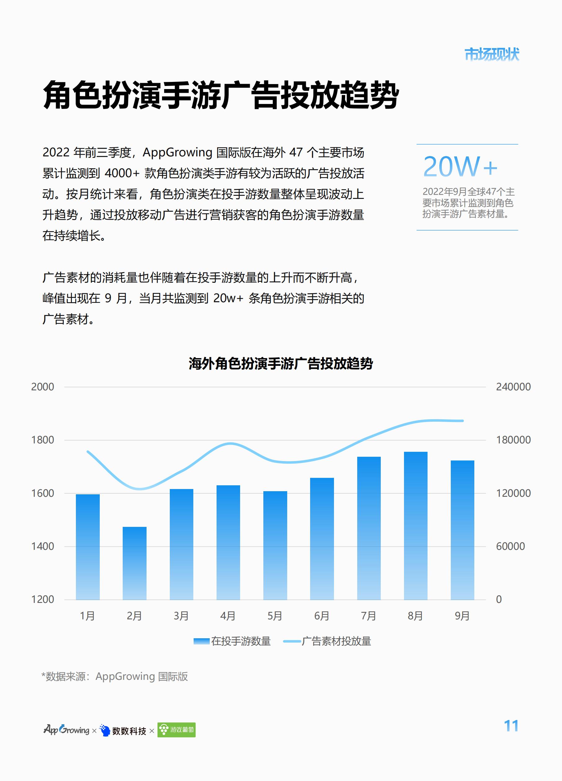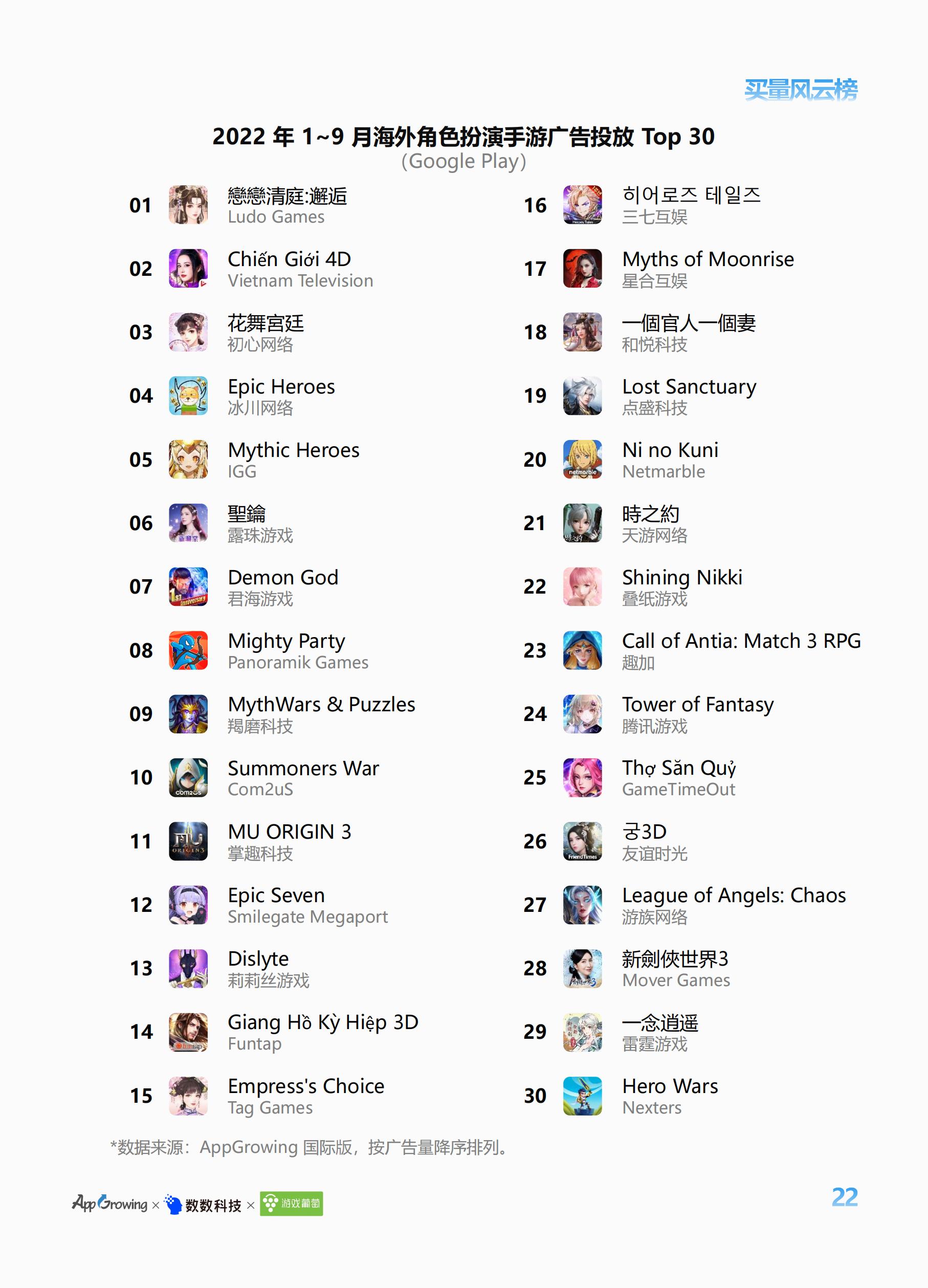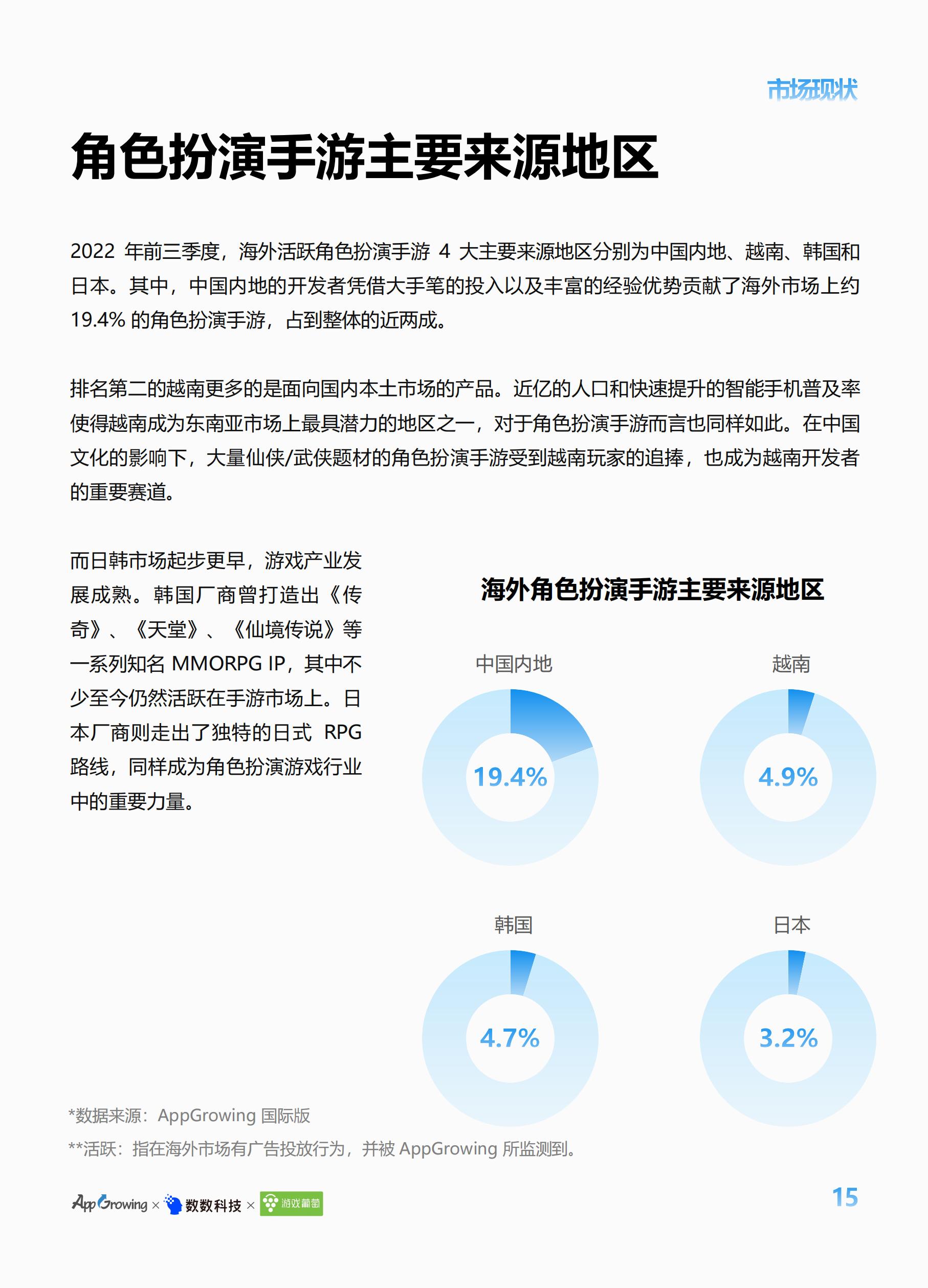 为了更全面地了解全球角色扮演手游市场变化,AppGrowing 联合数数科技、游戏葡萄发布《2022年中国角色扮演手游出海观察》,从市场现状、营销趋势、出海战绩、买量排行、成功案例等方面解读 2022 年角色扮演手游出海形势。