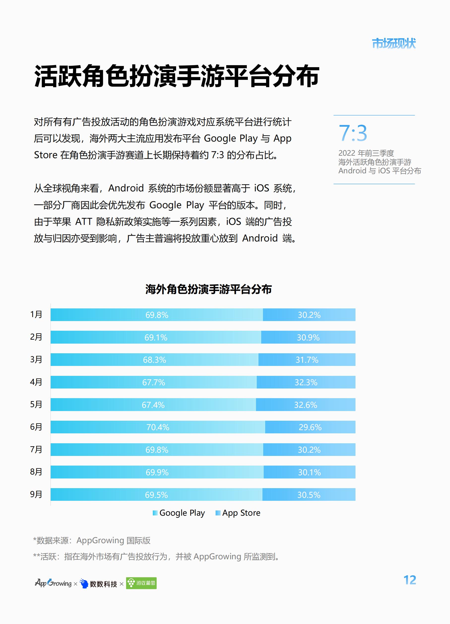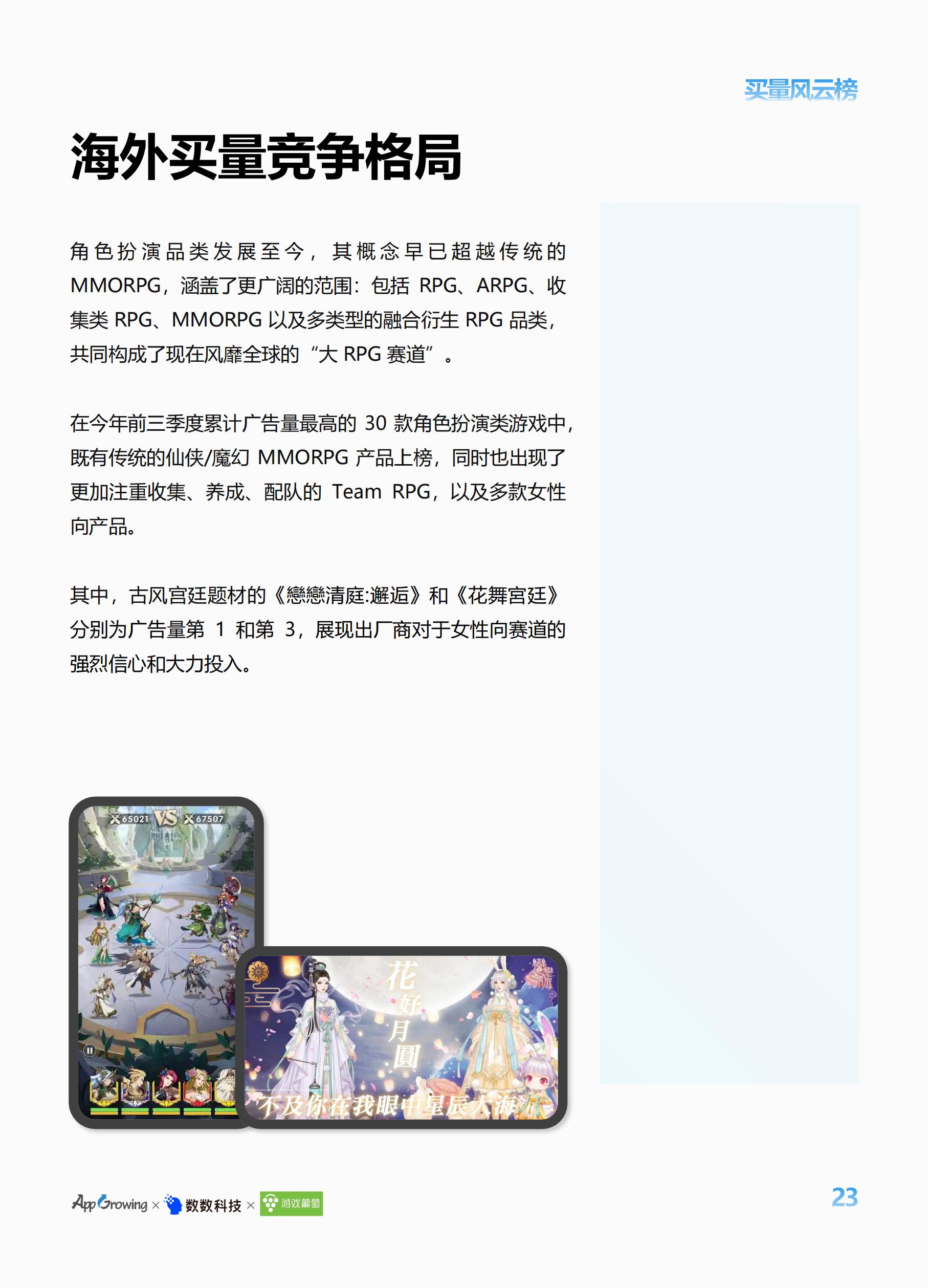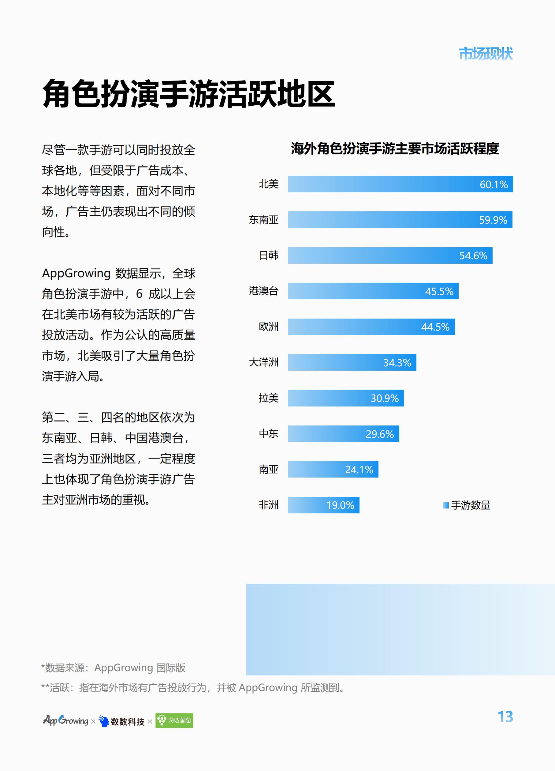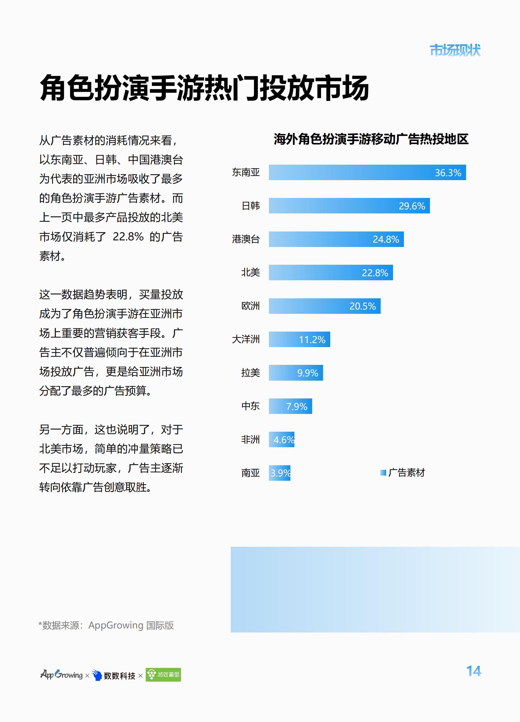 为了更全面地了解全球角色扮演手游市场变化,AppGrowing 联合数数科技、游戏葡萄发布《2022年中国角色扮演手游出海观察》,从市场现状、营销趋势、出海战绩、买量排行、成功案例等方面解读 2022 年角色扮演手游出海形势。