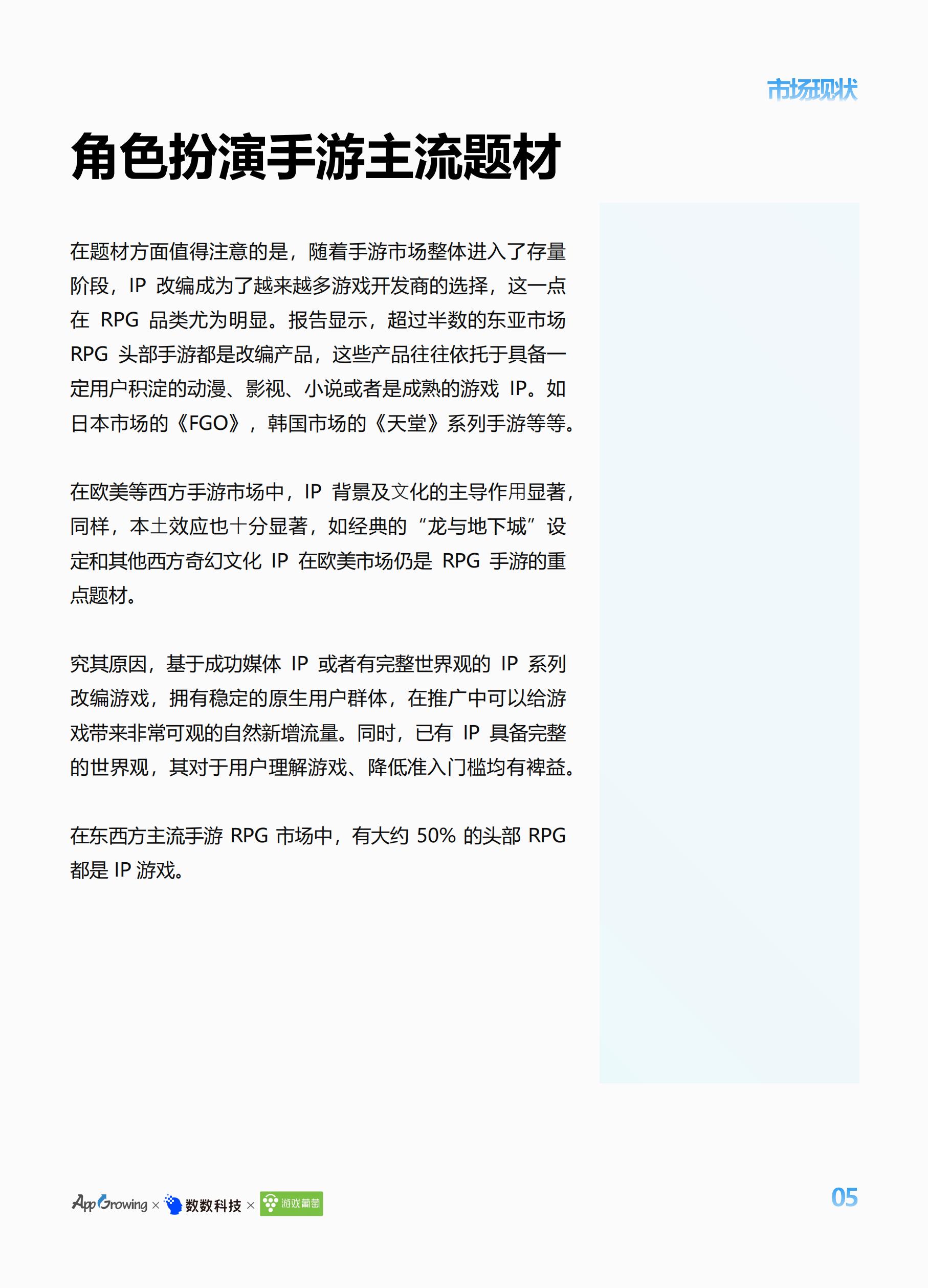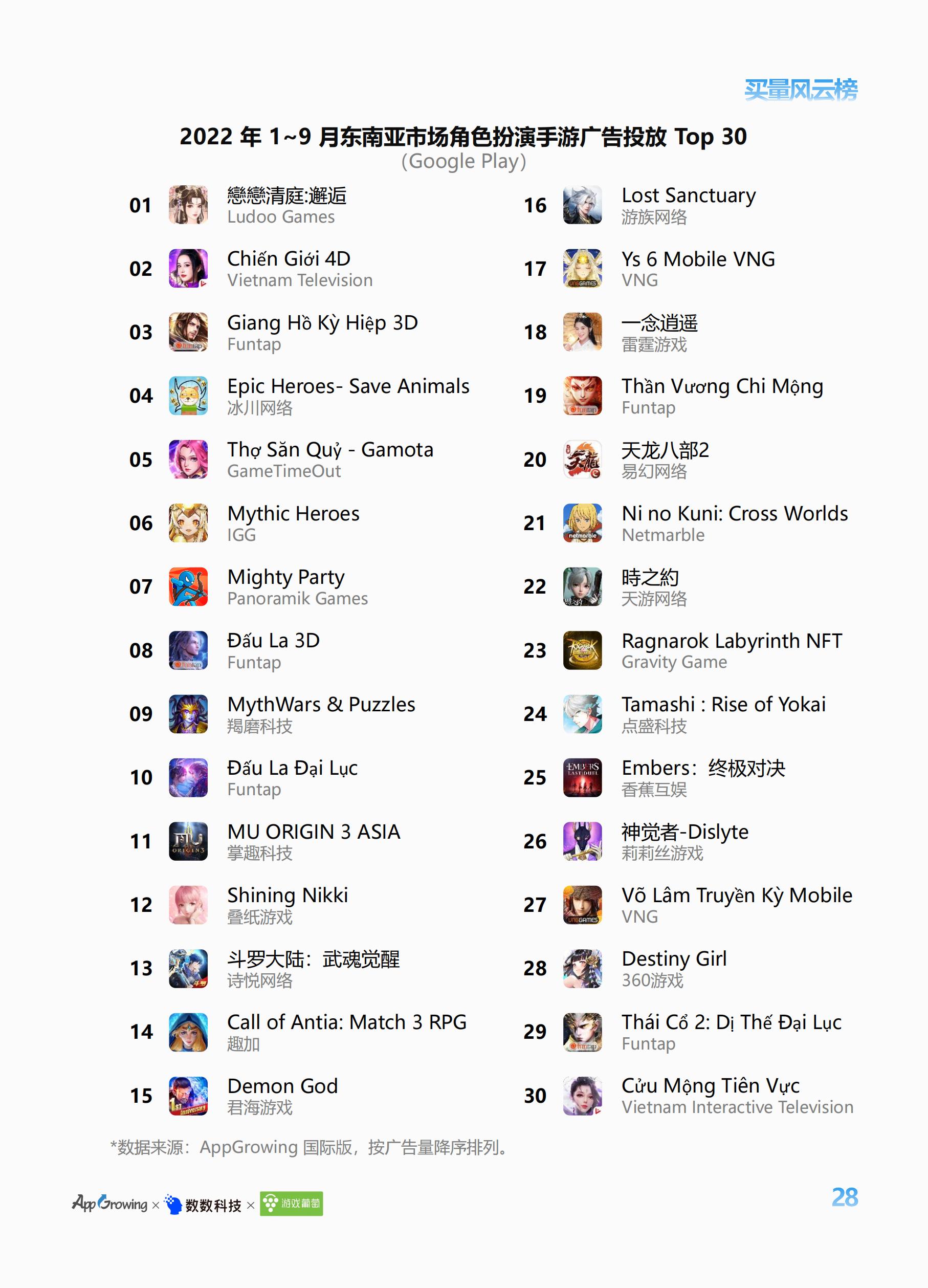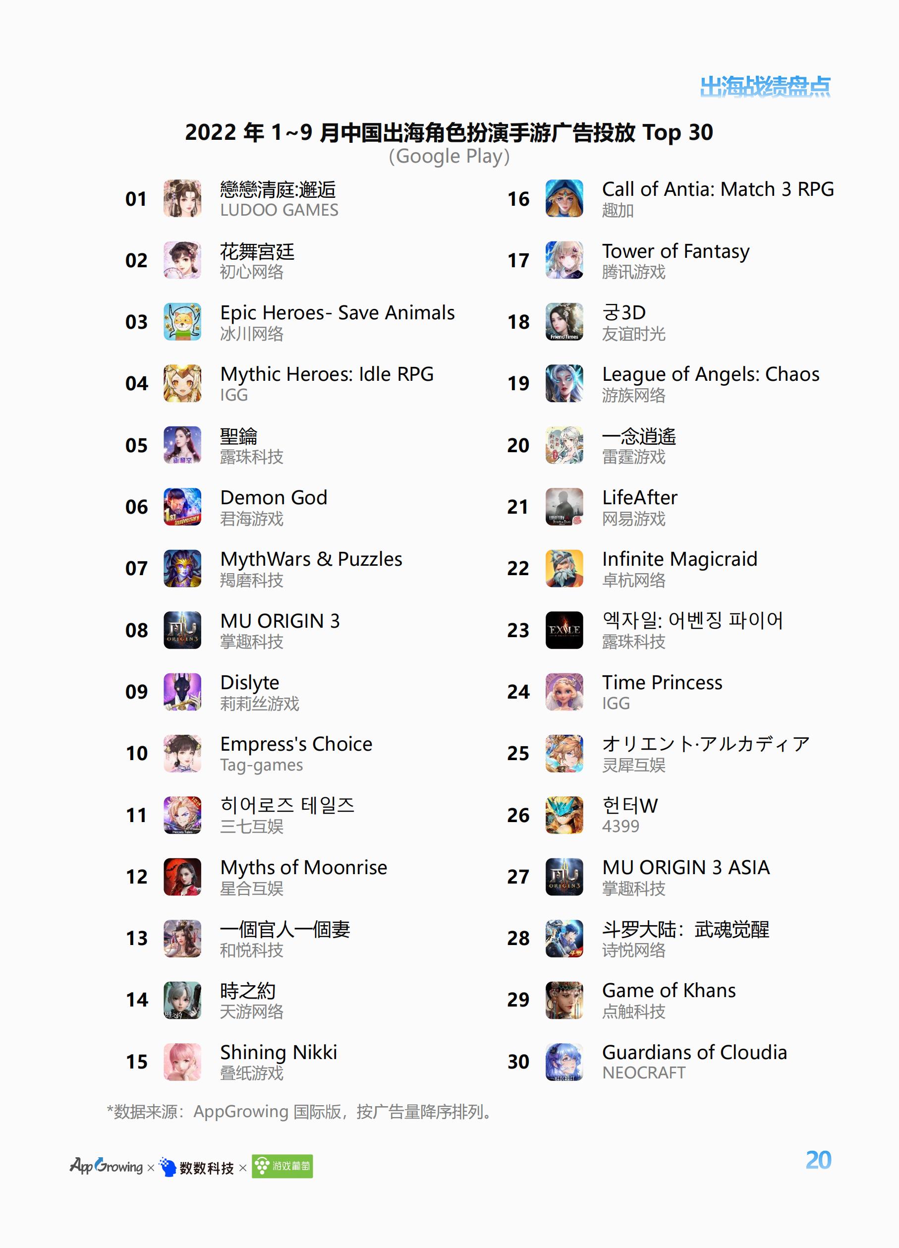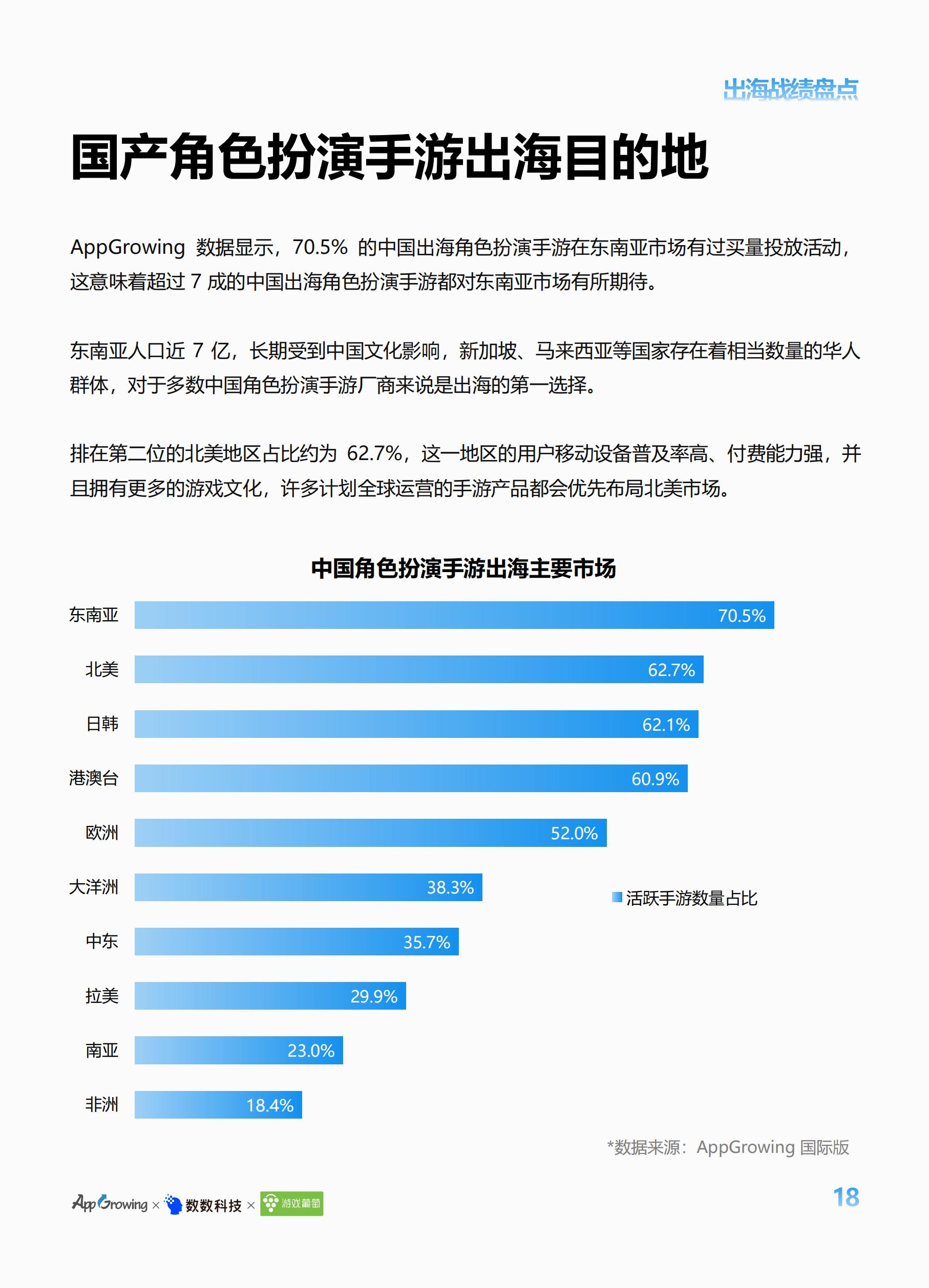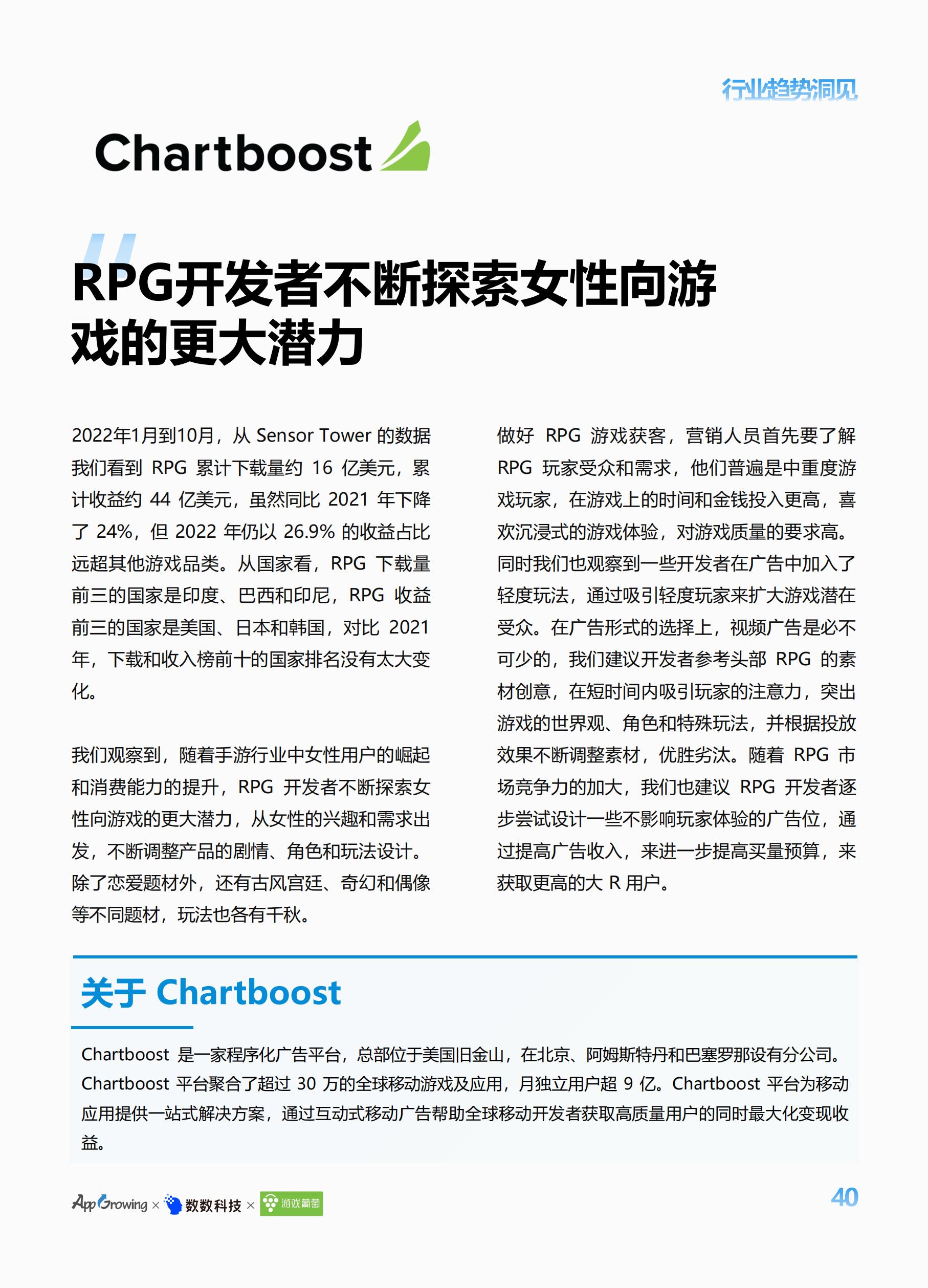 为了更全面地了解全球角色扮演手游市场变化,AppGrowing 联合数数科技、游戏葡萄发布《2022年中国角色扮演手游出海观察》,从市场现状、营销趋势、出海战绩、买量排行、成功案例等方面解读 2022 年角色扮演手游出海形势。