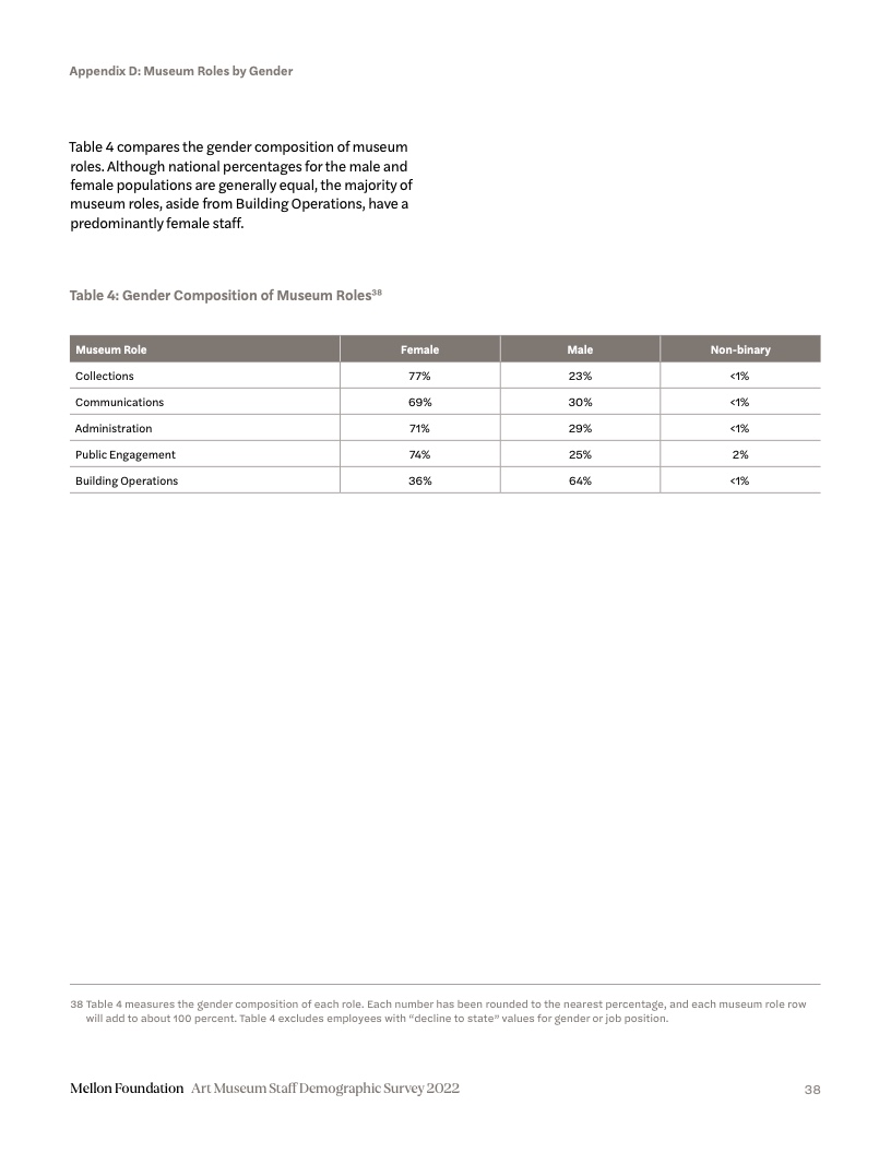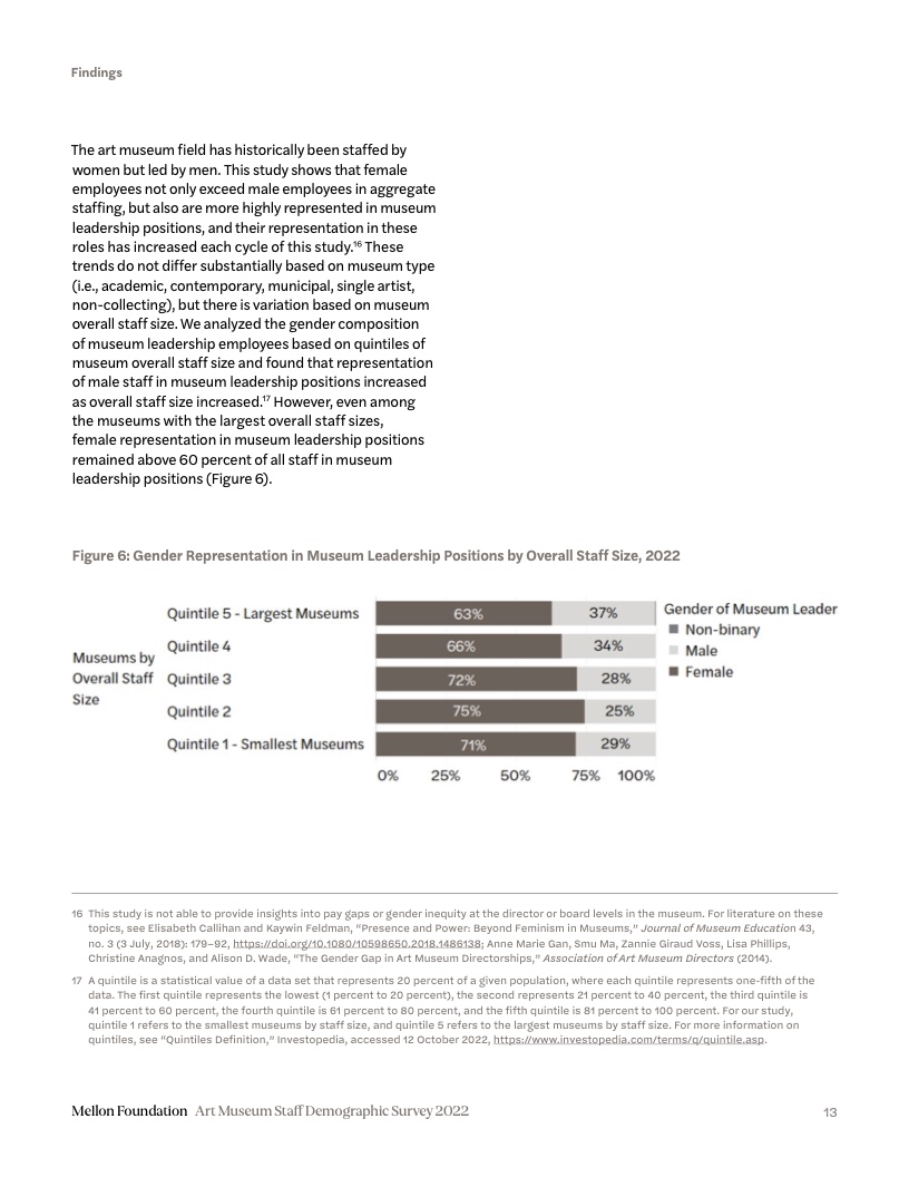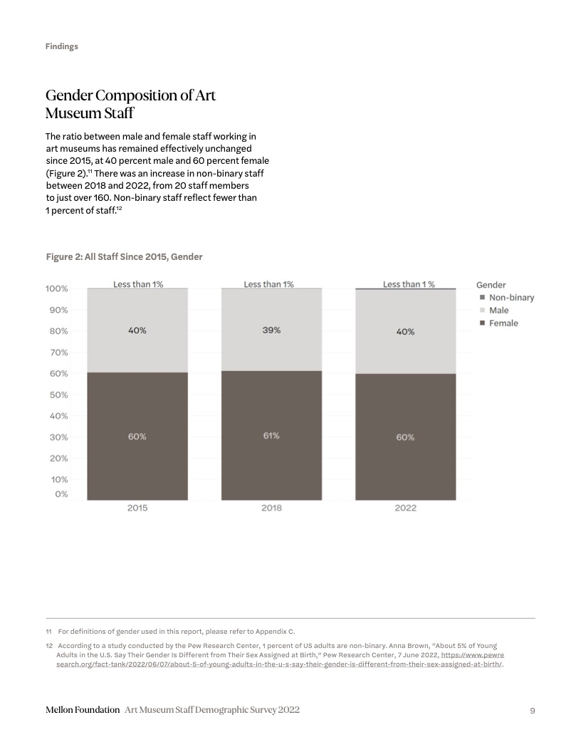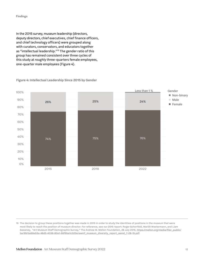 该调查还研究了性别差异问题。虽然自2015年以来性别比例保持稳定,博物馆员工中女性占60%,男性占40%。但自第一次调查以来,担任领导职务的女性比例有所增加,从58%上升到66%。