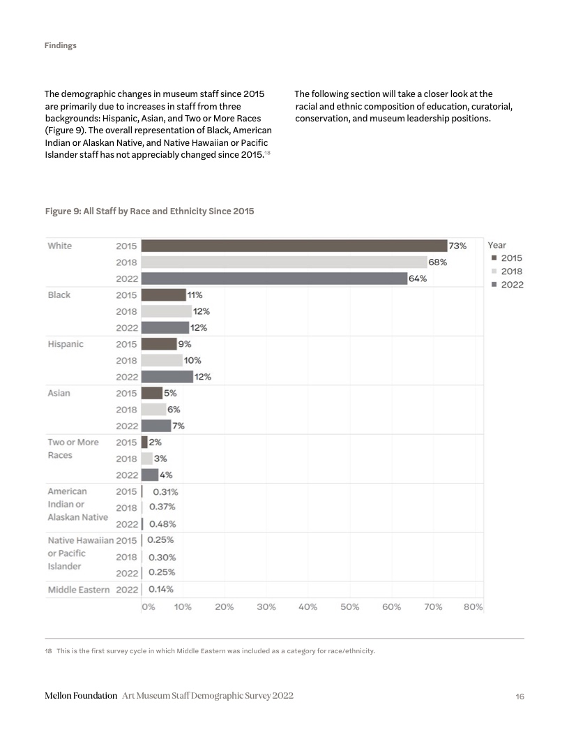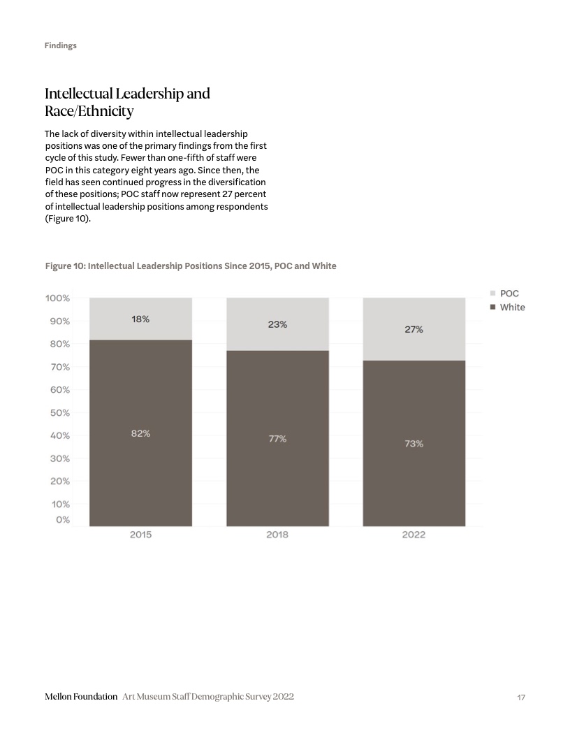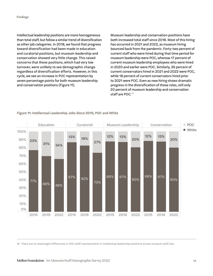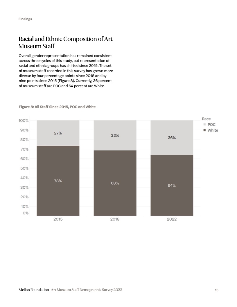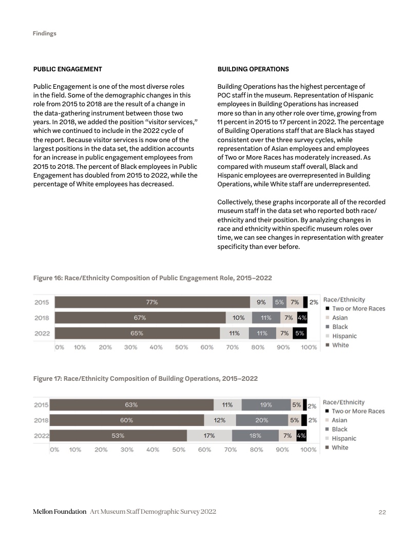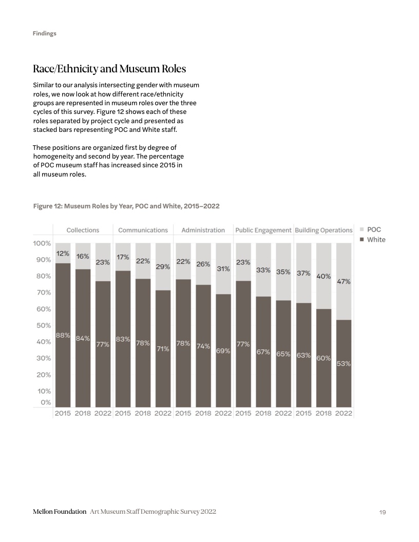 值得注意的是,2015年至2022年,在艺术机构担任领导职务的POC数量翻了一番。部门之间的多样性仍然不一致,POC在博物馆领导和策展员工中占20%,在公共参与员工中占35%,而在建筑维护员工中占47%。