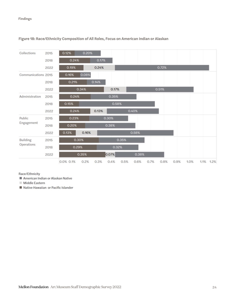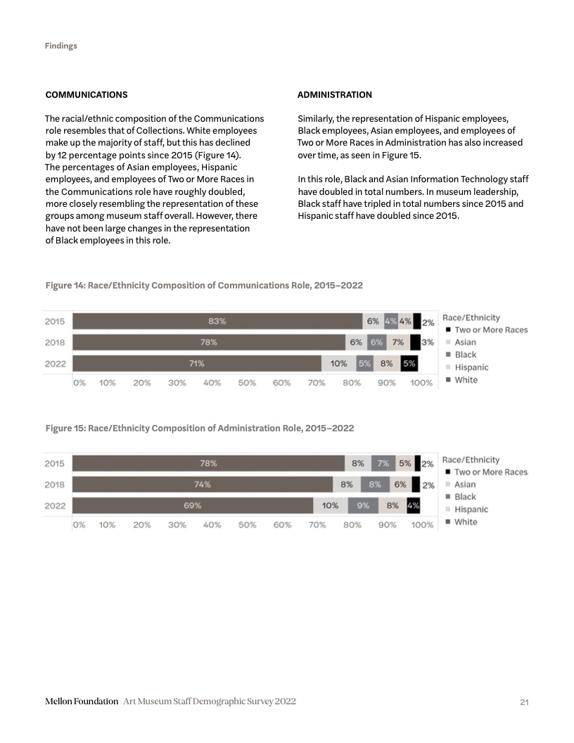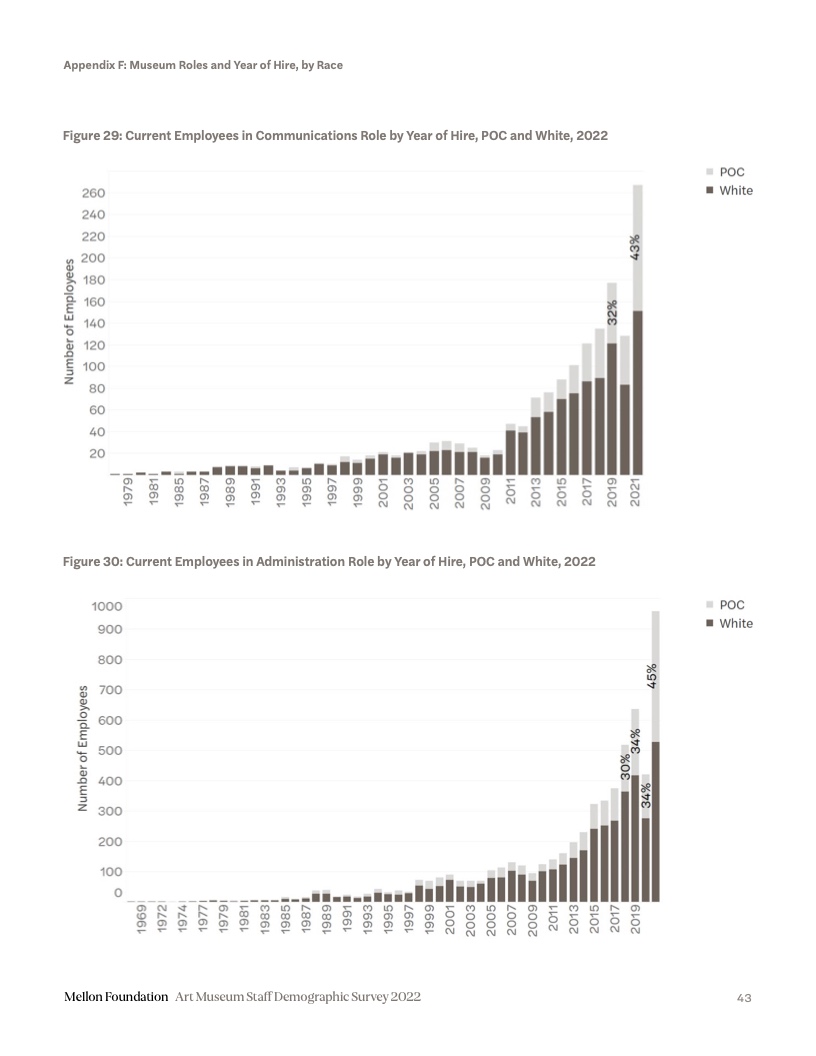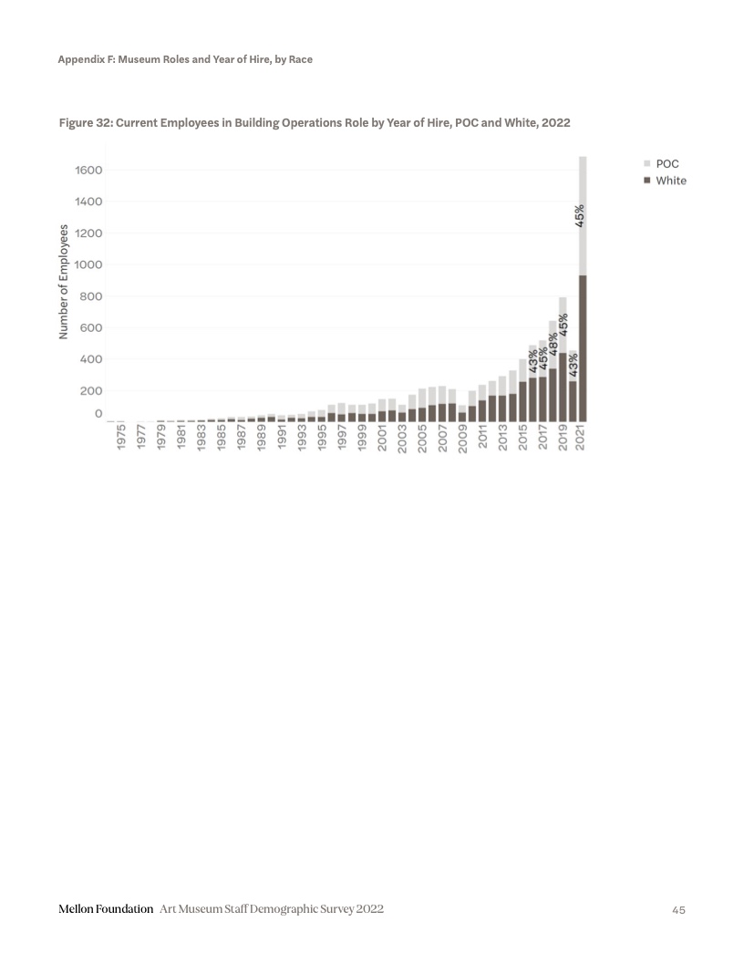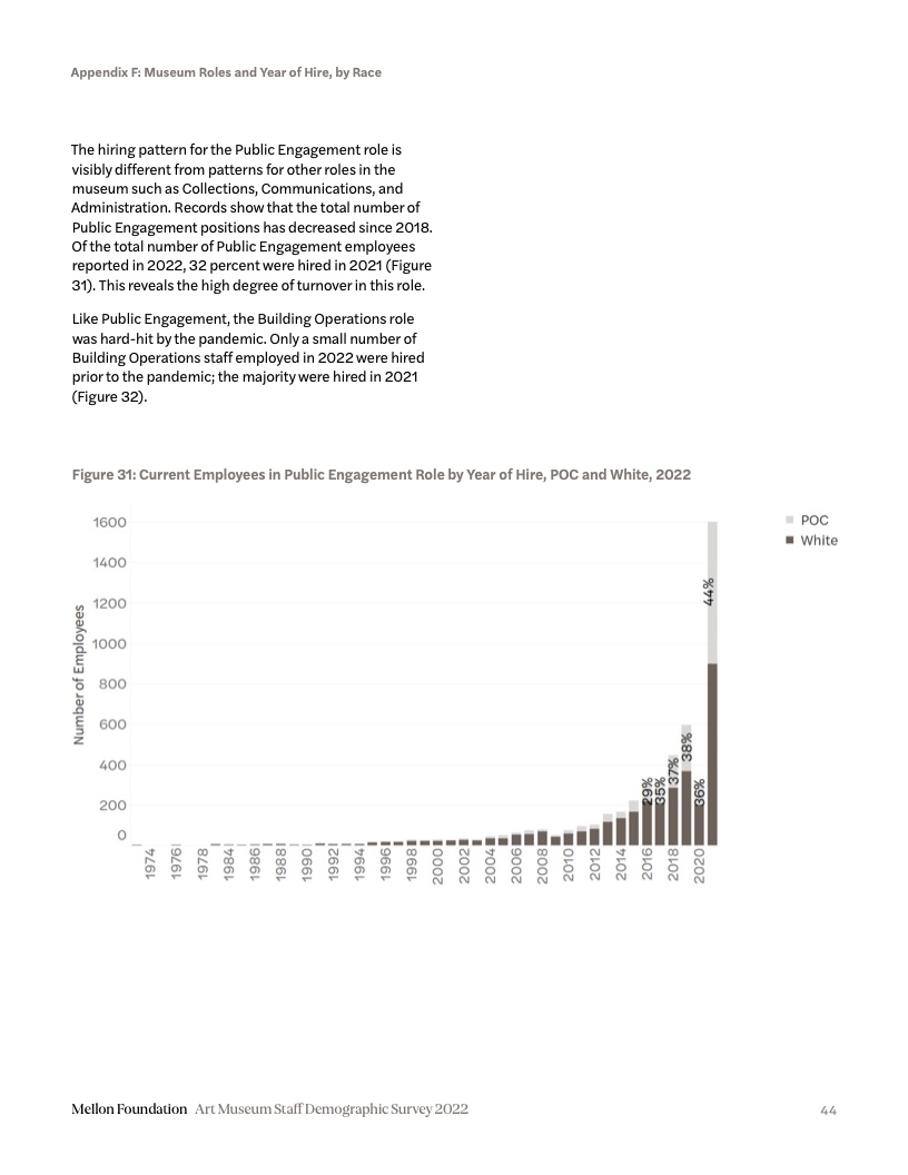 值得注意的是,2015年至2022年,在艺术机构担任领导职务的POC数量翻了一番。部门之间的多样性仍然不一致,POC在博物馆领导和策展员工中占20%,在公共参与员工中占35%,而在建筑维护员工中占47%。