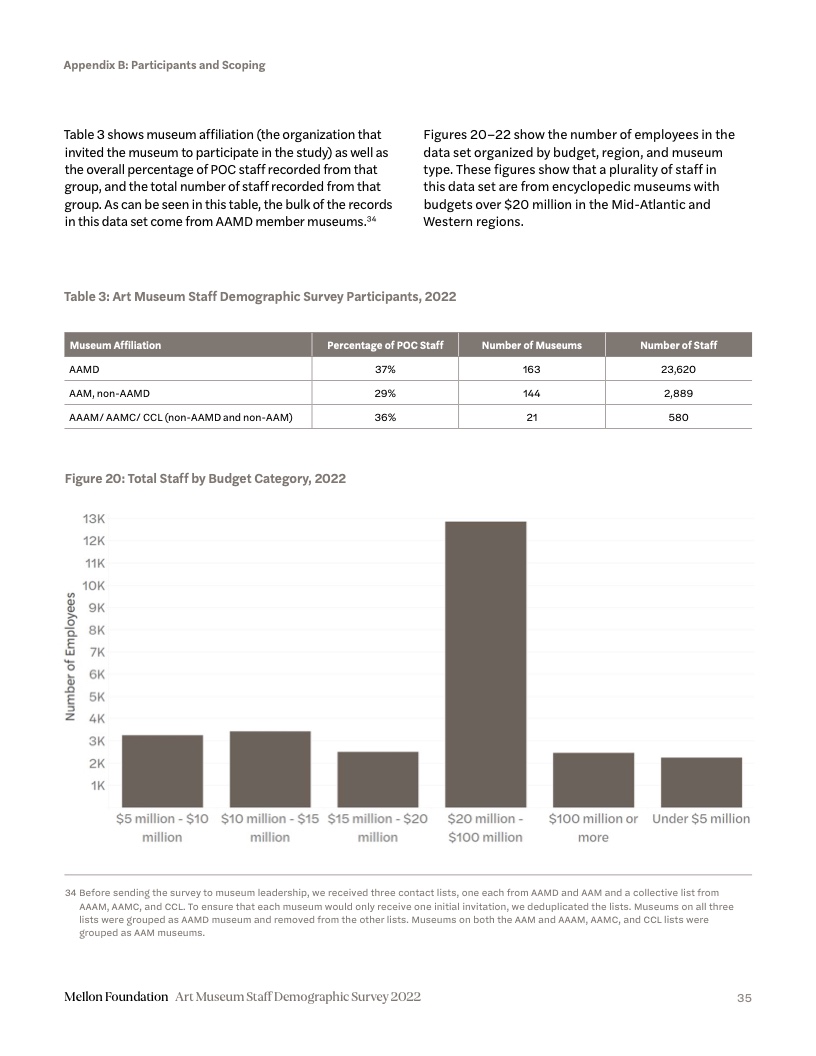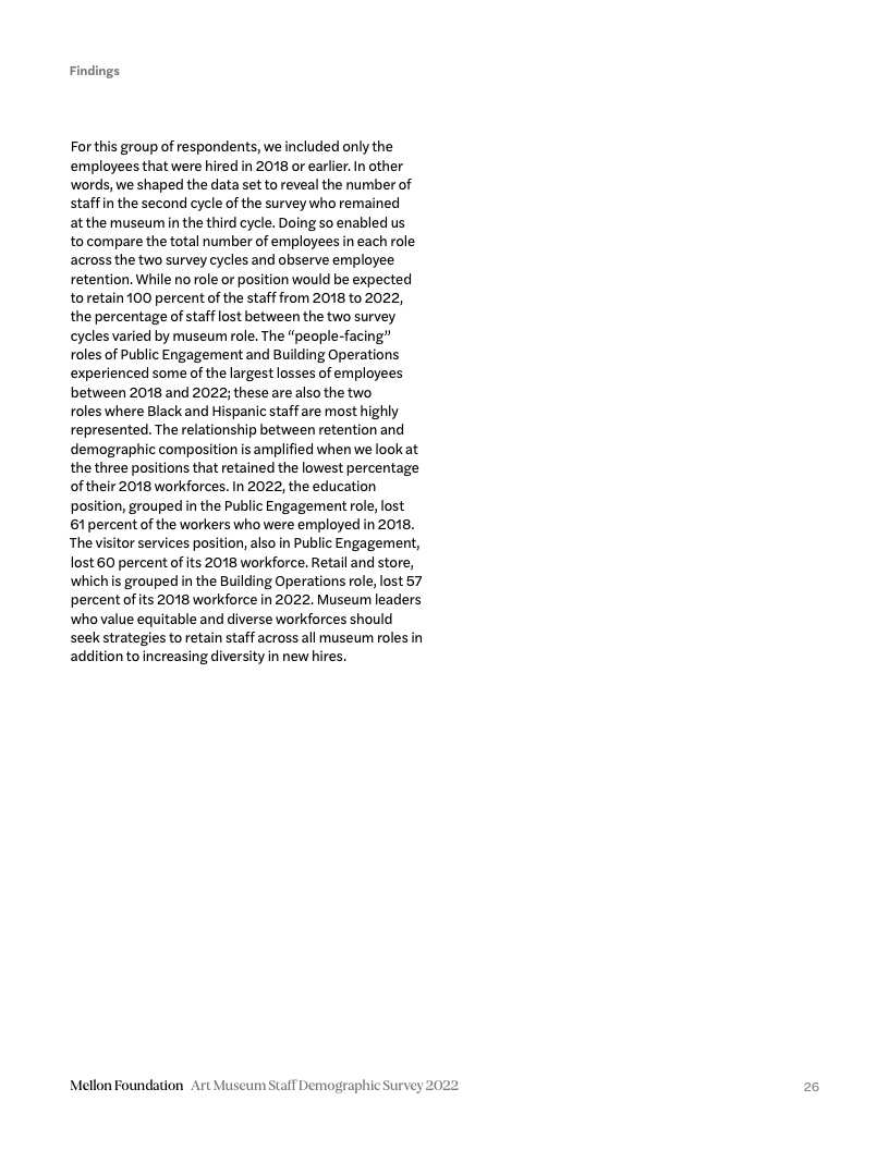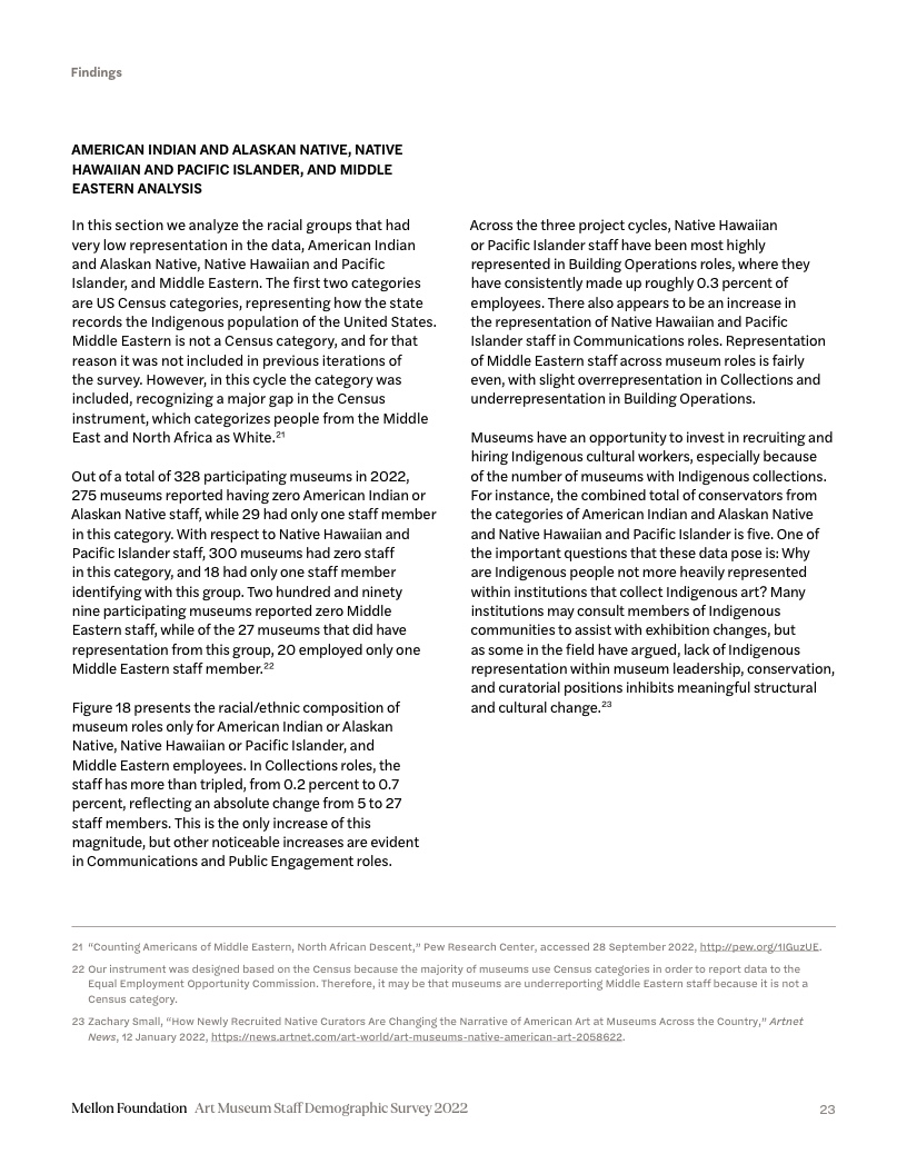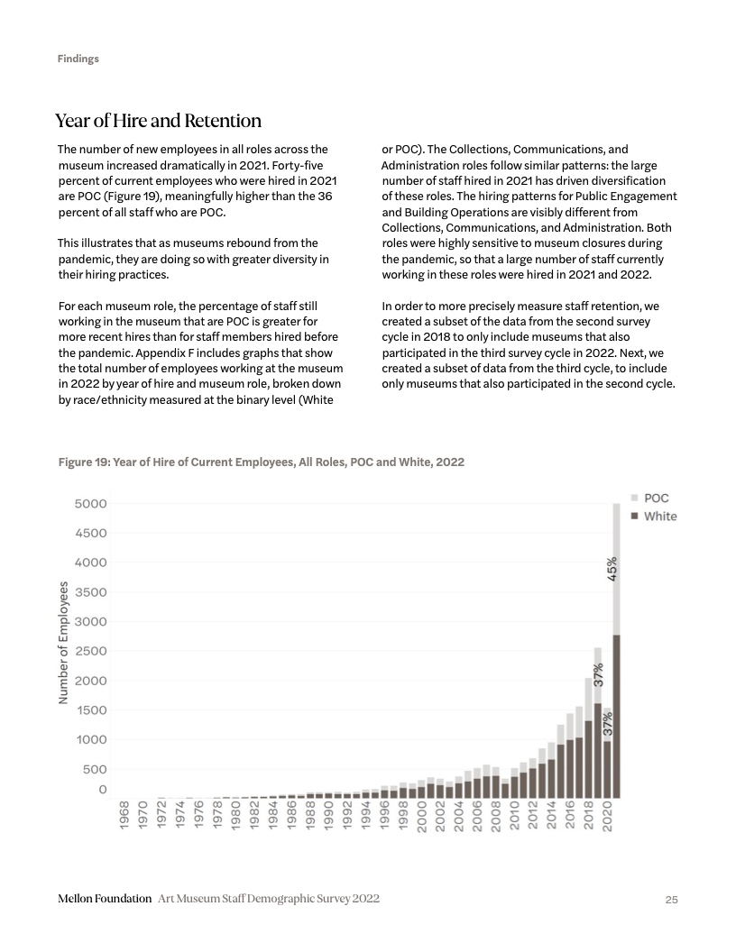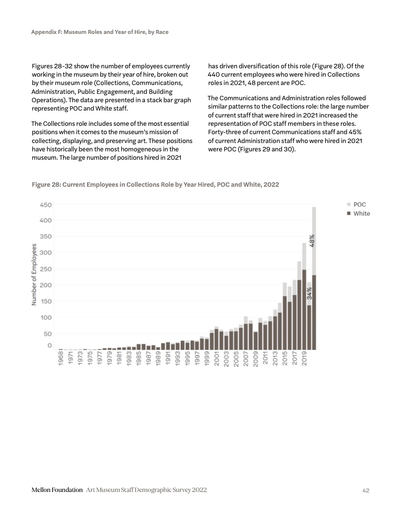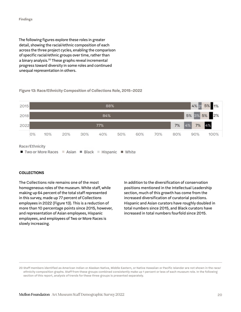 值得注意的是,2015年至2022年,在艺术机构担任领导职务的POC数量翻了一番。部门之间的多样性仍然不一致,POC在博物馆领导和策展员工中占20%,在公共参与员工中占35%,而在建筑维护员工中占47%。