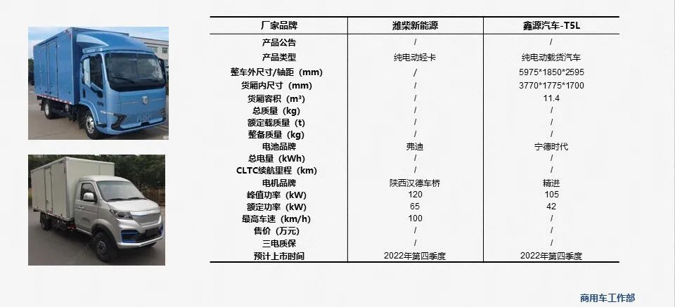 - 工信部(第365批) 《道路机动车辆生产企业及产品公告》中公示潍柴新能源-全新轻卡和鑫源汽车-T5L,其核心参数配置如下: