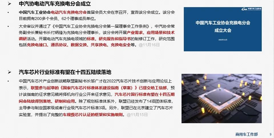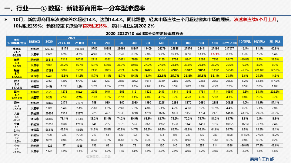 - 10月,新能源商用车渗透率首次超过14%,达到14.4%,同比翻番;轻客市场连续三个月超过微客市场的规模,渗透率连续5个月上升,10月超过39%;新能源重卡渗透率首次超过5%,累计同比达到202.2%。