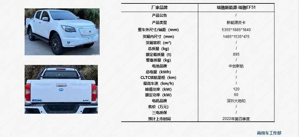 - 工信部(第365批) 《道路机动车辆生产企业及产品公告》中公示了瑞驰EF51车型,其核心参数配置如下: