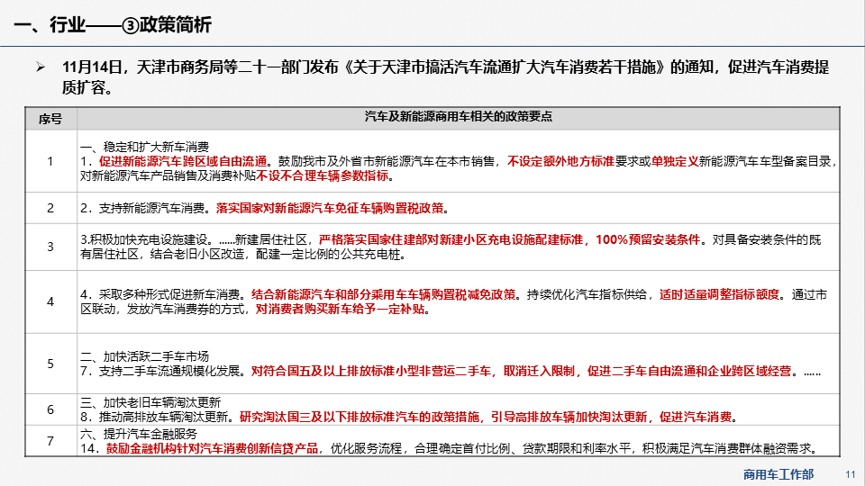 - 11月14日,天津市商务局等二十一部门发布《关于天津市搞活汽车流通扩大汽车消费若干措施》的通知,促进汽车消费提质扩容。