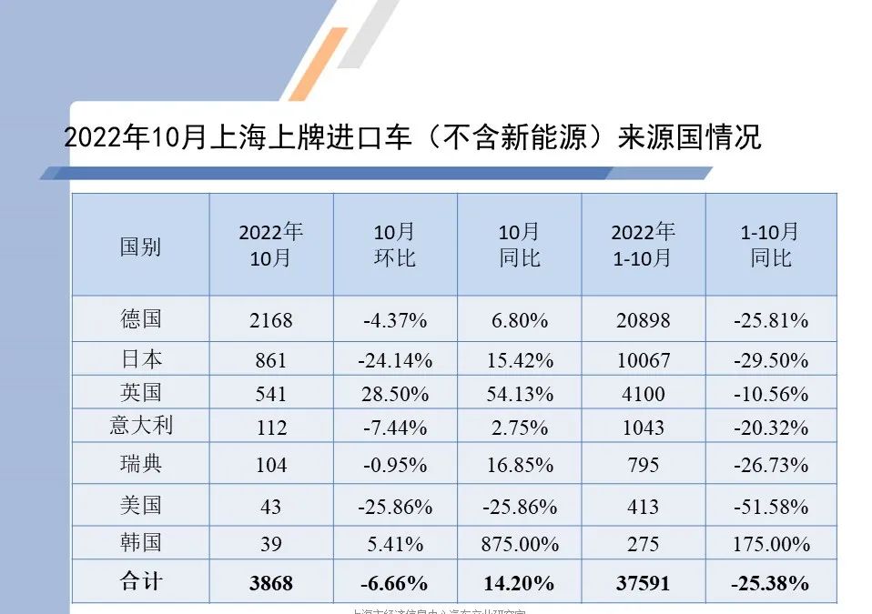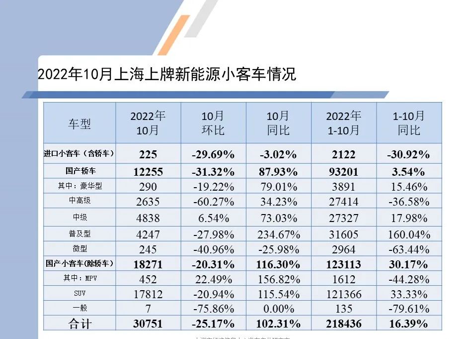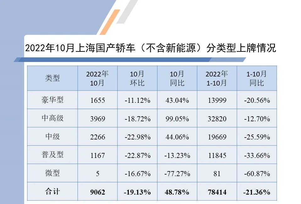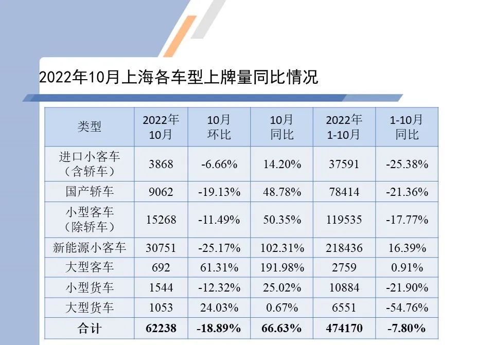 中国汽车流通协会:2022年10月上海汽车市场上牌情况 2022年10月上海总体上牌数是62,238。同比下降18.89%。 10月具体分类型的上牌情况是:进口小客车(含轿车)3,868;国产轿车9,062;小型客车(除轿车)15,268;新能源小客车30,751;大型客车692;小型、大型货车分别是1,544和1,053。 更多阅读:中国汽车流通协会:2020年3月份国内狭义乘用车市场销量达104.5万辆 同比下降40.4%中国汽车流通协会:2020年4月中国进口汽车市场月报中国汽车流通协会:2020年第一季度豪华品牌新增授权4s店57家 退网4s店41家中国汽车流通协会:2022年4月中国汽车保值率报告上海经济信息中心:2024年5月上海汽车市场上牌情况乘联会:2020年1月份上海汽车市场分析上海信息中心:2019年3月上海汽车市场上牌情况上海经济信息中心:2023年5月上海汽车市场上牌情况上海经济信息中心:2023年7月上海汽车市场上牌情况中国汽车流通协会:2020年8月上海汽车市场上牌情况中国汽车流通协会:2020年7月上海汽车市场上牌情况中国汽车流通协会:2021年10月上海汽车市场上牌情况中国汽车流通协会:2022年2月上海汽车市场上牌情况中国汽车流通协会: 2023年10月份全国乘用车市场分析中国汽车流通协会: 2023年9月皮卡厂商批发销量排名