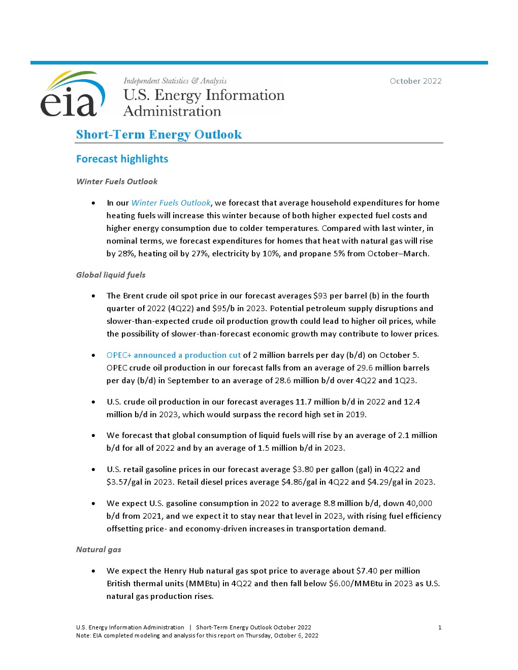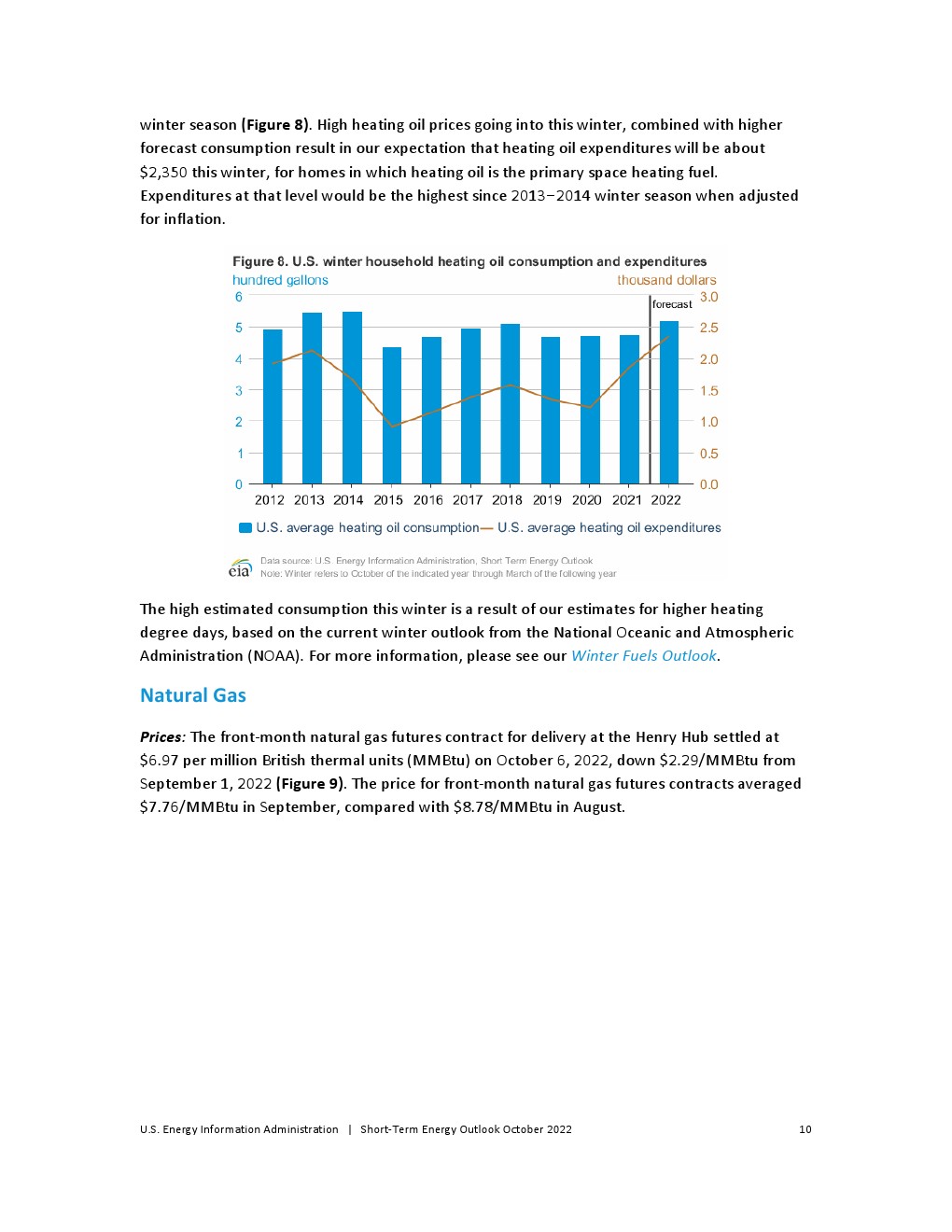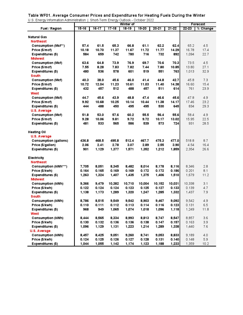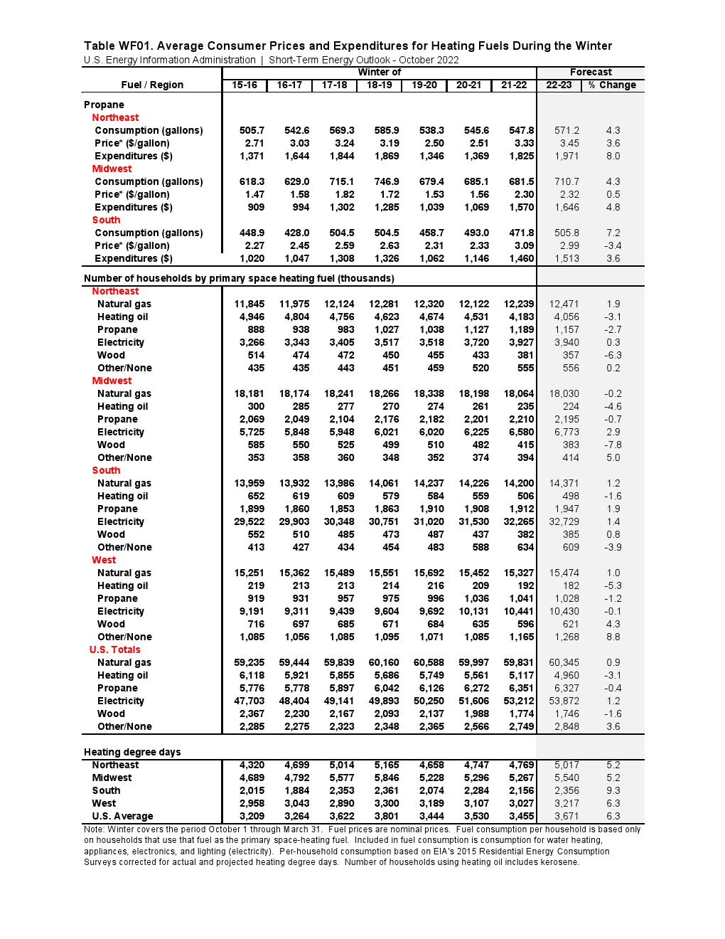 美国能源情报署发布了“2022年10月短期能源展望”。在冬季燃料展望中,美国能源情报署预测用于家庭取暖燃料的平均家庭支出将在今年冬季增加,因为预期燃料成本更高,而且温度更低,导致能源消耗更高。与去年冬天相比,预计从10月到3月使用天然气取暖的家庭支出将增长28%,取暖油增长27%,电力增长10%,丙烷增长5%。