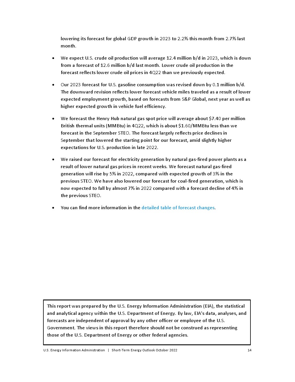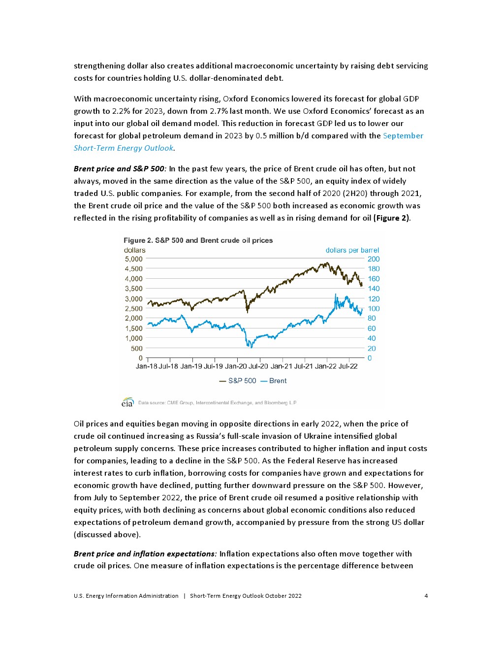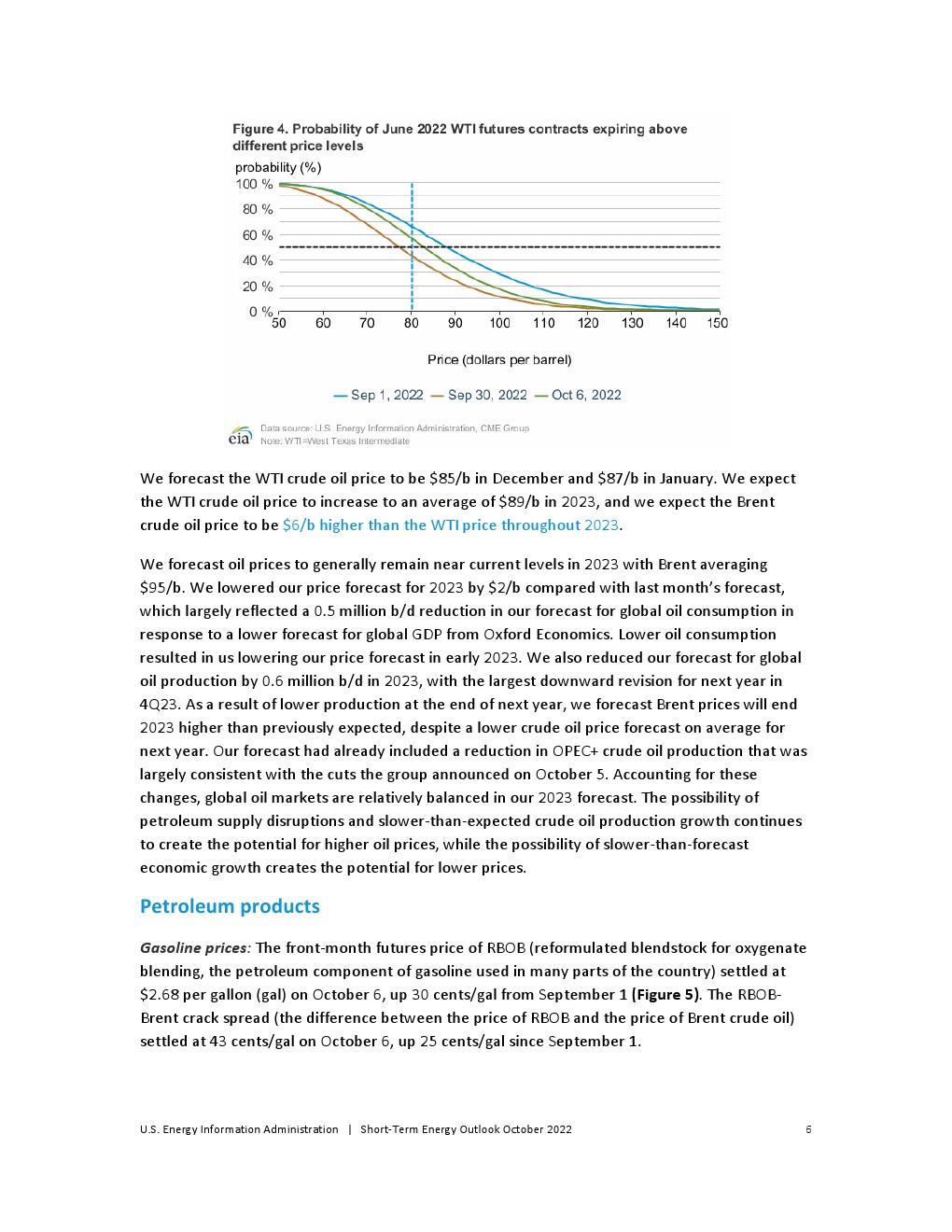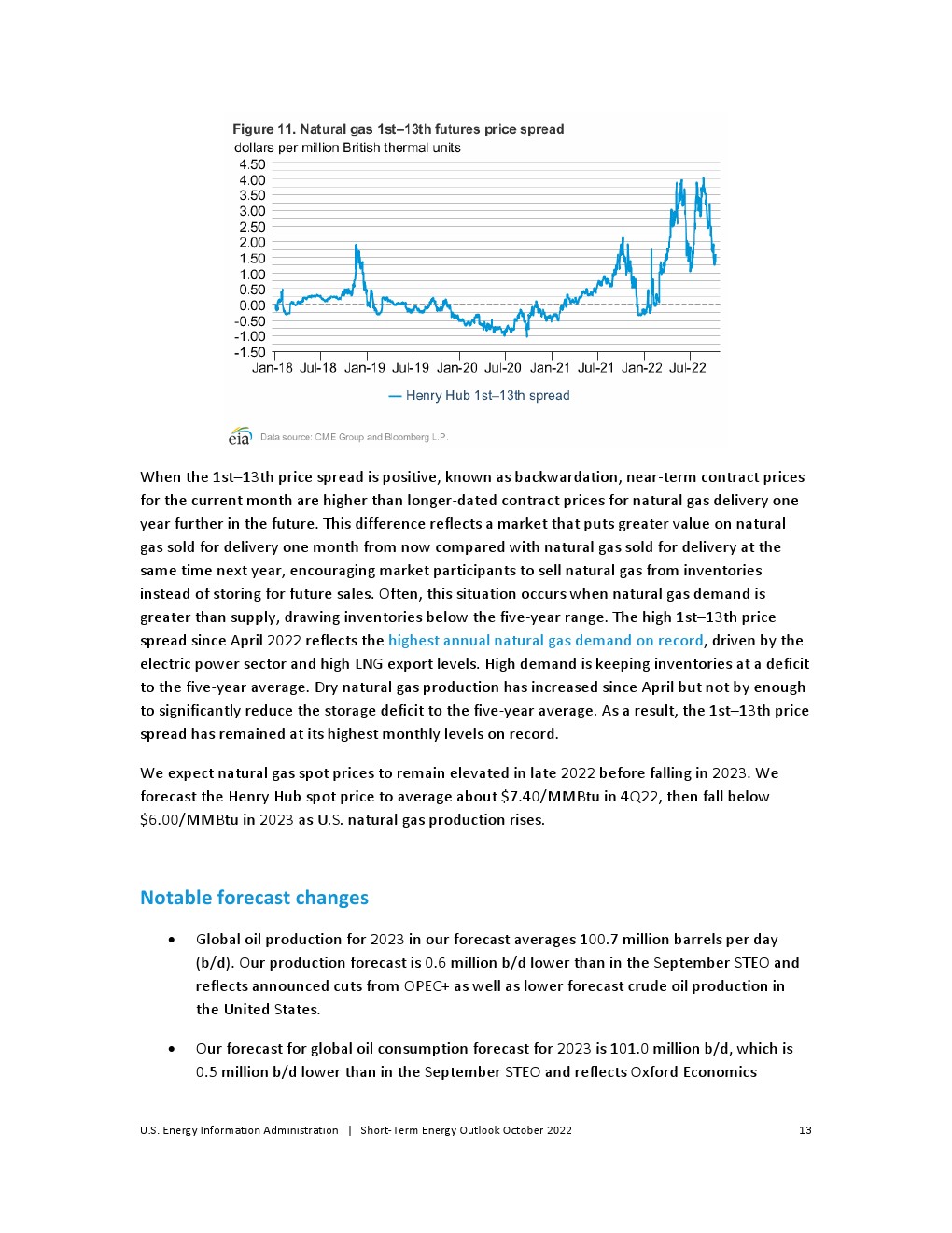 预计布伦特原油现货价格在2022年第四季度平均每桶为93美元,2023年平均每桶95美元。潜在的石油供应中断和原油产量增长慢于预期可能导致油价上涨,而经济增长可能低于预期导致价格下跌。
