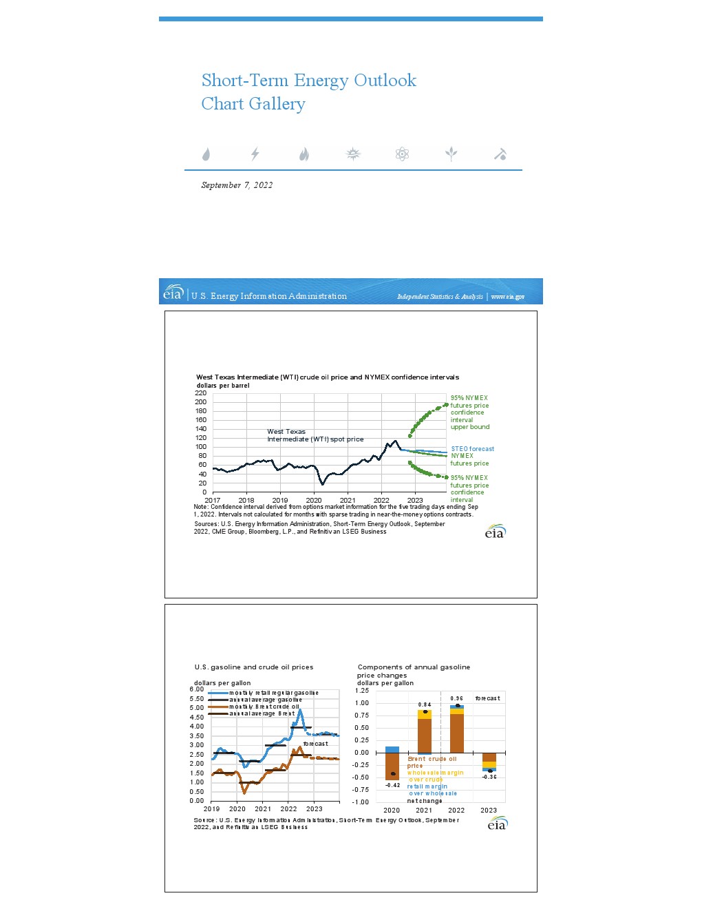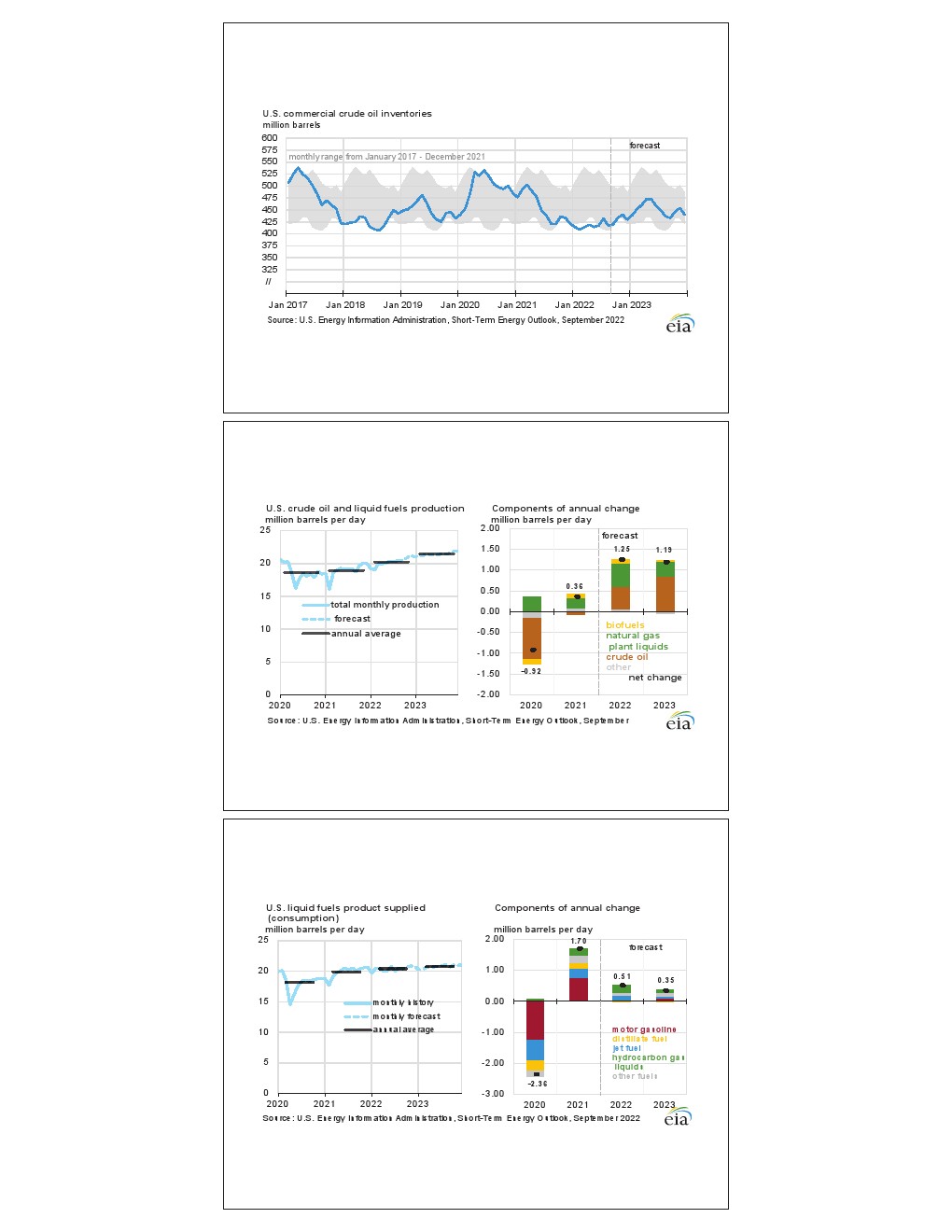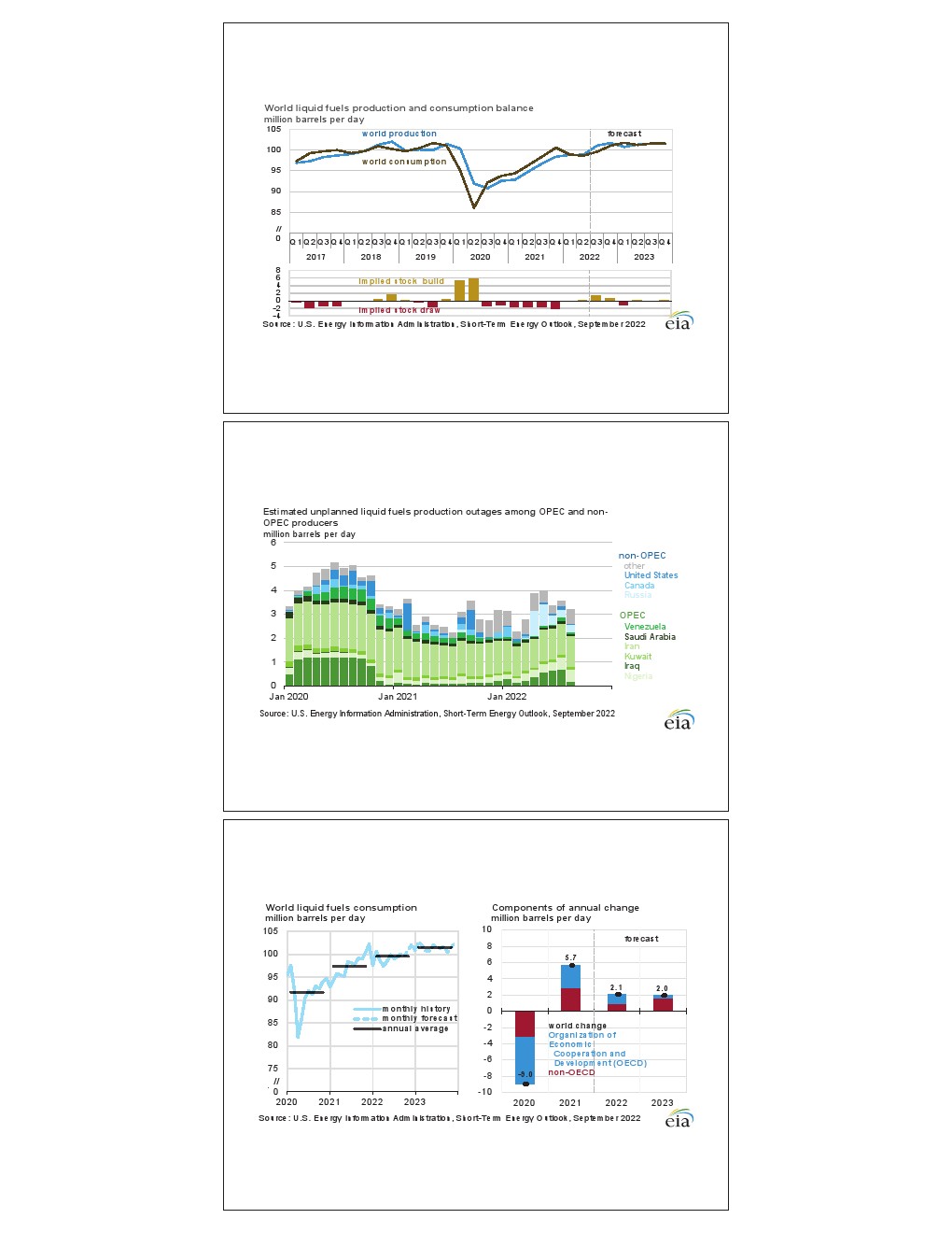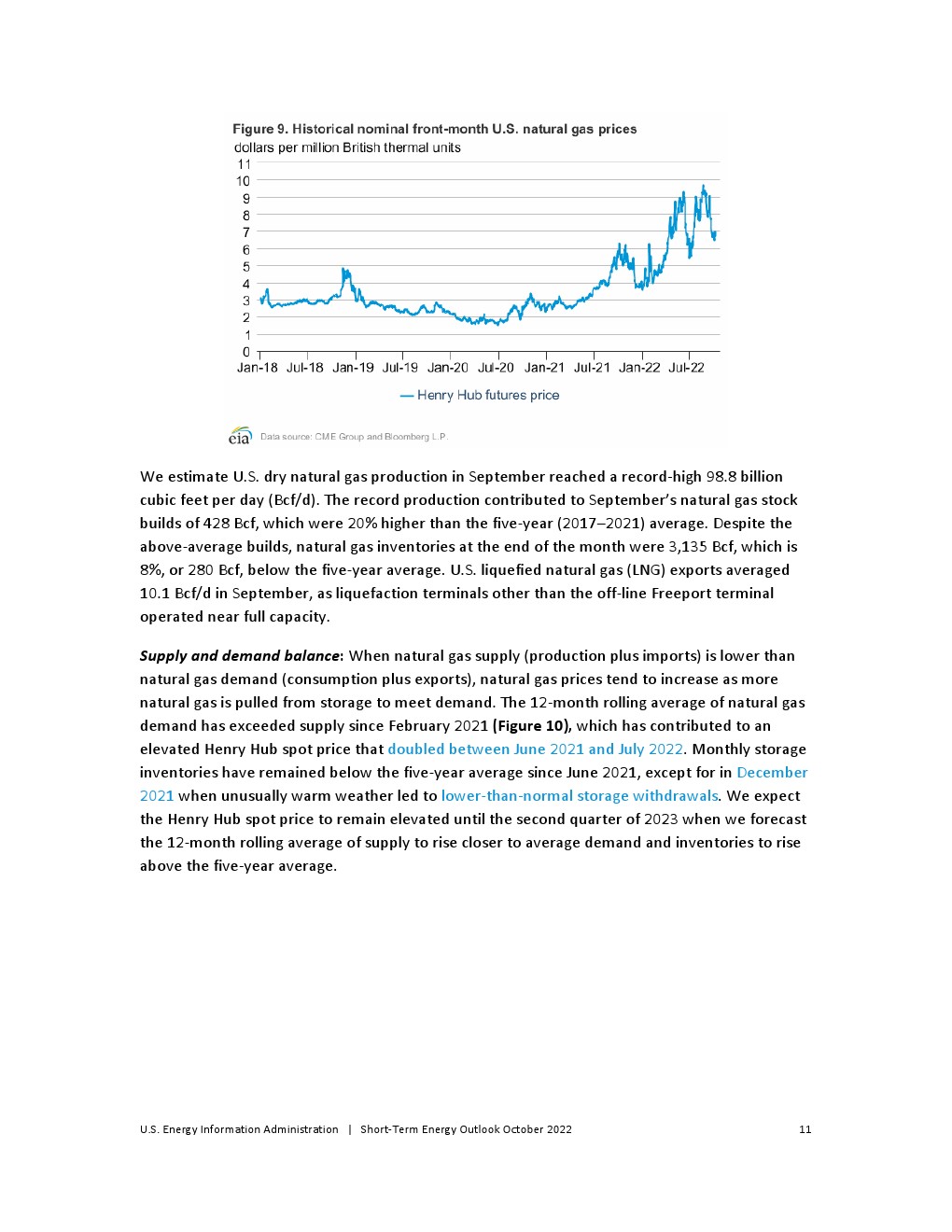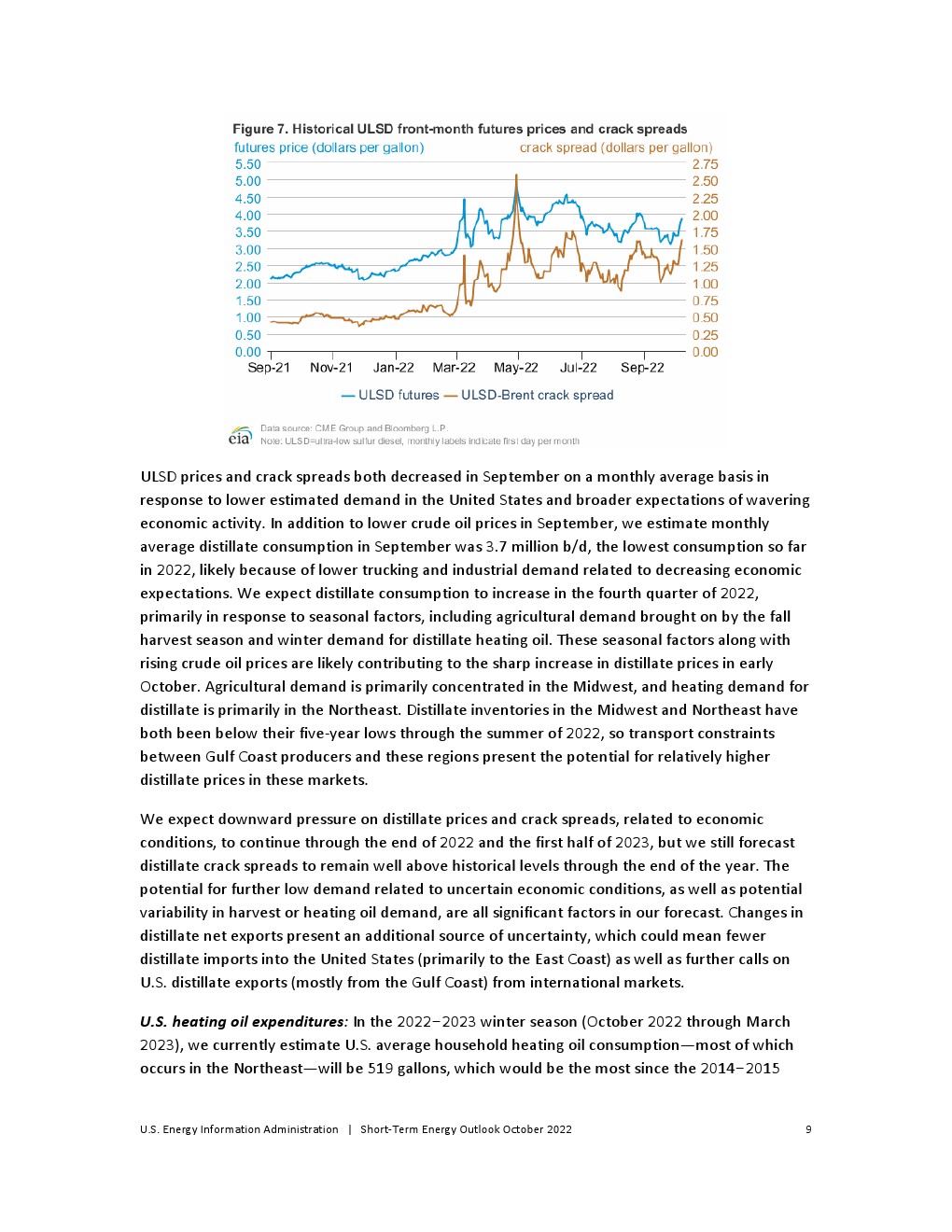预计布伦特原油现货价格在2022年第四季度平均每桶为93美元,2023年平均每桶95美元。潜在的石油供应中断和原油产量增长慢于预期可能导致油价上涨,而经济增长可能低于预期导致价格下跌。