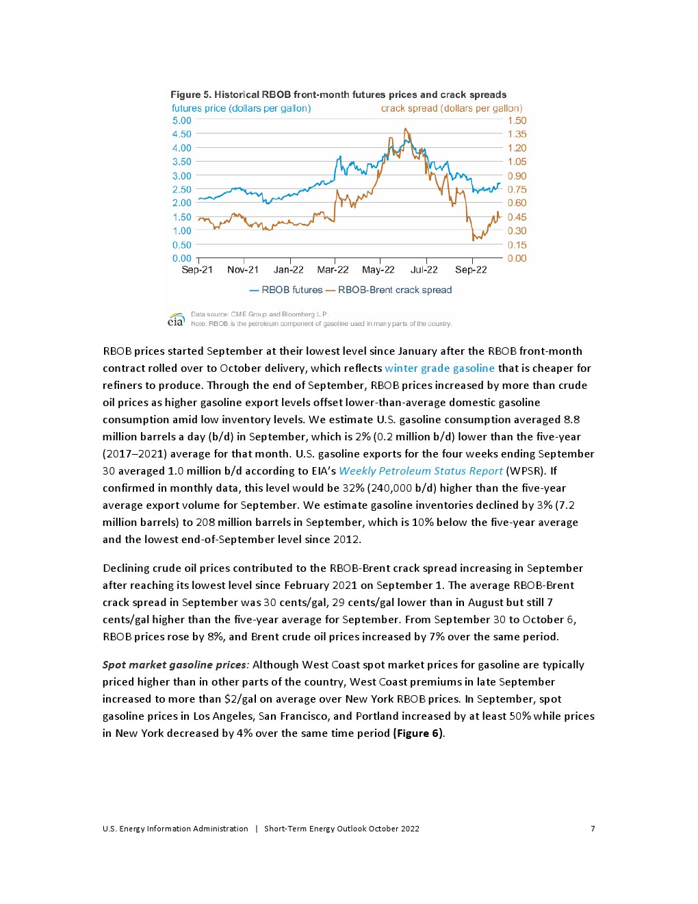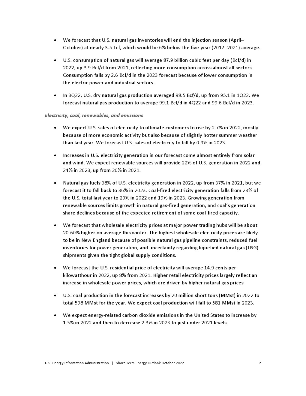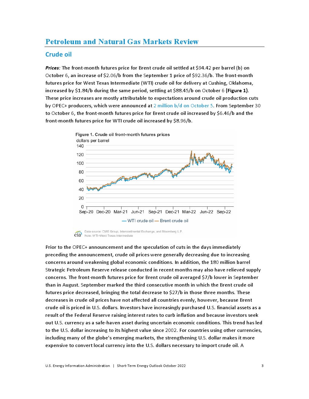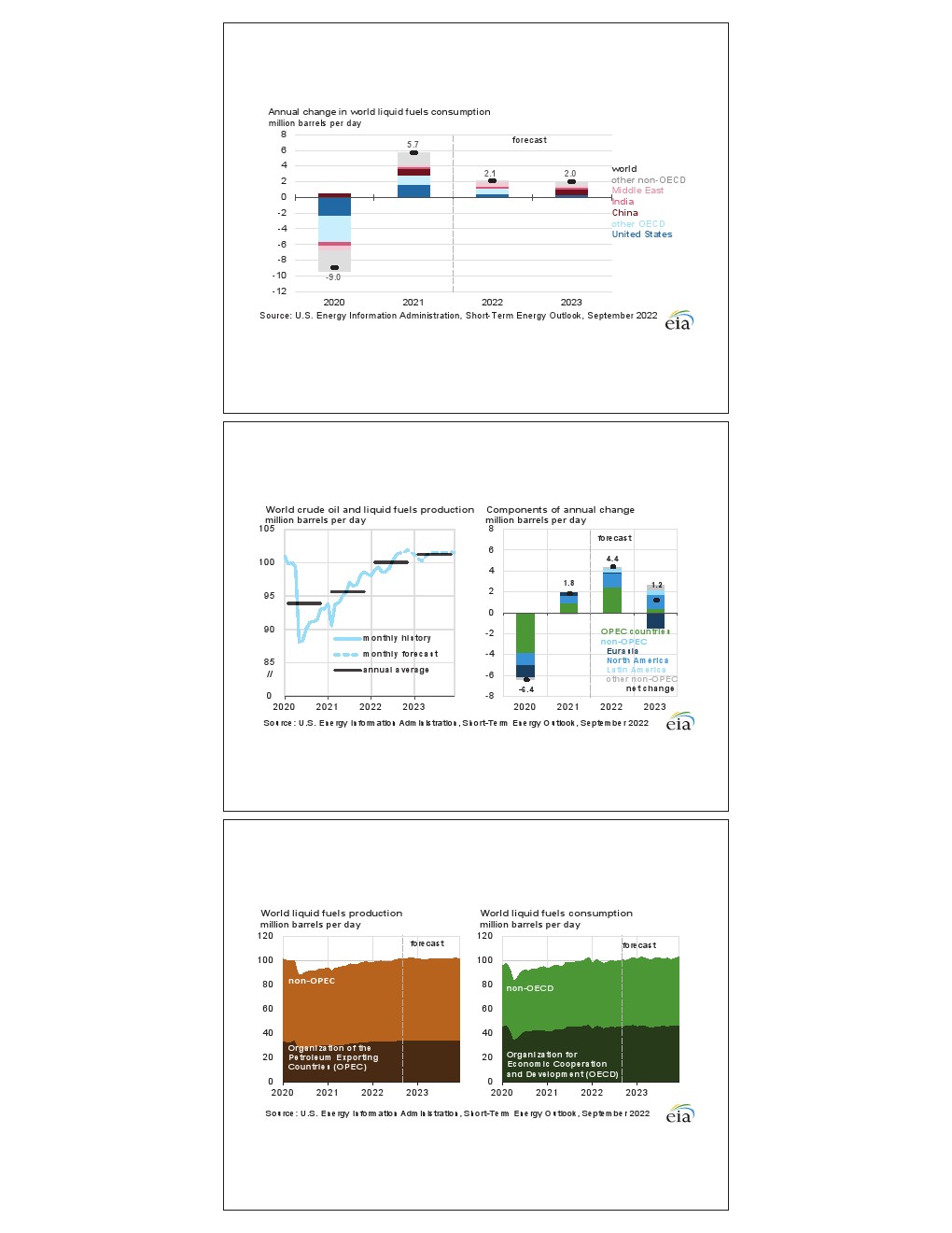 预计布伦特原油现货价格在2022年第四季度平均每桶为93美元,2023年平均每桶95美元。潜在的石油供应中断和原油产量增长慢于预期可能导致油价上涨,而经济增长可能低于预期导致价格下跌。