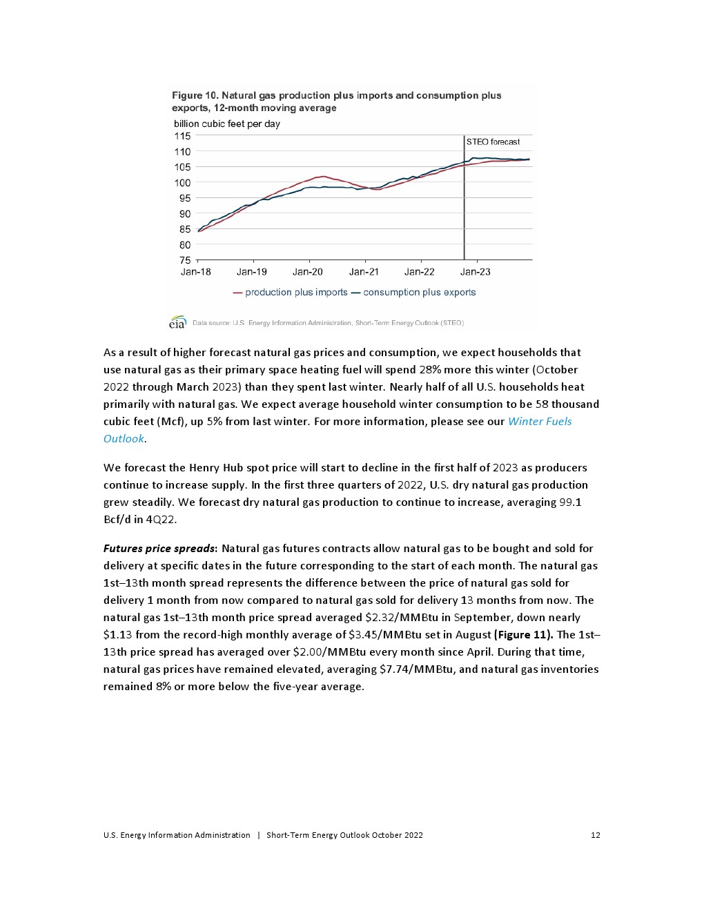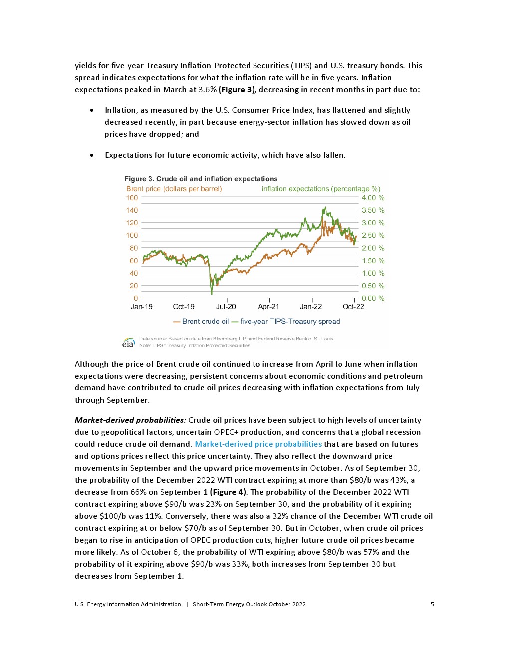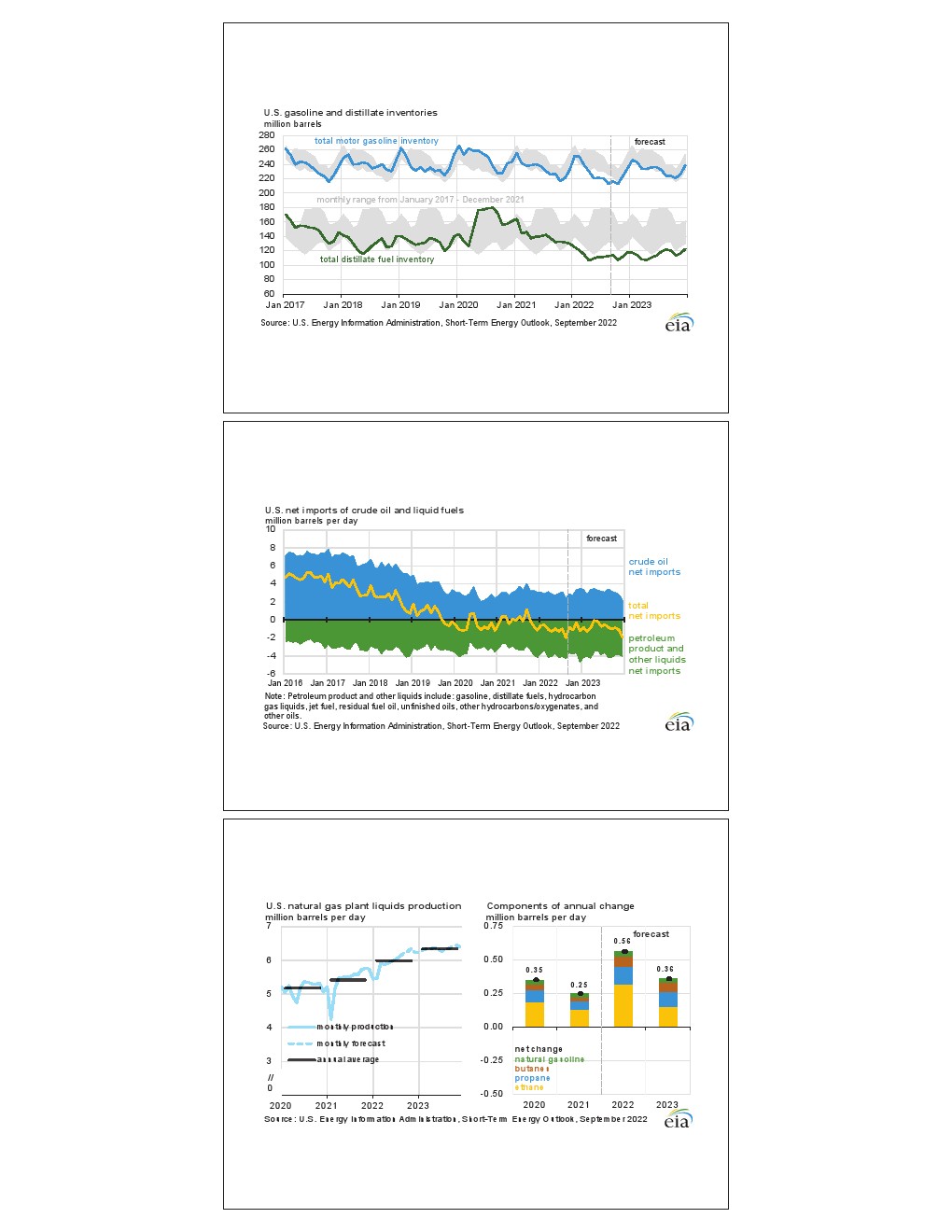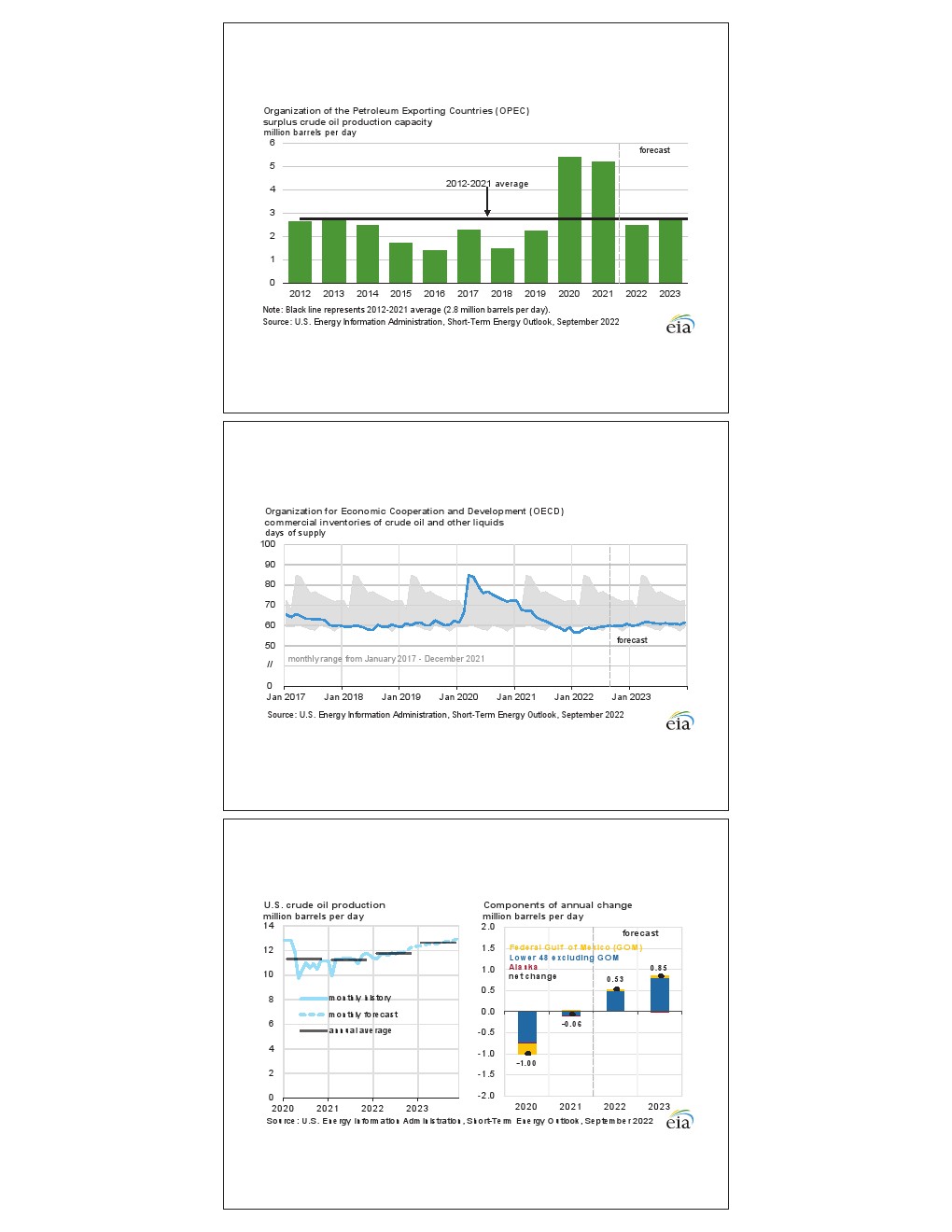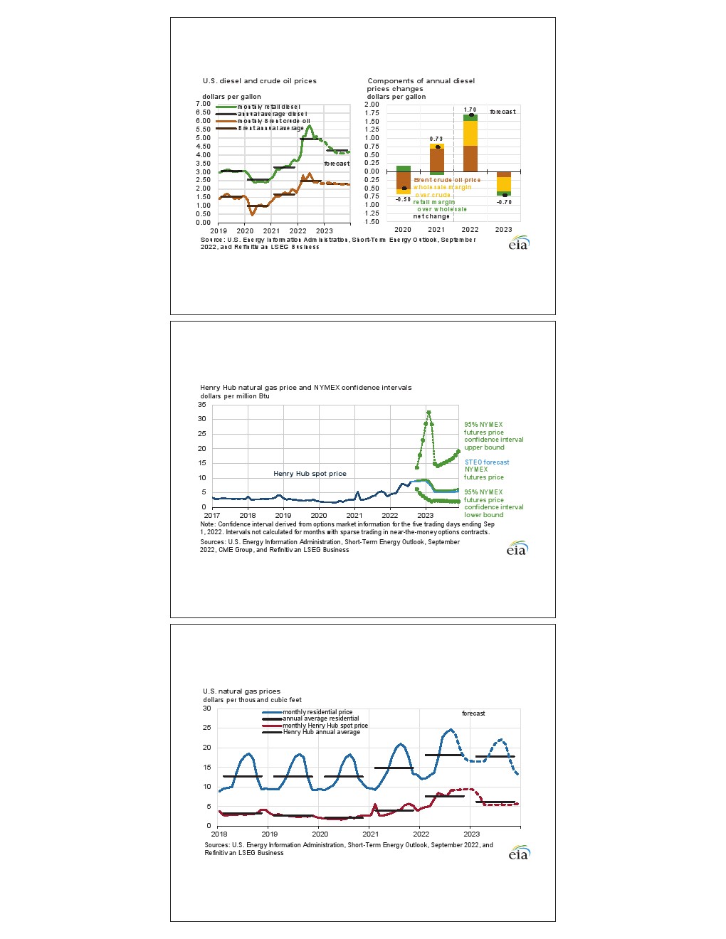 预计布伦特原油现货价格在2022年第四季度平均每桶为93美元,2023年平均每桶95美元。潜在的石油供应中断和原油产量增长慢于预期可能导致油价上涨,而经济增长可能低于预期导致价格下跌。