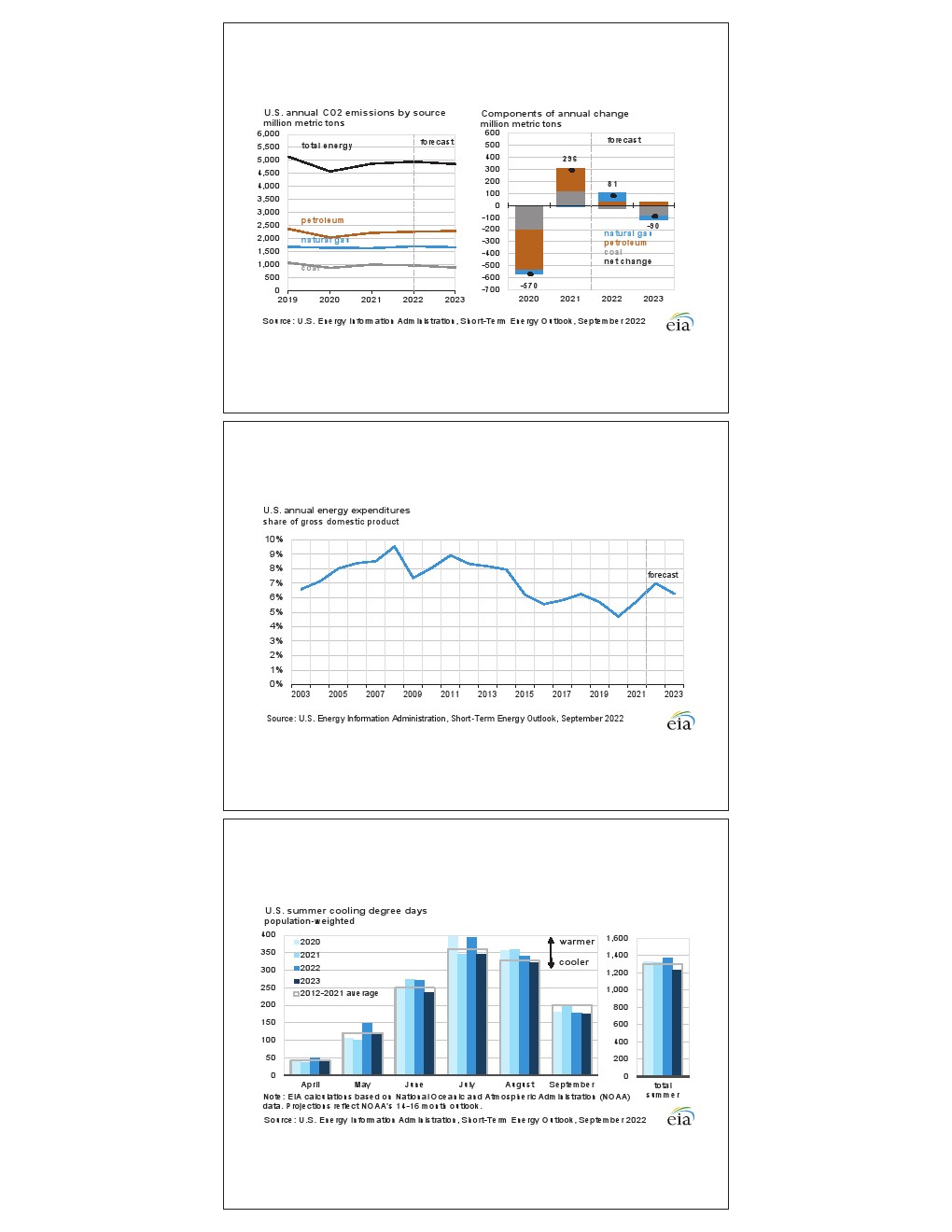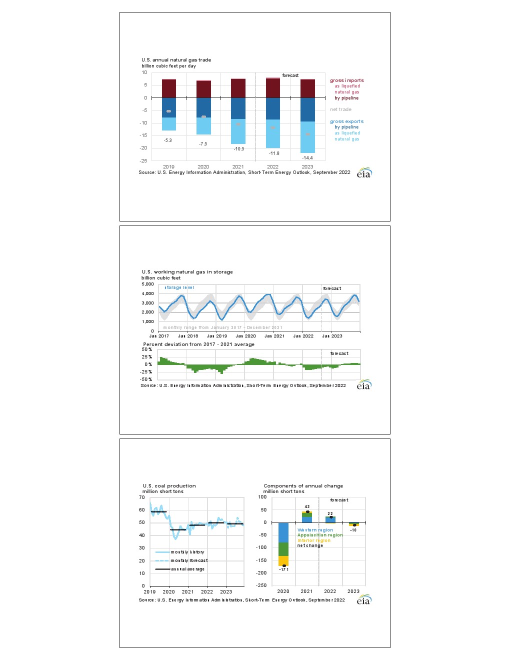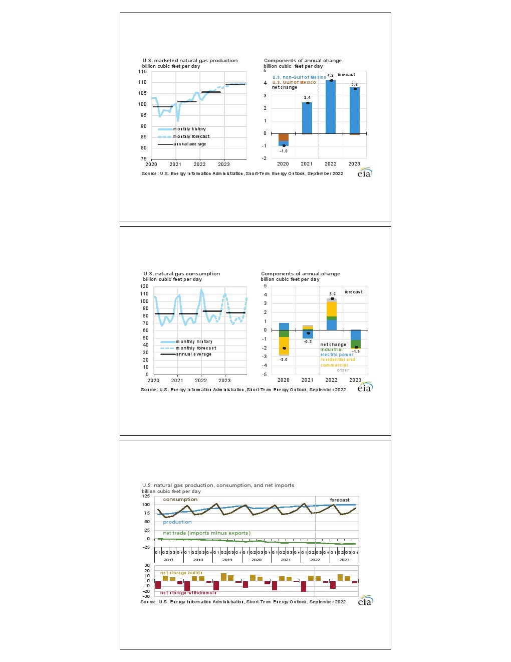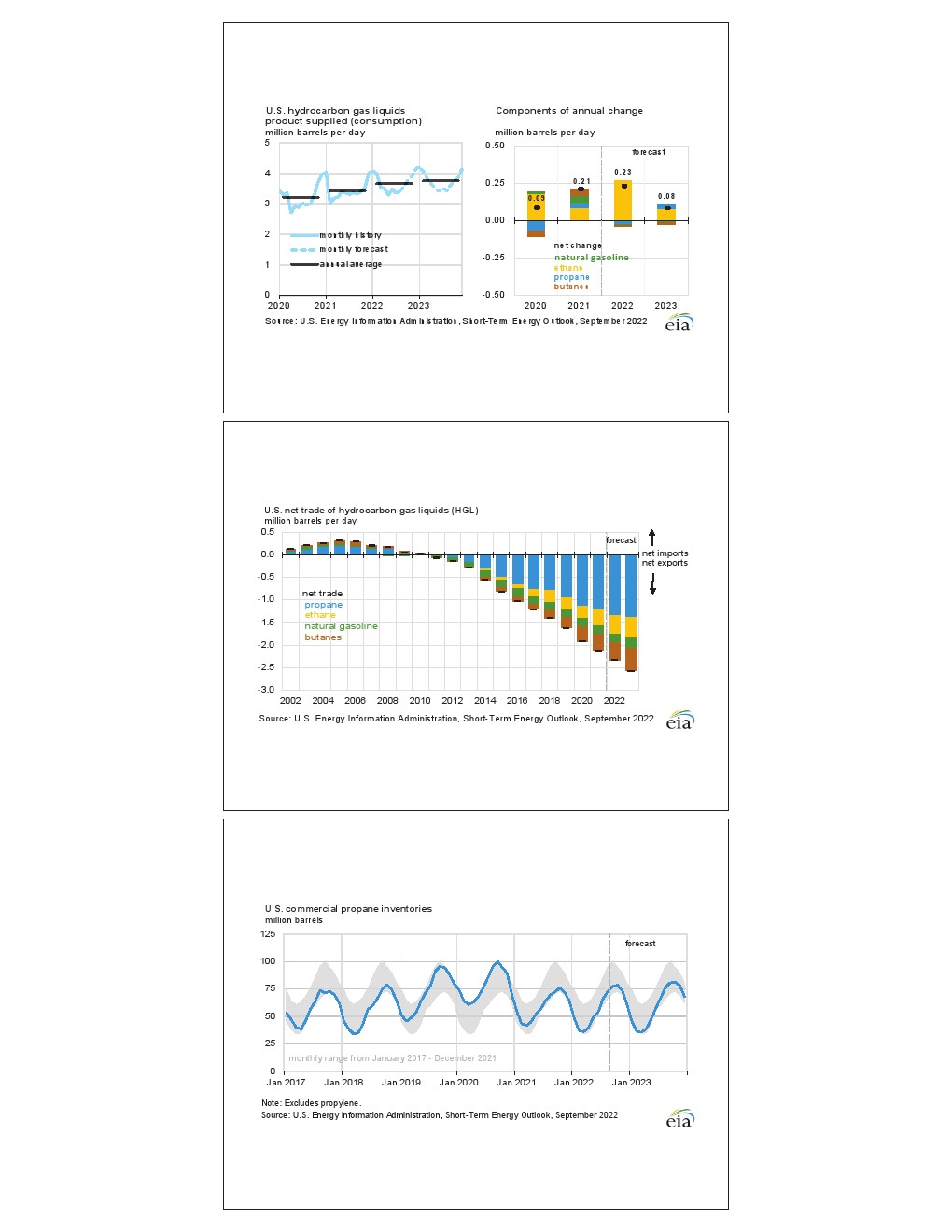 预计布伦特原油现货价格在2022年第四季度平均每桶为93美元,2023年平均每桶95美元。潜在的石油供应中断和原油产量增长慢于预期可能导致油价上涨,而经济增长可能低于预期导致价格下跌。