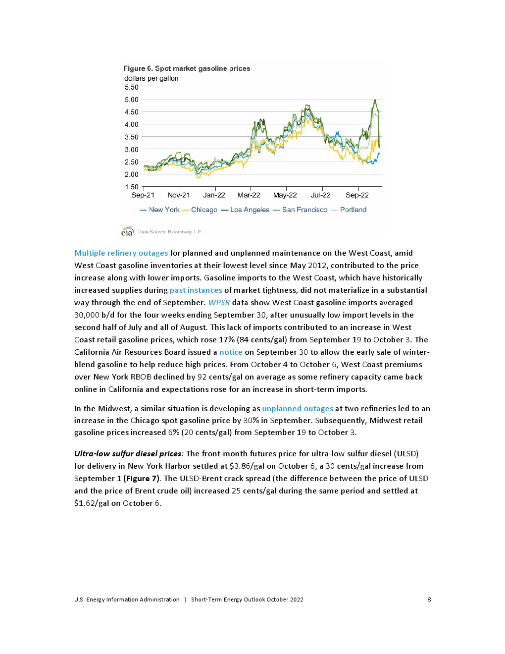 在预测中,美国零售汽油价格在2022年第四季度平均为3.8美元/加仑,2023年为3.57美元/加仑。柴油零售价格在2022年第四季度平均为4.86美元/加仑,2023年为4.29美元/加仑。