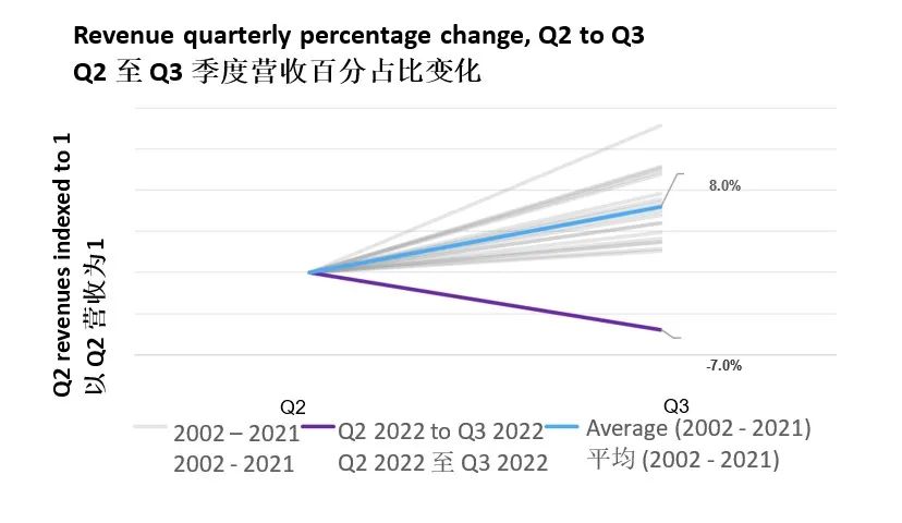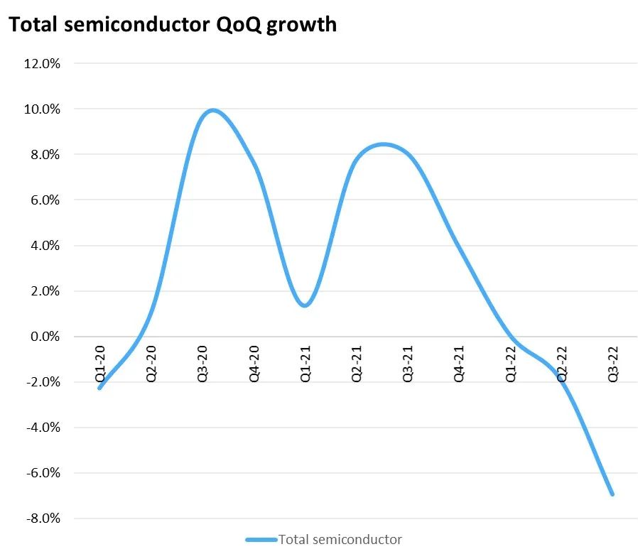 根据Omdia的半导体总体竞争分析工具(CLT),在2020年初开始的新冠疫情大流行期间,半导体市场出现了连续收入增长的特殊局面。在此期间创纪录地出现了连续八季度的收入增长。现在,市场在过去两个季度开始萎缩。2022年第三季度半导体收入为1470亿美元,比上一季度的1580亿美元下降7%。