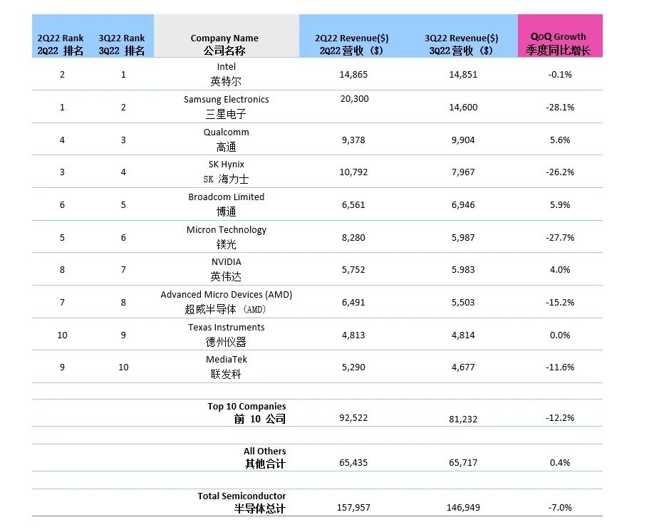 “市场的下降并不均匀,”高级研究分析师Cliff Leimbach如是说,“市场的不同部分在不同时期推动了疲软。2022年第二季度的下降是由个人电脑市场的疲软所致,英特尔下降了17%。最近的下降是由于内存市场的疲软导致。由于数据中心、个人电脑和移动需求下降,加上客户的库存调整,内存收入按季度(QoQ)下降了27%。”
