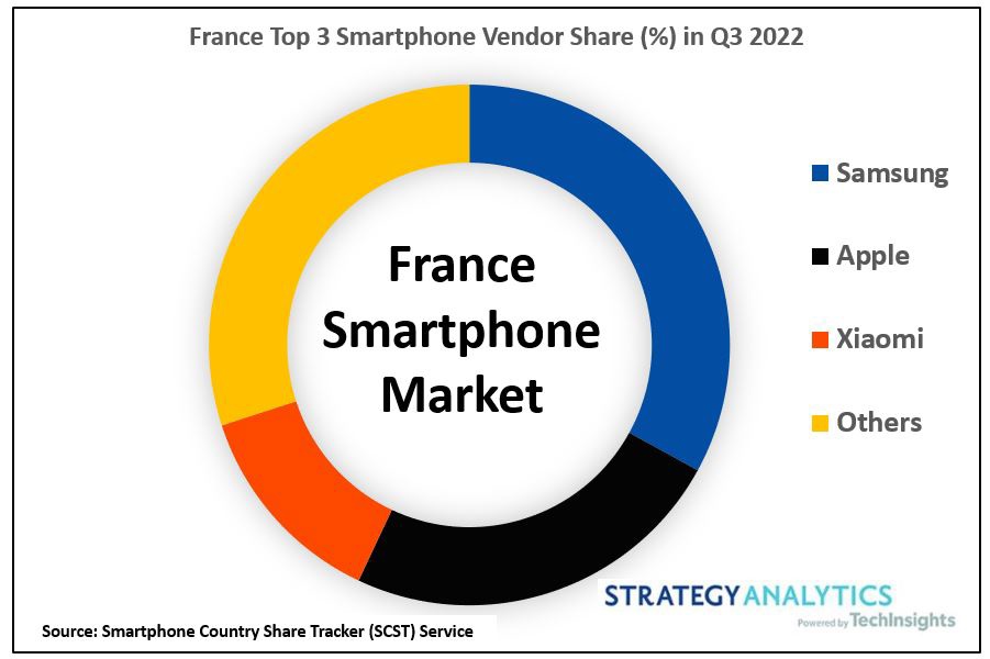 Strategy Analytics 机构报告,2022 年第三季度,法国市场的智能手机出货量年度和连续增长了 5%。这是该市场连续第二个季度的年度增长。它是西欧地区的第三大智能手机市场。