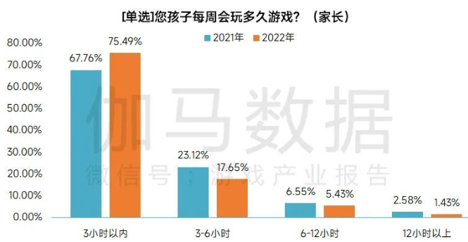 近日,中国音数协游戏工委、中国游戏产业研究院联合伽马数据共同发布了《2022中国游戏产业未成年人保护进展报告》。报告提到,2022年,我国19岁以下网民规模已达1.86亿人,占我国网民总数的17.6%。其中9岁及以上未成年人手机持有率达到了97.6%。在新规出台后,2022年超七成未成年人每周游戏时长在3小时以内,目前未成年人游戏沉迷问题已得到基本解决。