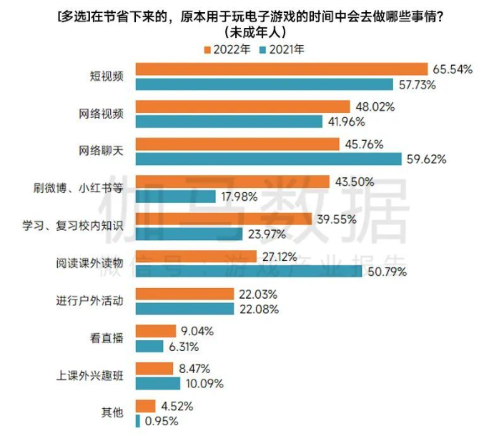 数据显示,2022年有75.49%的未成年人每周游戏时长在3小时以内,相较去年占比高出了7.73%。而原本未成年人的游戏时间受限后多转至社交媒体为主,其中65.54%的未成年会投入到短视频里。