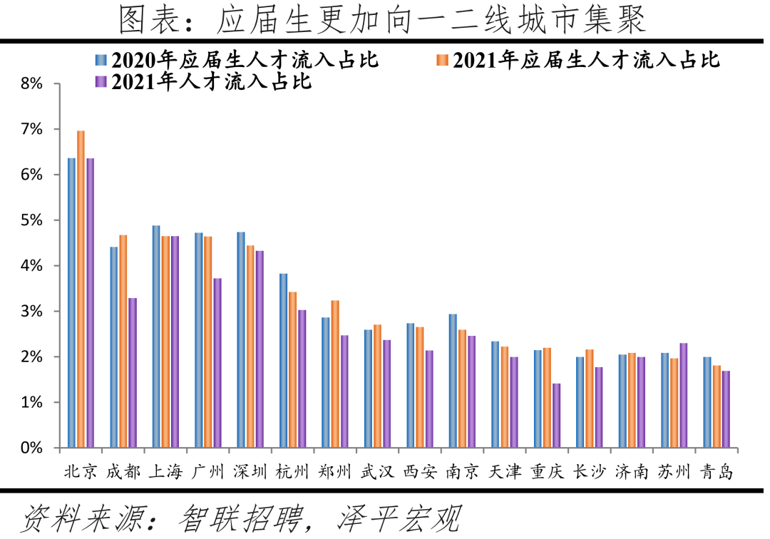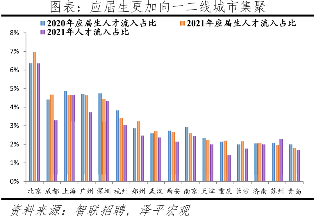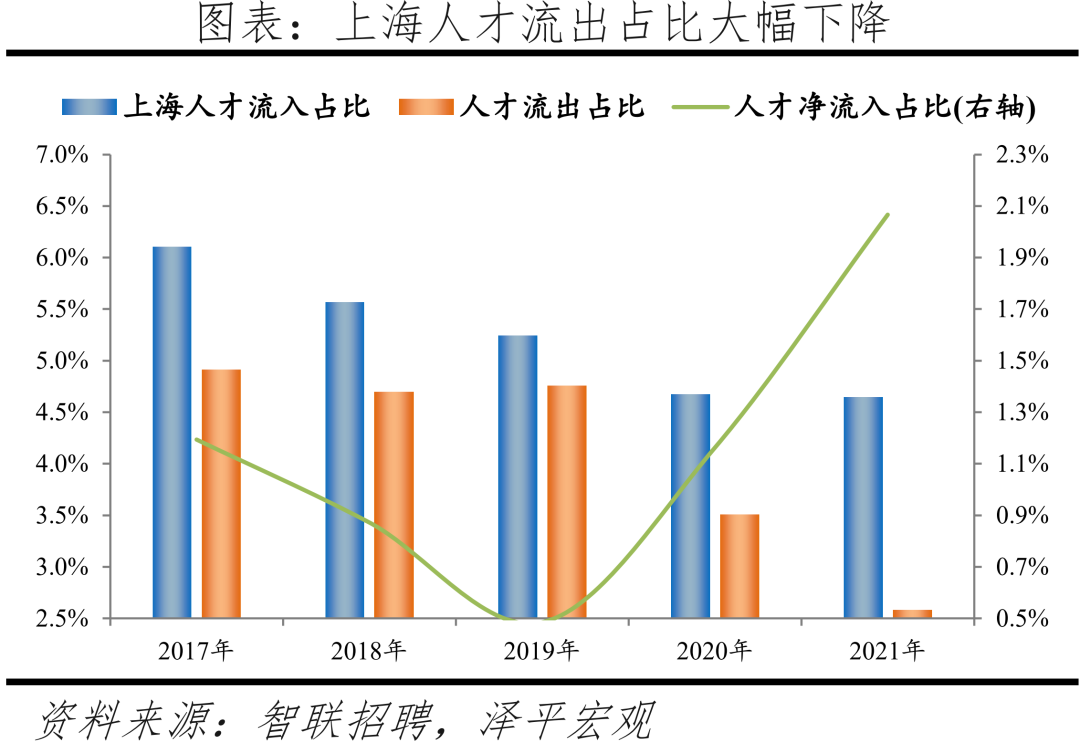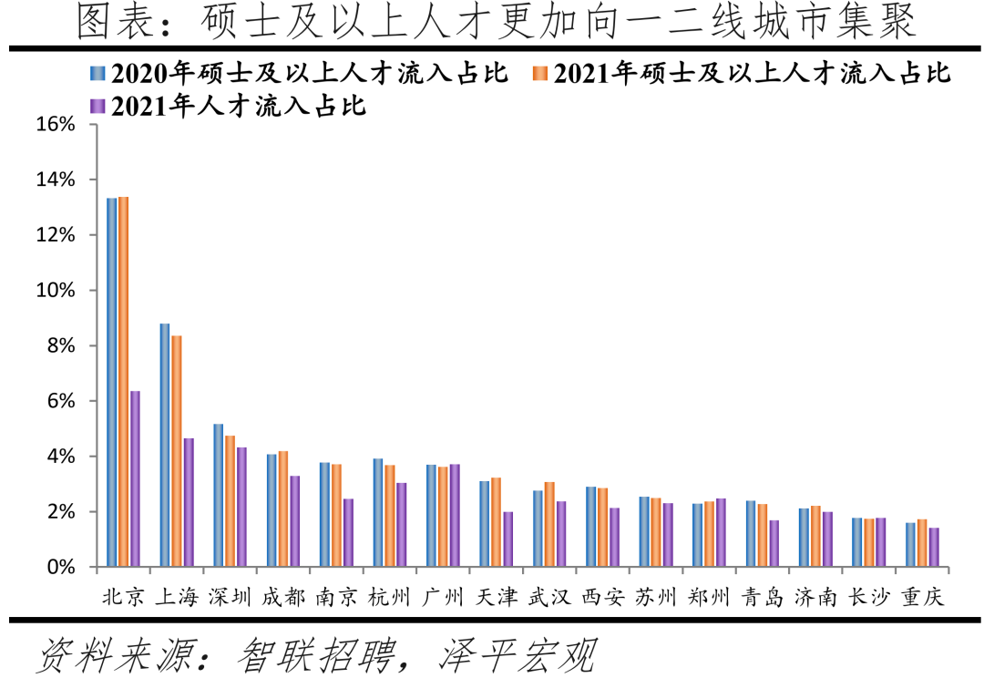 从来源看,2021年人才向上海流入的前十大城市合计占比38.8%,高于2020年的37.8%,上海人才来源集中度有所上升。其中,长三角城市有3个,合计占比10.5%,低于2020年的15%。人才流入上海主要因为上海的经济体量大、薪酬水平高,新经济促进政策初见成效且上海放宽人才引进政策。2021年上海GDP规模超4万亿、人均可支配收入8.2万元,均位列全国城市第一。根据上海市经济和信息化委员会数据,2021年上海的中国互联网百强企业数、企业互联网业务累计收入同比增速分别为20家和35%,居全国各省市第2位和第1位,“在线新经济”发展效果明显。2020年11月新版《留学回国人员申办上海常住户口实施细则》中取消留学生回国后首份工作地不在上海的限制并新增3个留学生激励政策;上海市2021年新版《上海市引进人才申办本市常住户口办法》将人才引进落户通道由16个增加到18个,落户通道明显放宽;在21年底放宽五大新城和自贸区的落户政策,本地应届研究生可直接落户。