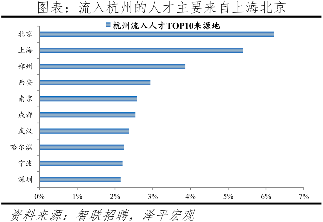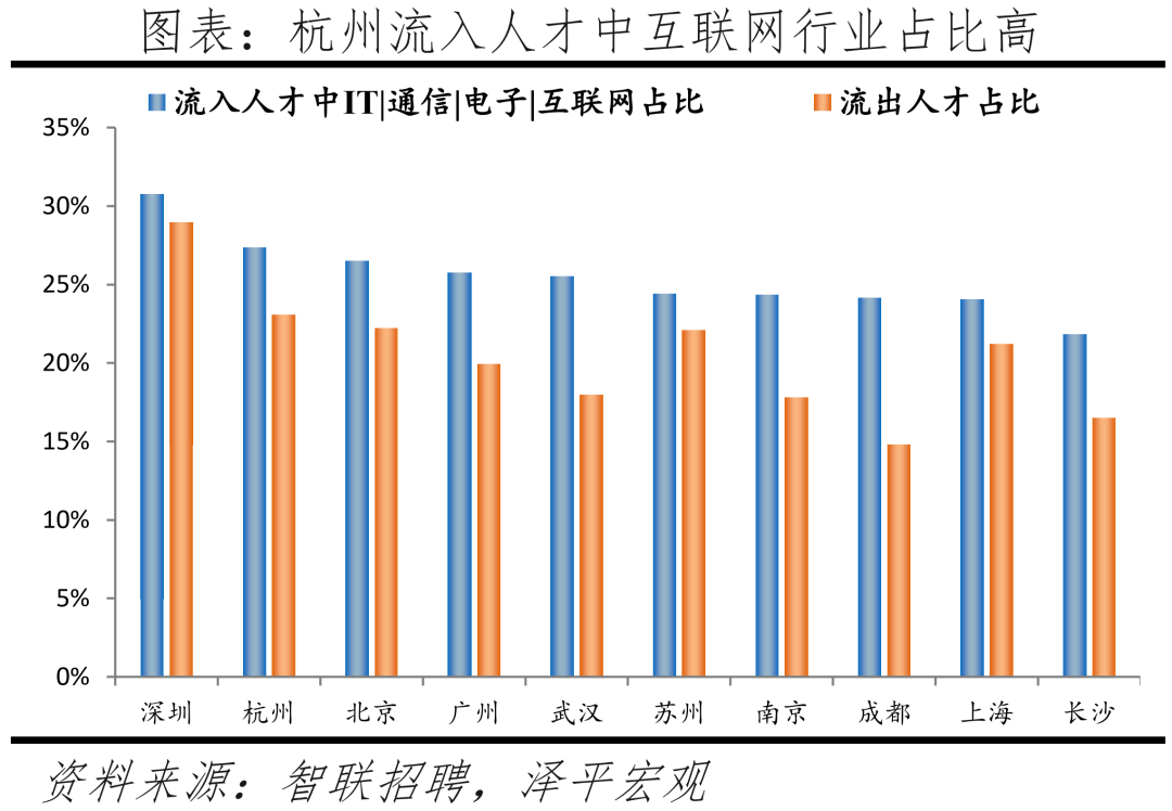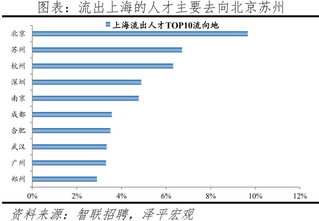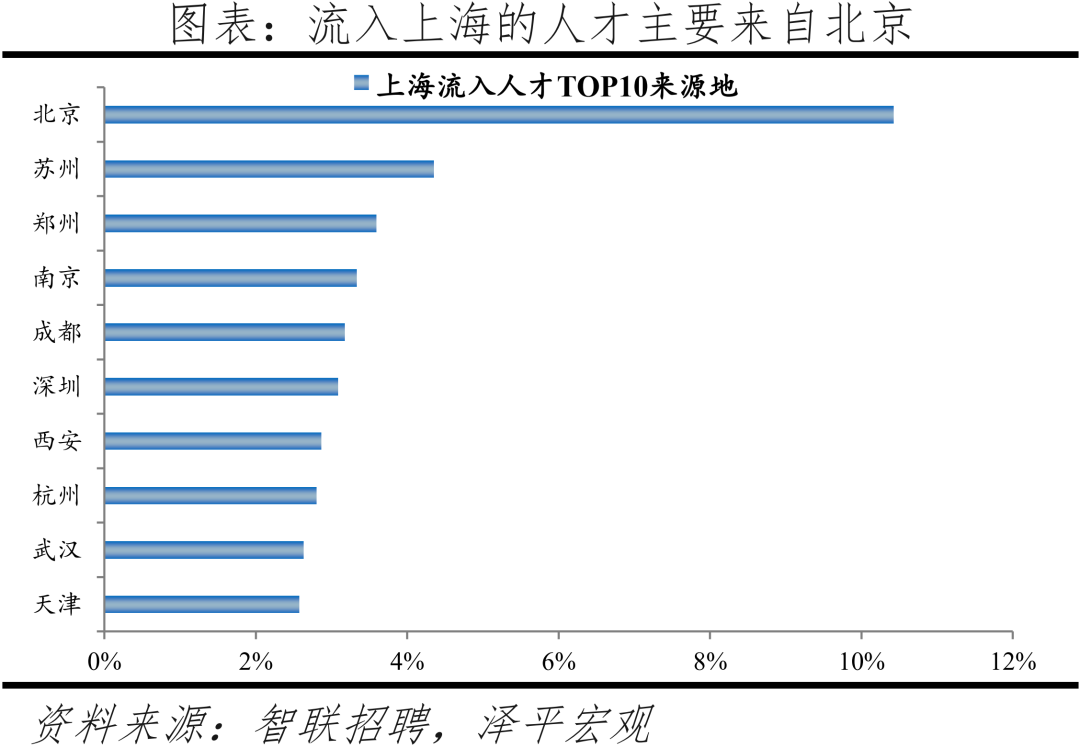 从来源看,2021年人才向上海流入的前十大城市合计占比38.8%,高于2020年的37.8%,上海人才来源集中度有所上升。其中,长三角城市有3个,合计占比10.5%,低于2020年的15%。人才流入上海主要因为上海的经济体量大、薪酬水平高,新经济促进政策初见成效且上海放宽人才引进政策。2021年上海GDP规模超4万亿、人均可支配收入8.2万元,均位列全国城市第一。根据上海市经济和信息化委员会数据,2021年上海的中国互联网百强企业数、企业互联网业务累计收入同比增速分别为20家和35%,居全国各省市第2位和第1位,“在线新经济”发展效果明显。2020年11月新版《留学回国人员申办上海常住户口实施细则》中取消留学生回国后首份工作地不在上海的限制并新增3个留学生激励政策;上海市2021年新版《上海市引进人才申办本市常住户口办法》将人才引进落户通道由16个增加到18个,落户通道明显放宽;在21年底放宽五大新城和自贸区的落户政策,本地应届研究生可直接落户。