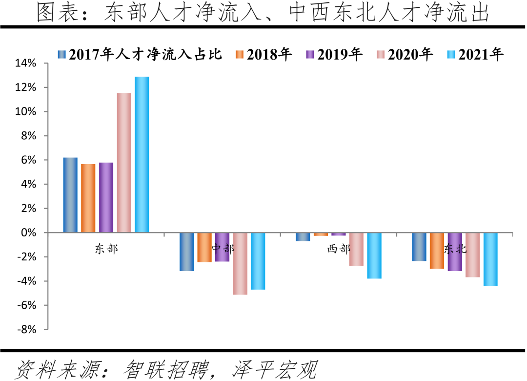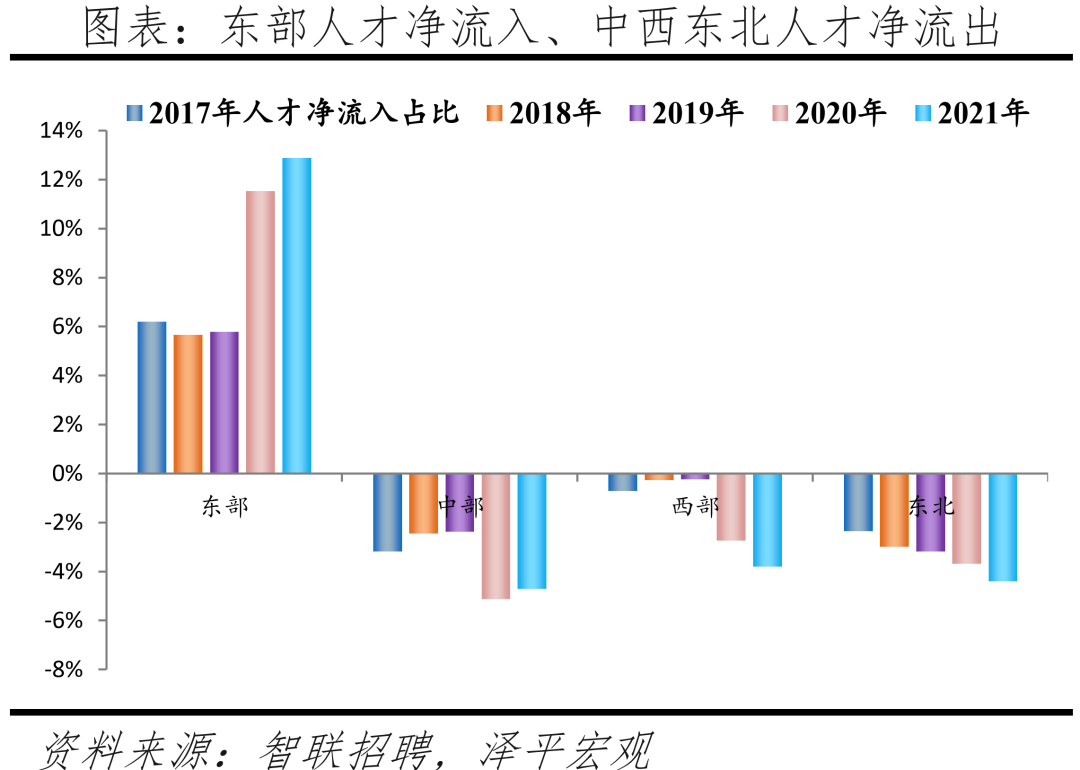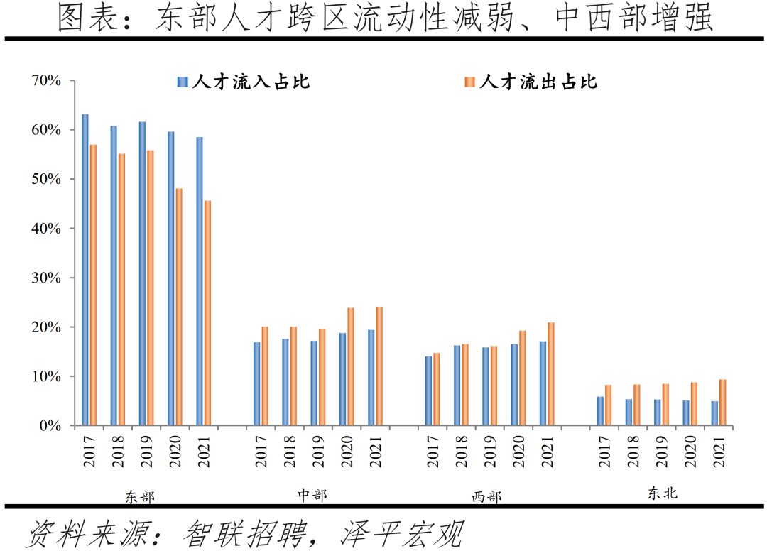 1)分地区看,2021年东部人才跨区流动性继续下降,中西部地区人才流动性增强,人才加速洗牌;东部、中部、西部、东北人才净流入占比分别为12.9%、-4.7%、-3.8%、-4.4%,东部人才持续集聚,中部、西部、东北持续净流出。从人才流入流出占比看,2017-2021年东部地区人才流入占比从63.2%降至58.5%,人才流出占比从57%降至45.6%,东部地区人才流动性下降,但全国仍有近6成人才向东部流入;中部和西部地区人才流入占比和流出占比均呈上升趋势,人才流动性提升;2017-2021年东北地区人才流入占比从5.9%降至5%,人才流出占比从8.2%增至9.3%,人才流动性保持稳定。从人才净流入占比看,2017-2021年东部地区人才净流入占比从6.2%增至12.9%,人才持续向东部集聚,得益于雄厚的经济基础和较高的战略定位;中部地区人才持续净流出,且2021年净流出占比略有下降;西部和东北地区人才持续净流出,且2021年净流出占比加大。