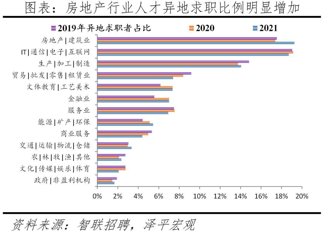 5)从行业看,2021年流动人才中52%分布在IT互联网、房地产、制造业,房地产行业人才异地求职比例明显增高。2021年求职人才最多的前三行业是IT|通信|电子|互联网、房地产|建筑业、生产|加工|制造,分别占比19.5%、16.1%、13.9%,合计占比49.5%;流动人才最多的前三行业也是上述三个行业,分别占比18.7%、19.3%、14.1%,合计占比52%,说明流动人才分布更加集中,且流动人才在房地产|建筑业的分布远高于所有求职人才。
