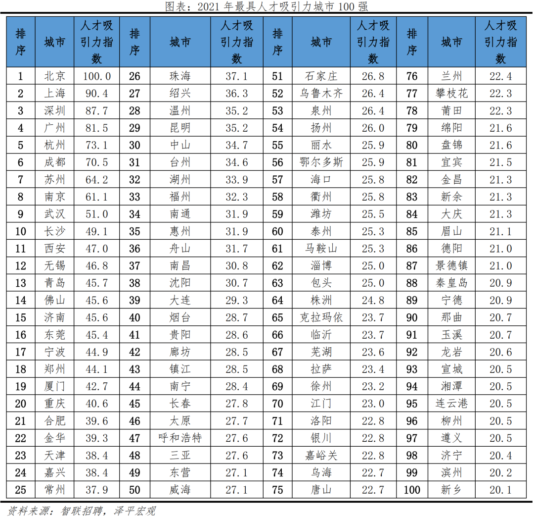 2.1 中国最具人才吸引力城市TOP100:京沪深居前三,百强中东部城市占比超五成