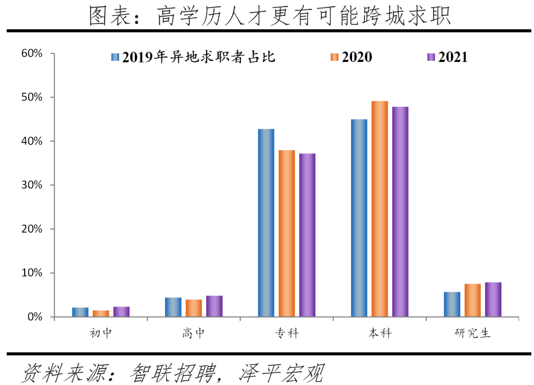 3)从学历看,2021年流动人才中56%为本科及以上学历,高于求职总体的47%,高学历人才更有可能跨城求职。2021年求职人才中初中及以下、高中、专科、本科、研究生学历占比分别3.6%、7%、42.1%、41.8%、5.6%,其中流动人才各学历分别占比2.3%、4.8%、37.2%、47.8%、7.8%,流动人才中本科、研究生学历比重均高于整体水平,2021年流动人才中本科及以上学历占比55.7%,较求职总体高8.3个百分点。2019-2021年流动人才中本科及以上学历占比分别为50.7%、56.7%、55.7%,流动人才学历占比逐渐恢复至2019年的水平。