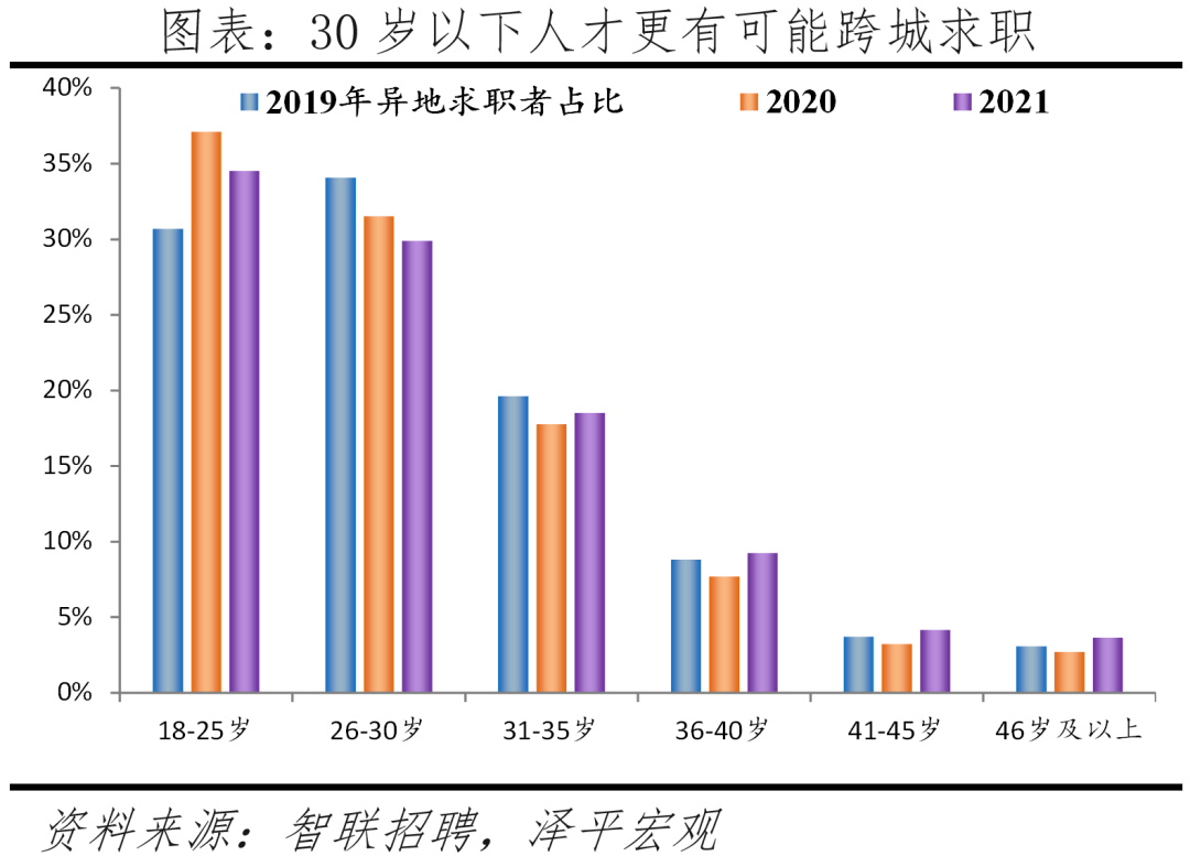 2)从年龄看,2021年流动人才中18-30岁人才占比64.4%,高于求职总体的59.4%,30岁以下人才更有可能跨城求职。2021年流动人才中18-25岁、26-30岁、31-35岁、36-40岁、41-45岁、46岁及以上分别占比34.5%、29.9%、18.5%、9.2%、4.2%、3.7%,各年龄段分别较求职总体高4.8、0.3、-2.8、-1.4、-0.6、-0.3个百分点,说明30岁以下人才更有可能跨城求职。2019-2021年流动人才中30岁以下占比分别为64.8%、68.6%、64.4%,各年龄段流动人才占比逐渐恢复至2019年水平。