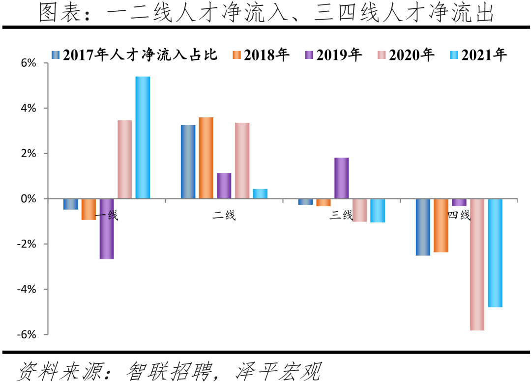 2)分线看,2021年一线城市人才跨区流动性下降,三四线城市人才流动性增强,一线、二线、三线、四线人才净流入占比分别为5.4%、0.4%、-1.0%、-4.8%,受政策放宽影响一线人才持续流入,二线人才集聚放缓、三线较为平衡,四线持续流出。从人才流入流出看,2017-2021年一线人才流入从22.8%降至19%、流出占比从23.3%降至13.6%,流出占比降幅远大于流入占比;二线人才流入占比下降、流出占比增加;三四线城市流入流出占比均有所增加,且流出占比增幅大于流入占比。从人才净流入占比看,2017-2021年一线城市人才净流入占比分别为-0.5%、-0.9%、-2.7%、3.5%、5.4%,受政策放宽影响2020年开始人才净流入占比由负转正,且2021年继续增加;二线城市分别为3.2%、3.6%、1.1%、3.4%、0.4%,主要受人才流出占比增加影响;三线城市分别为-0.3%、-0.3%、1.8%、-1.0%、-1.0%,人才持续净流出;四线城市分别为-2.5%、-2.3%、-0.3%、-5.8%、-4.8%,人才持续流出,2021年净流出占比略有下降。