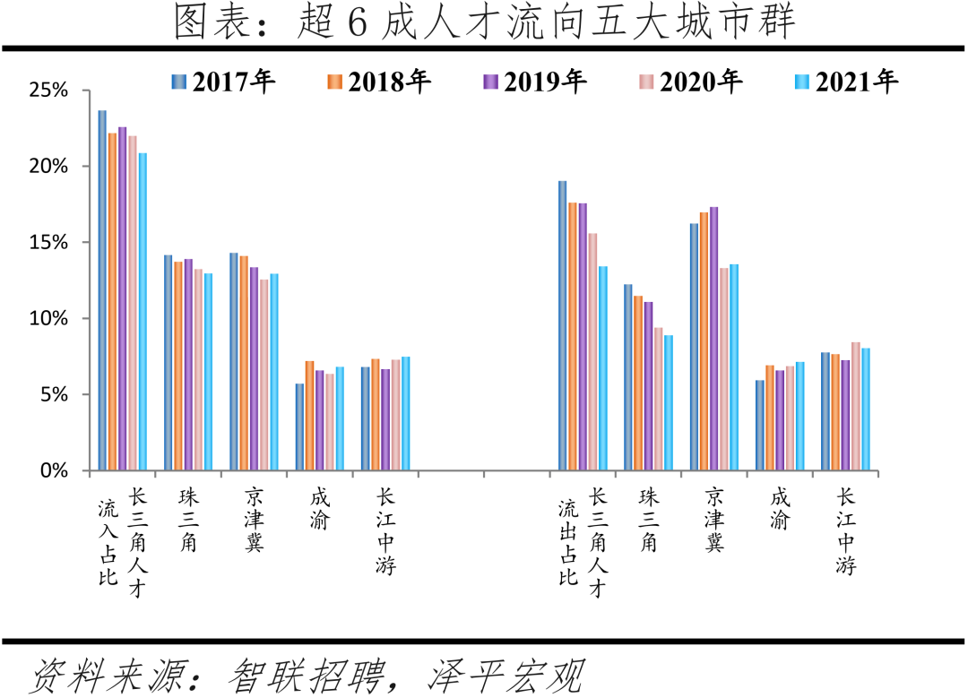 3)分城市群看,超6成人才流向五大城市群,长三角、珠三角、京津冀城市群人才流动性下降,成渝、长江中游城市群人才流动性小幅增加;2021年长三角、珠三角人才持续集聚,京津冀人才净流出趋势继续放缓,成渝基本平衡,长江中游人才持续净流出。从人才流入流出看,长三角人才流入占比从23.7%降至20.9%,人才流出占比从19%降至13.4%;珠三角人才流入占比小幅下降,流出占比从12.2%降至8.9%;京津冀人才流入流出占比均呈下降趋势,2021年小幅上升;成渝和长江中游人才流入占比和人才流出占比较为稳定。2021年五大城市群人才跨区流动性下降,2017-2021年五大城市群合计人才流入占比从64.7%降至61%,人才流出占比从60.7%降至51%。从人才净流入占比看,2017-2021年长三角人才净流入占比从4.6%增至7.4%,人才净流入且占比高于其他城市群,人才大量向长三角集聚;珠三角从2.0%增至4.1%,人才净流入且逐年上升;京津冀分别为-1.9%、-2.9%、-4.0%、-0.7%, 人才保持净流出但占比有所缩小,北京人才净流入占比增加带动京津冀整体净流出占比下降;成渝人才流入流出基本平衡;长江中游人才呈净流出,2021年由于流出人才占比下降,净流出占比略有下降。