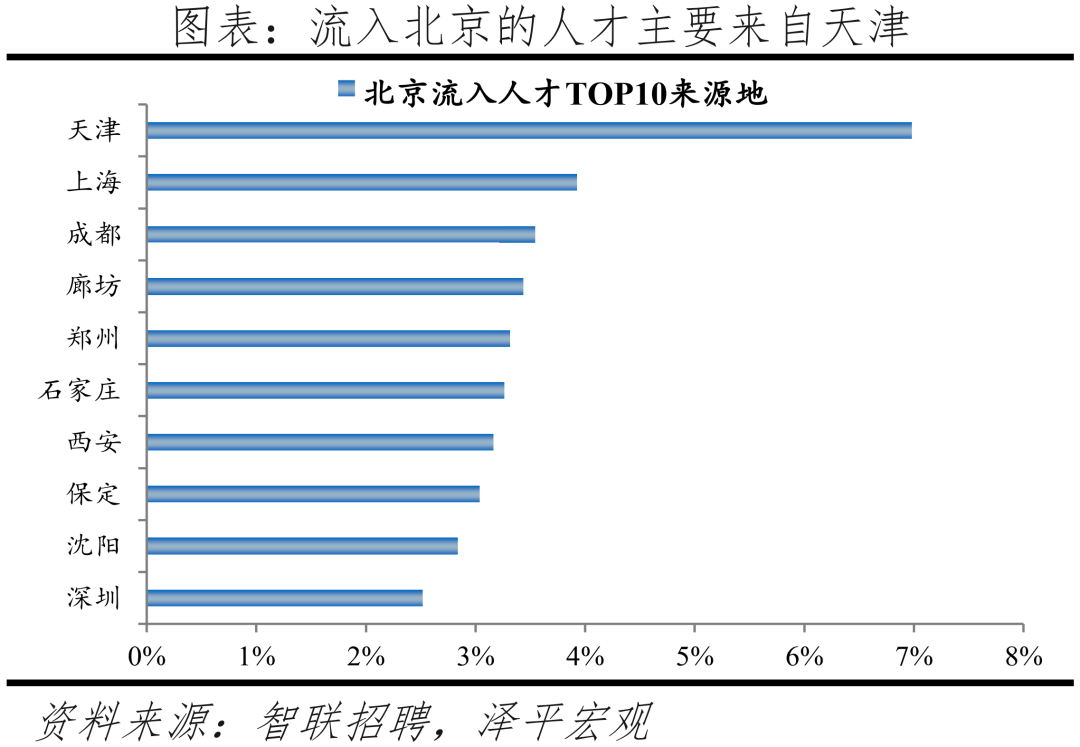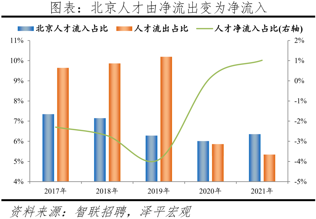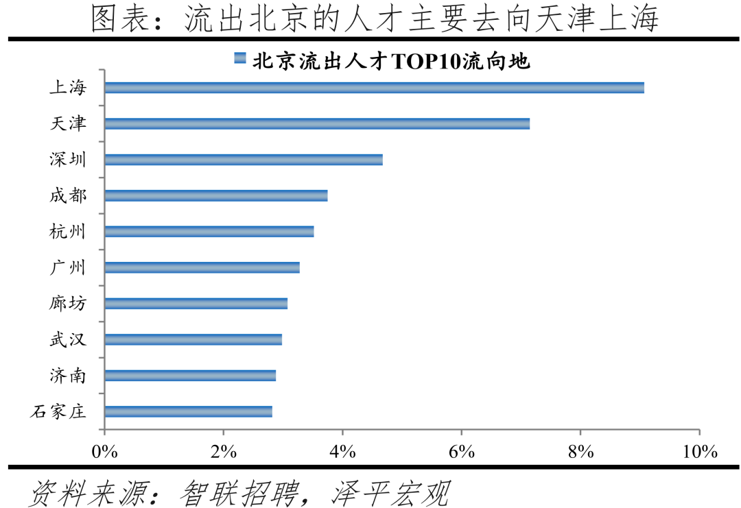 从去向看,北京人才外流的前十大城市合计占比43.2%,高于2020年的42.8%。其中,流出北京的人才中9.1%流向上海,流出上海的人才中9.7%流向北京,北京和上海互为人才外流目标城市的第1位,北京流向上海和上海流向北京的人才在全国流动人才总量中占比分别为0.5%、0.2%,人才从北京净流向上海。北京持续疏解非首都核心功能,与津冀对接协同产业。根据北京市发改委,截至2020年底,全市不予办理新设立或变更登记业务累计达2.34万件,全市累计退出一般制造和污染企业2872家,疏解提升区域性批发市场和物流中心980余个。北京周边城市群人才承接能力则较弱,人才从北京流出的前十城市中津冀城市有3个,仅占13%,低于20年的14.5%。