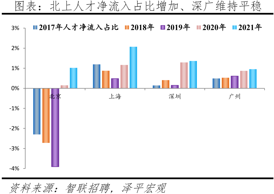 从人才净流入占比看,2021年北上深广人才净流入占比分别为1.0%、2.1%、1.4%、0.95%,上海最高、广州最低。从人才净流入占比变动趋势看,北京因严控人口、疏解产业,人才净流入占比逐年下降,直至2020年有所回升,2021年继续创新高,主因2021年人才引进政策放宽;上海人才净流入占比变动呈“V”型,2021年人才净流入占比为2.1%,重回榜首且创近五年新高,主因上海新经济促进政策初见成效且落户政策放宽;深圳、广州2021年人才净流入较去年基本维持不变。