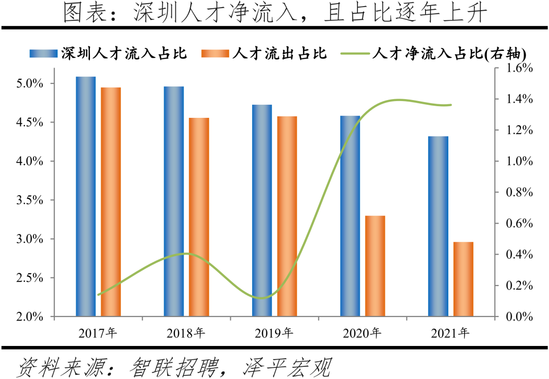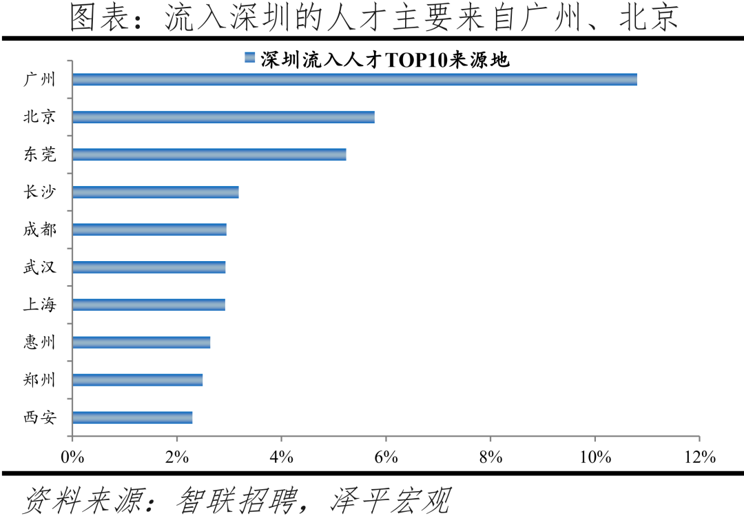 从来源看,人才向深圳流入的前十大城市合计占比41.2%,低于2020年前十来源地的43%,深圳的人才来源集中度有所下降。其中,珠三角城市有3个,合计占比18.7%;流入深圳的人才中10.8%来自广州,流入广州的人才中9.8%来自深圳,深圳和广州互为人才来源城市的第1位。人才流入深圳主要因为经济发展速度相对较快、创新发展水平高。2016-2021年深圳年均GDP增速为9.5%,高于北京、上海、广州9.4%、8.9%、7.6%,也高于全国的8.3%。深圳还拥有华为、腾讯、平安等众多著名企业,尤其是互联网企业,吸引大量人才。根据《深圳市国土空间总体规划(2020-2035年)》(草案),2035年深圳常住人口或将控制在1900万,七普数据公布后深圳也开始控制人口有序增长。2021年5月《深圳市户籍迁入若干规定(征求意见稿)》中将核准类的学历型人才底线从全日制大专调整为全日制本科,同时收紧落户年龄。根据深圳人社局数据,2021年深圳新引进人才22.9万人,较19年减少18.2%。
