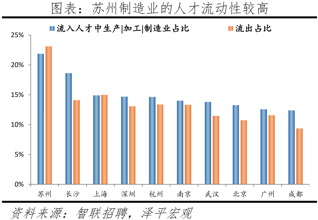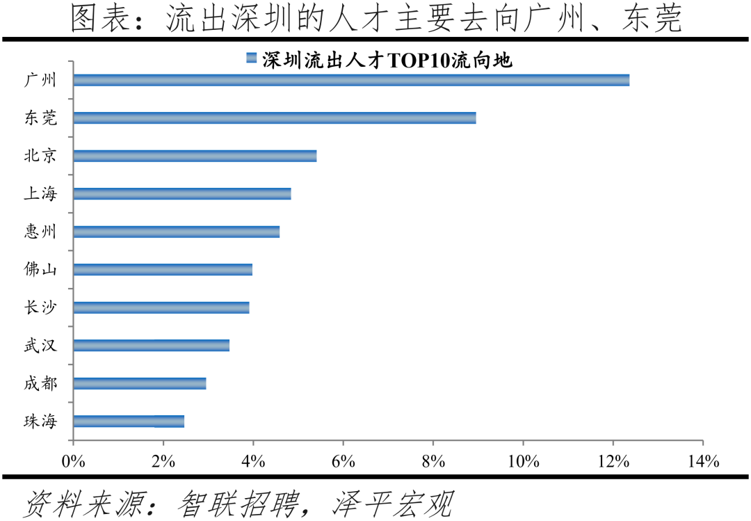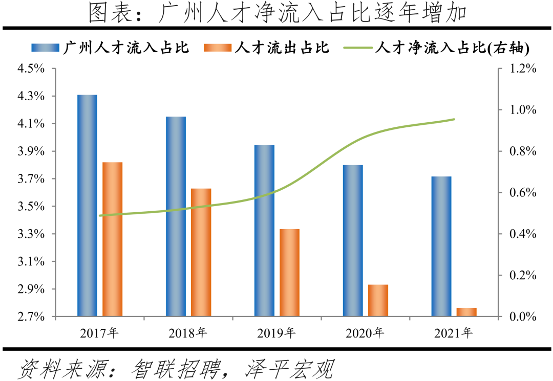 3)深圳:2017-2021年人才净流入占比分别为0.1%、0.4%、0.2%、1.3%、1.4%,近两年人才集聚明显,主因深圳经济发展速度快、创新发展水平高,引才留才能力强,由于深圳人口承载力有限,近年深圳也开始控制人口有序增长;深圳和广州互为人才外流目标城市的第1位,人才从广州净流向深圳。从人才流入流出占比看,2017-2021年深圳人才流入占比从5.1%降至4.3%,人才流出占比从4.9%降至3.0%,人才跨区流动性下降。由于流入流出占比降幅相当,近两年人才净流入占比保持平稳,2020、2021年人才净流入占比分别为1.3%、1.4%。