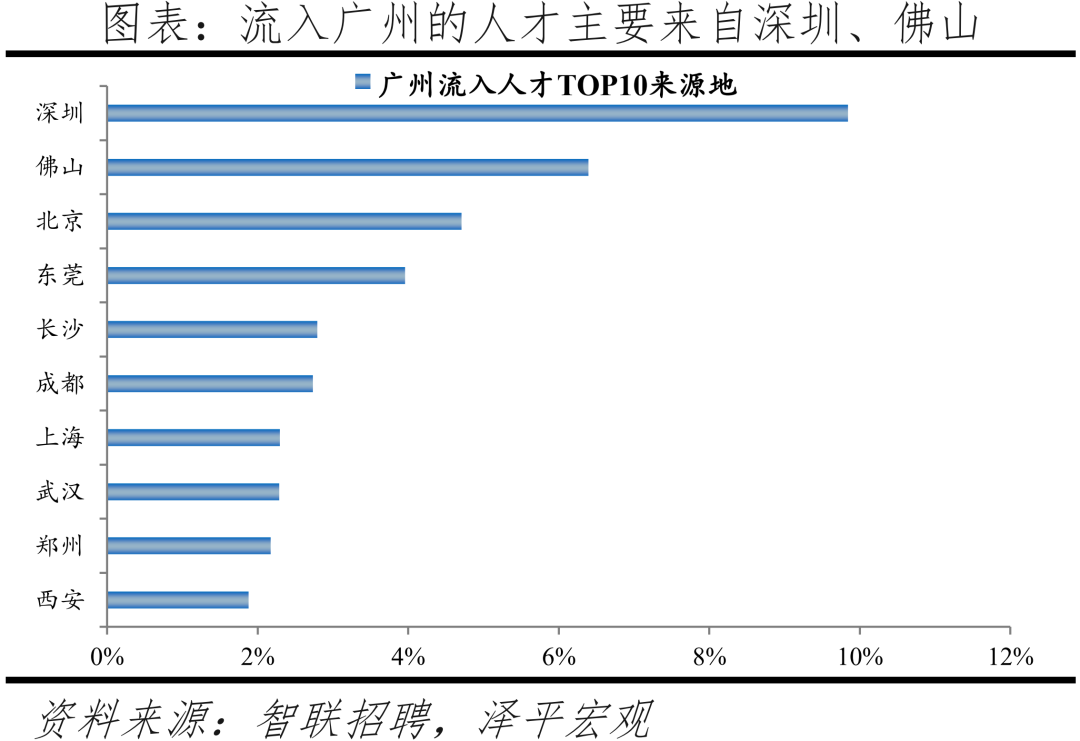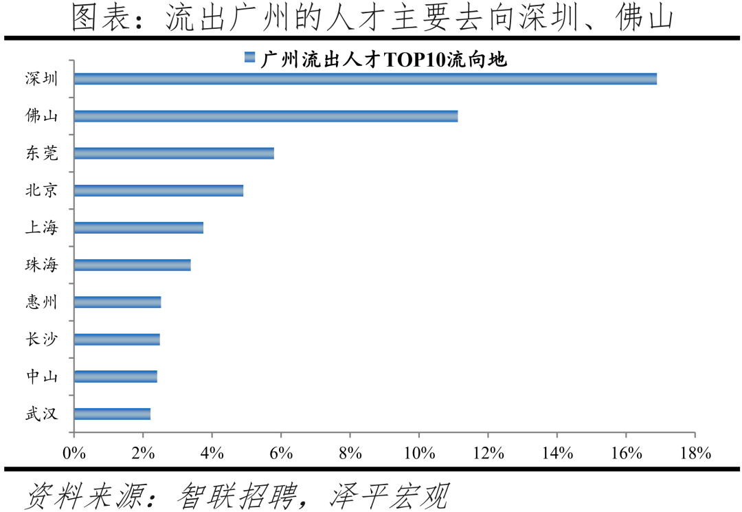 从去向看,广州人才外流的前十大城市合计占比55.5%,低于2020年的58.2%。其中珠三角城市有6个,合计占比42.1%。与之相比,北京流出人才中13%流向京津冀城市群,上海流出人才中17.8%流向长三角城市群,深圳流出人才中32.4%流向珠三角城市群。广州人才流向珠三角城市群城市的比重明显更高。一方面是因为珠三角多为粤语城市、文化相近,另一方面是广州高校数量较多,广东省人才为求学向广州集聚,毕业后从广州回流至省内其他城市。根据教育部数据,广州普通高校数、211高校数分别为37、6所,分别排名第5、6名;根据国家统计局数据,2020年广州普通本专科在校生人数为130.7万人、位列全国第一。